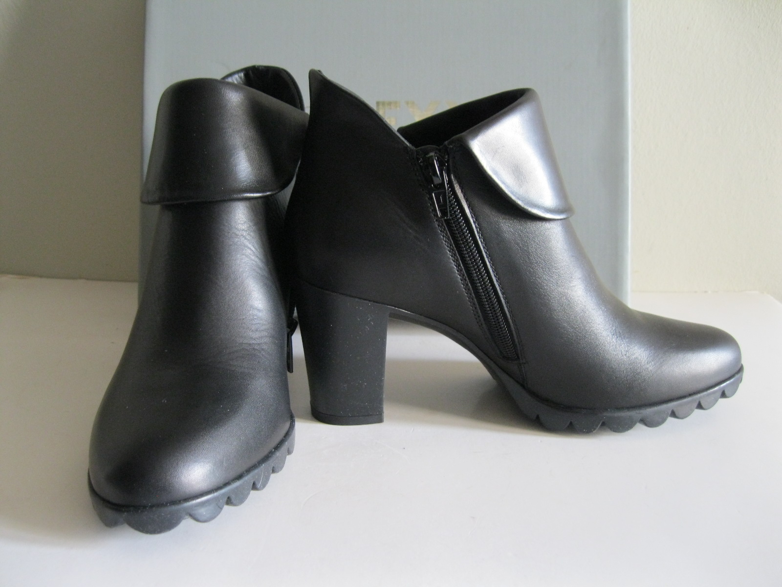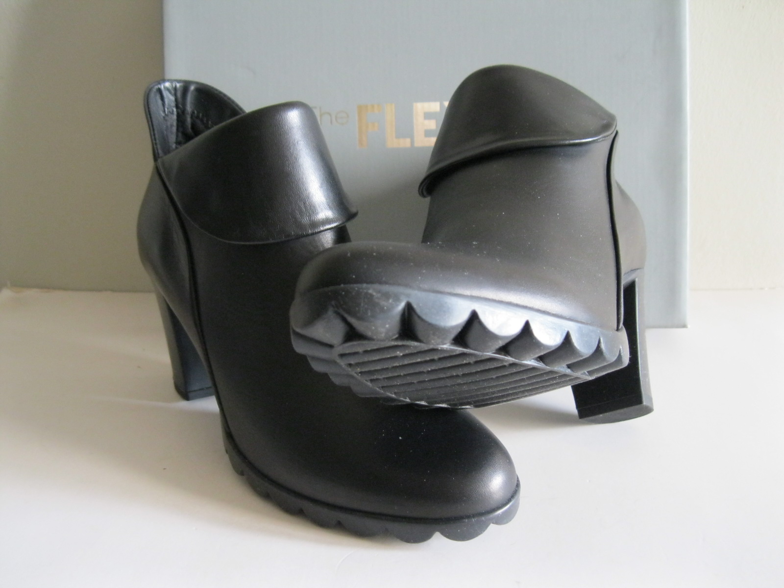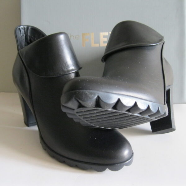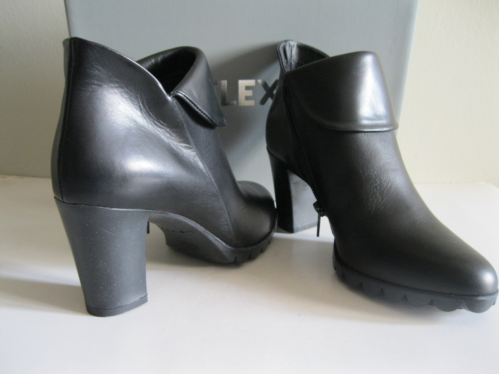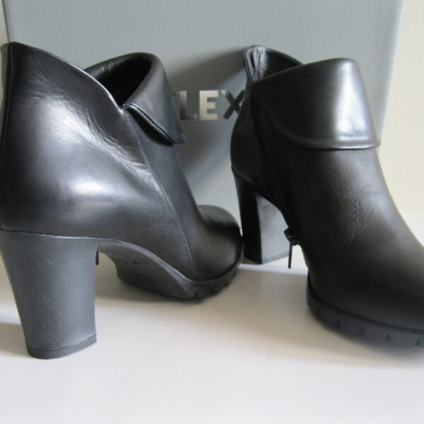 Oryginalne, czarne, bardzo ładne, praktyczne, eleganckie, wygodne botki damskie, na obcasie The FLEXX. Wykonane z naturalnej skóry, wewnątrz ocieplane, zapinane na zamek. Wyściełane wewnątrz miękką wkładką z naturalnej skóry, dodatkowo dobrze wyprofilowane pod stopę. Rozmiar 38 i dokładnie tak wypada, długość wkładki 24,5 cm. Wysokość obcasa mierzona od tyłu 7,6 cm. podeszwa przeciwpoślizgowa. Idealne na normalną, kształtną stopę. Botki nowe, w oryginalnym kartoniku. Polecam !