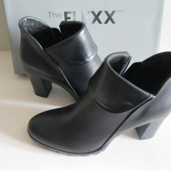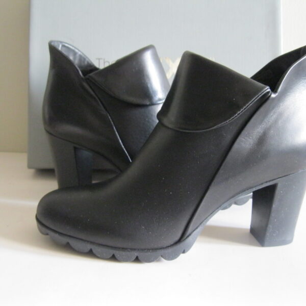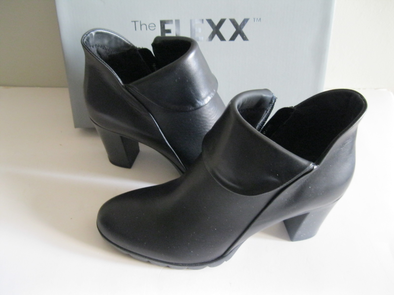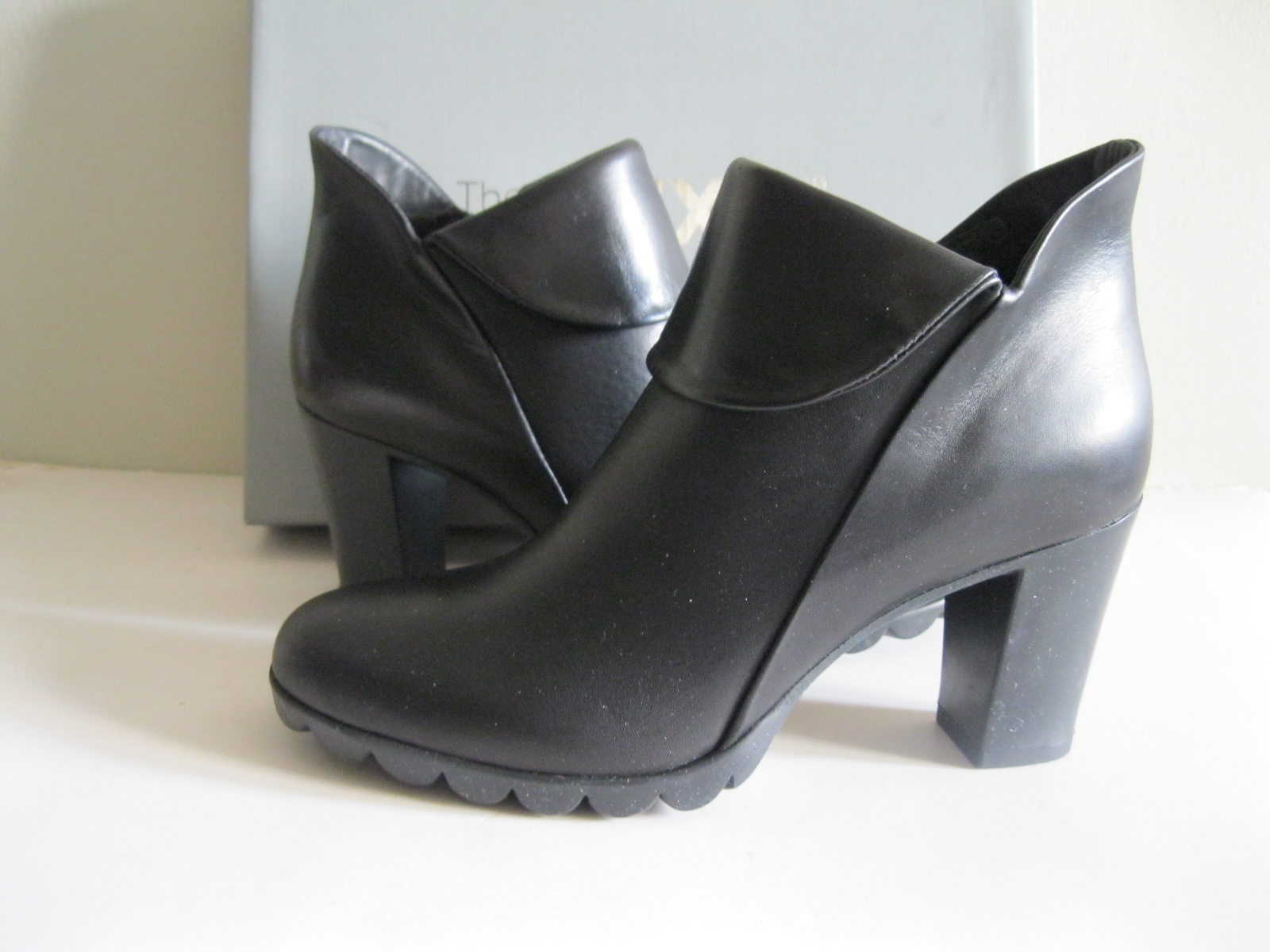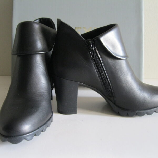 Oryginalne, czarne, bardzo ładne, praktyczne, eleganckie, wygodne botki damskie, na obcasie The FLEXX. Wykonane z naturalnej skóry, wewnątrz ocieplane, zapinane na zamek. Wyściełane wewnątrz miękką wkładką z naturalnej skóry, dodatkowo dobrze wyprofilowane pod stopę. Rozmiar 38 i dokładnie tak wypada, długość wkładki 24,5 cm. Wysokość obcasa mierzona od tyłu 7,6 cm. podeszwa przeciwpoślizgowa. Idealne na normalną, kształtną stopę. Botki nowe, w oryginalnym kartoniku. Polecam !
