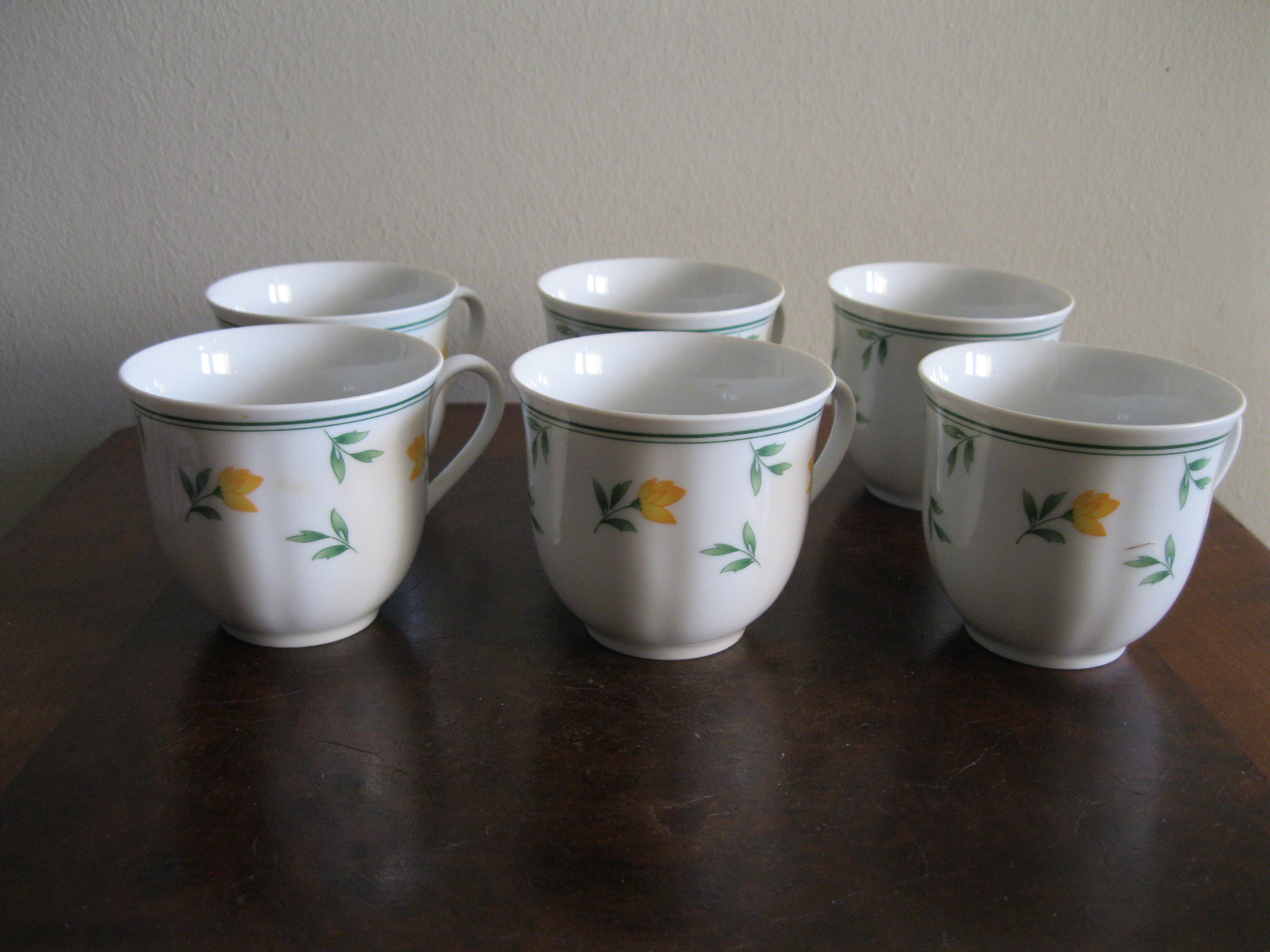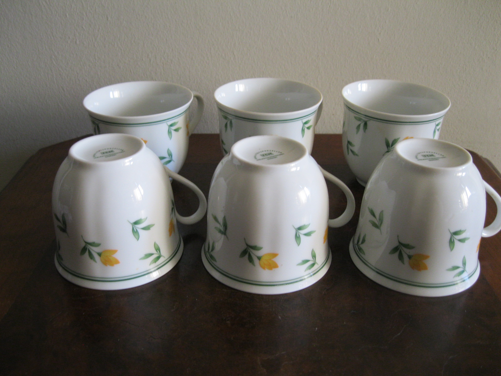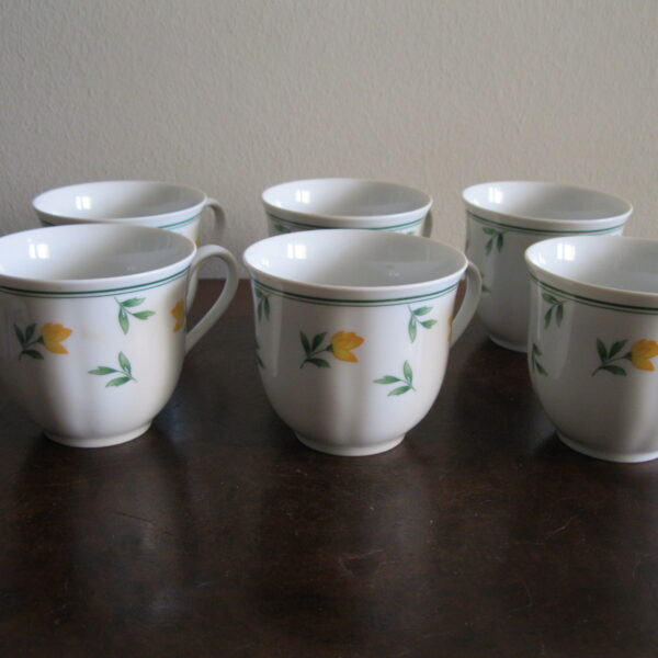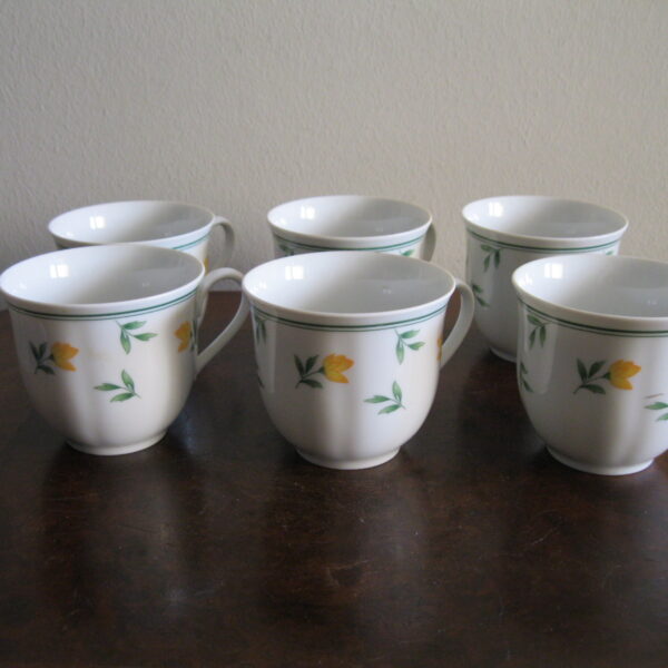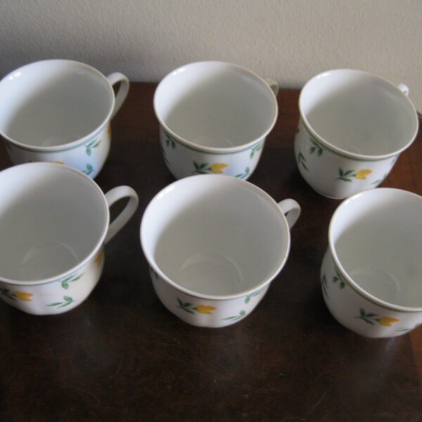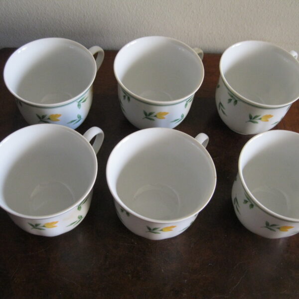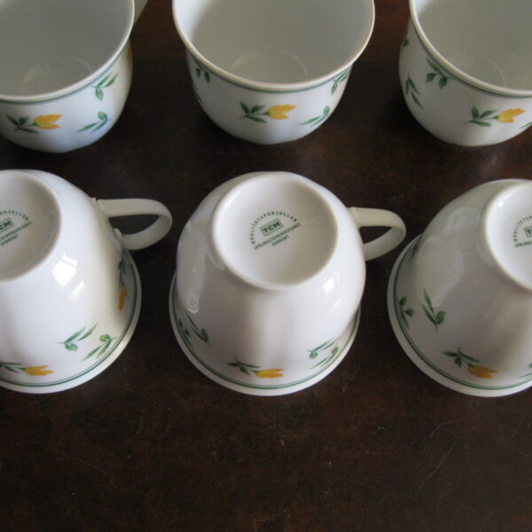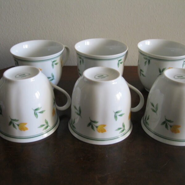 Oryginalny, komplet, starych, niemieckich, kształtnych, pojemnych filiżanek z lat 70 tych.. Wykonany z dobrej jakości, delikatnej, prześwitującej , porcelany w białym kolorze, zdobiony subtelnym, reliefowym tłoczeniem, roślinnym wzorem w żółte kwiaty. Filiżanki nie posiadają podstawków. Zachowany w stanie bardzo dobrym, całe bez uszkodzeń bez śladów użytkowych. Komplet sygnowany. Polecam !