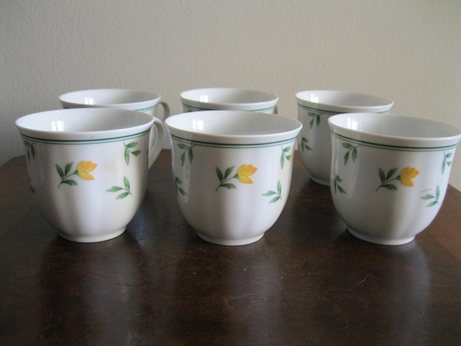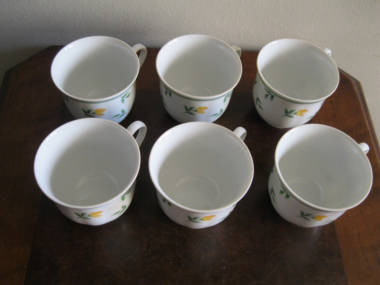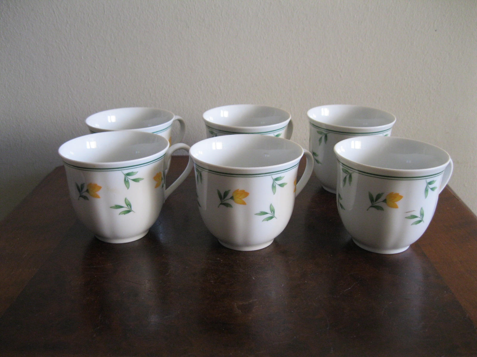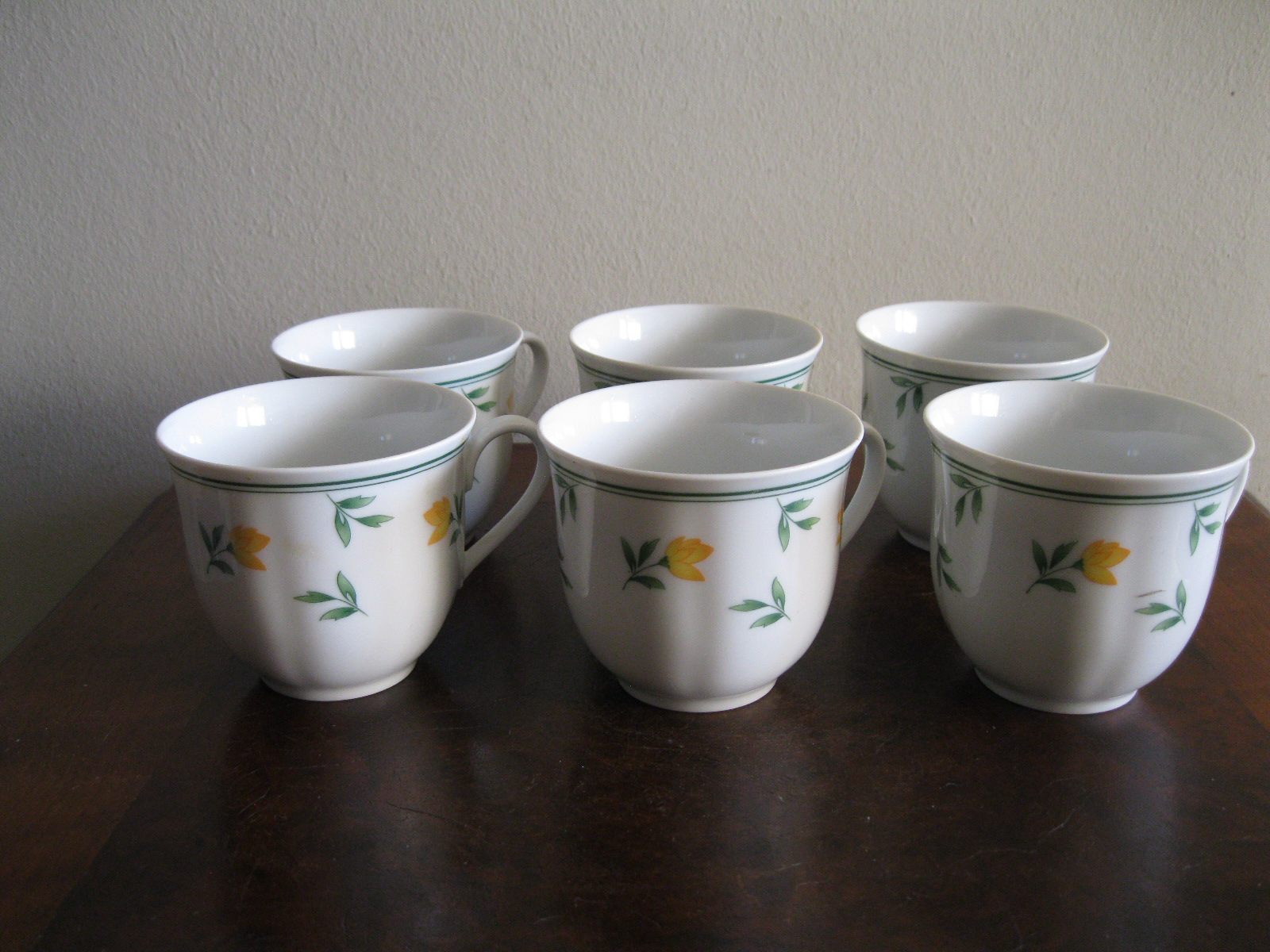 Oryginalny, komplet, starych, niemieckich, kształtnych, pojemnych filiżanek z lat 70 tych.. Wykonany z dobrej jakości, delikatnej, prześwitującej , porcelany w białym kolorze, zdobiony subtelnym, reliefowym tłoczeniem, roślinnym wzorem w żółte kwiaty. Filiżanki nie posiadają podstawków. Zachowany w stanie bardzo dobrym, całe bez uszkodzeń bez śladów użytkowych. Komplet sygnowany. Polecam !