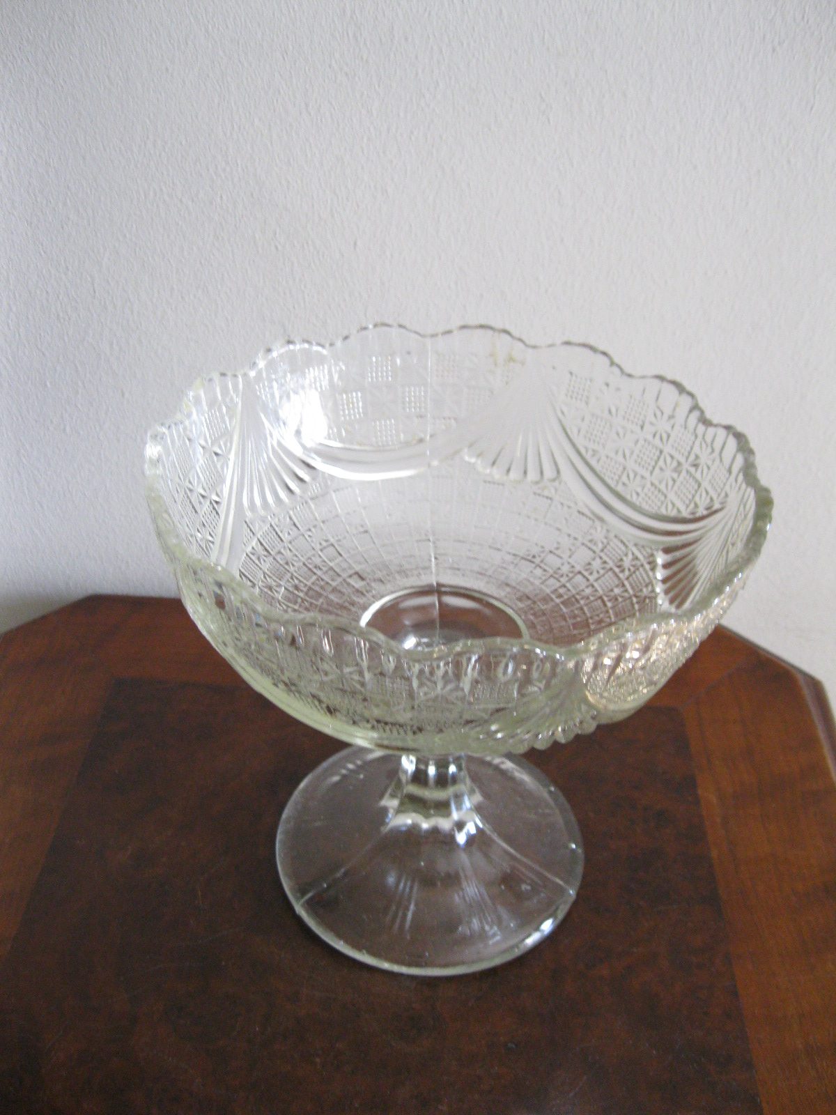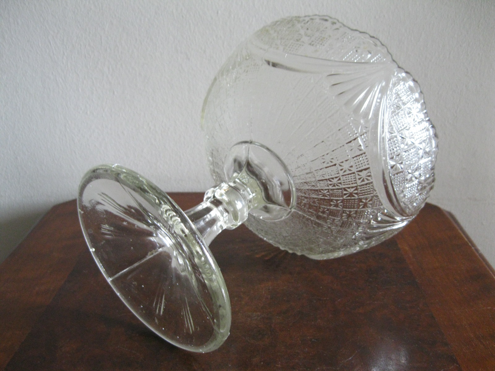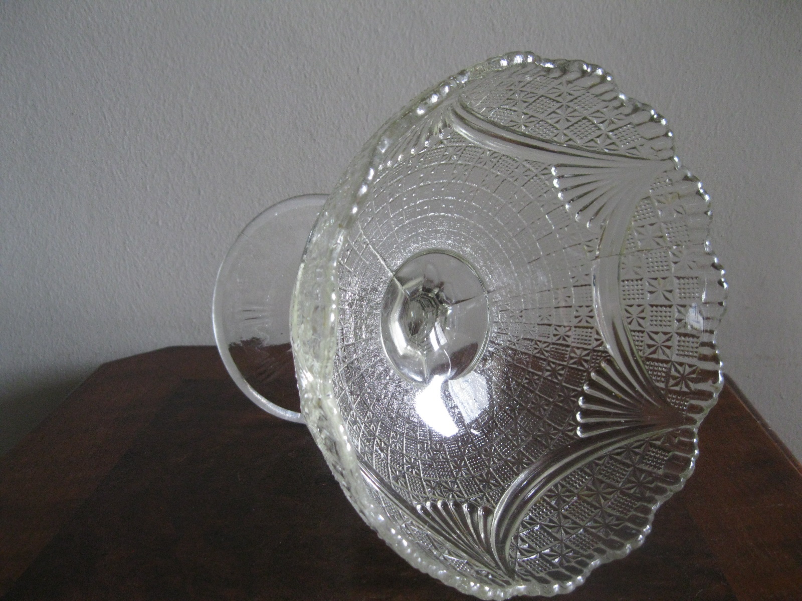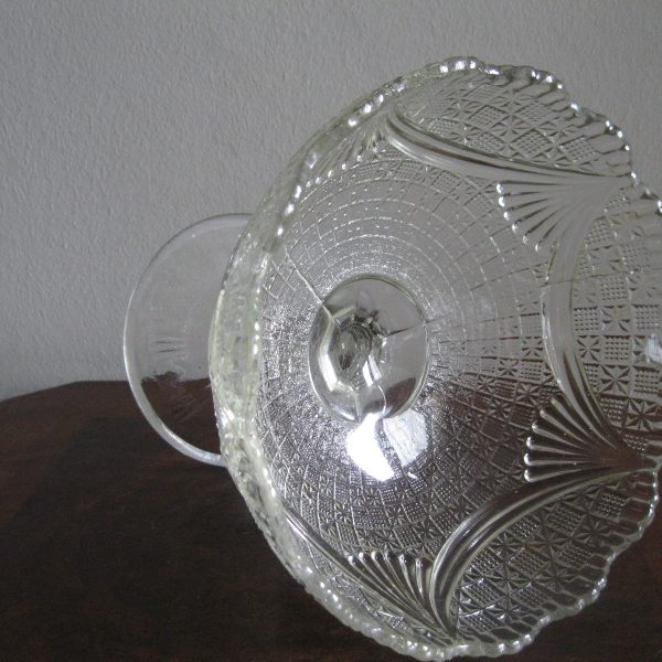 Oryginalna, bardzo dekoracyjna, stara, duża, patera na nodze Girlandy huta Ząbkowice. Wykonana z przeźroczystego szkła w białym kolorze, zdobiona od zewnątrz bogatym tłoczeniem. Zachowana w stanie bardzo dobrym; cała bez uszkodzeń, na czaszy, na górze od zewnątrz posiada miejscowe skupione fabryczne wybrzuszenia co jest widoczne przy bardzo wnikliwym oglądzie, bez znaczenia na urodę Polecam !