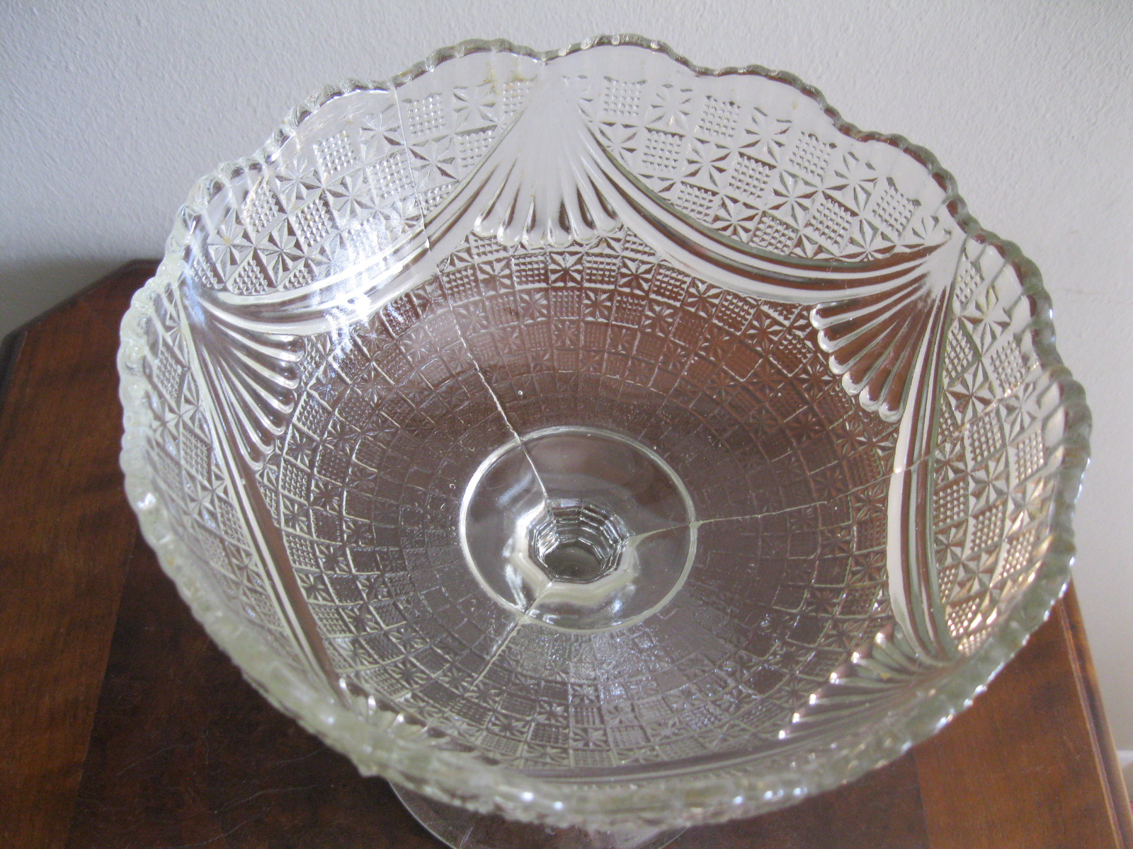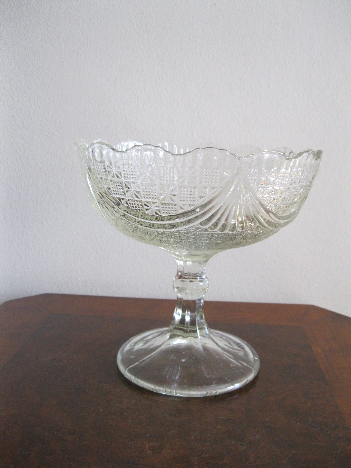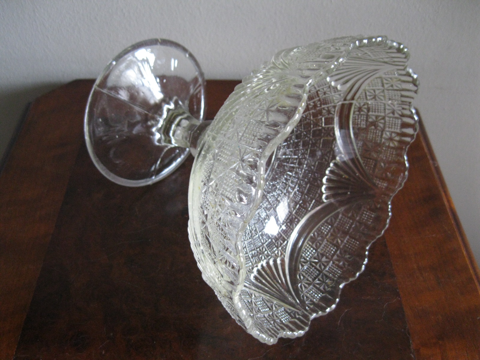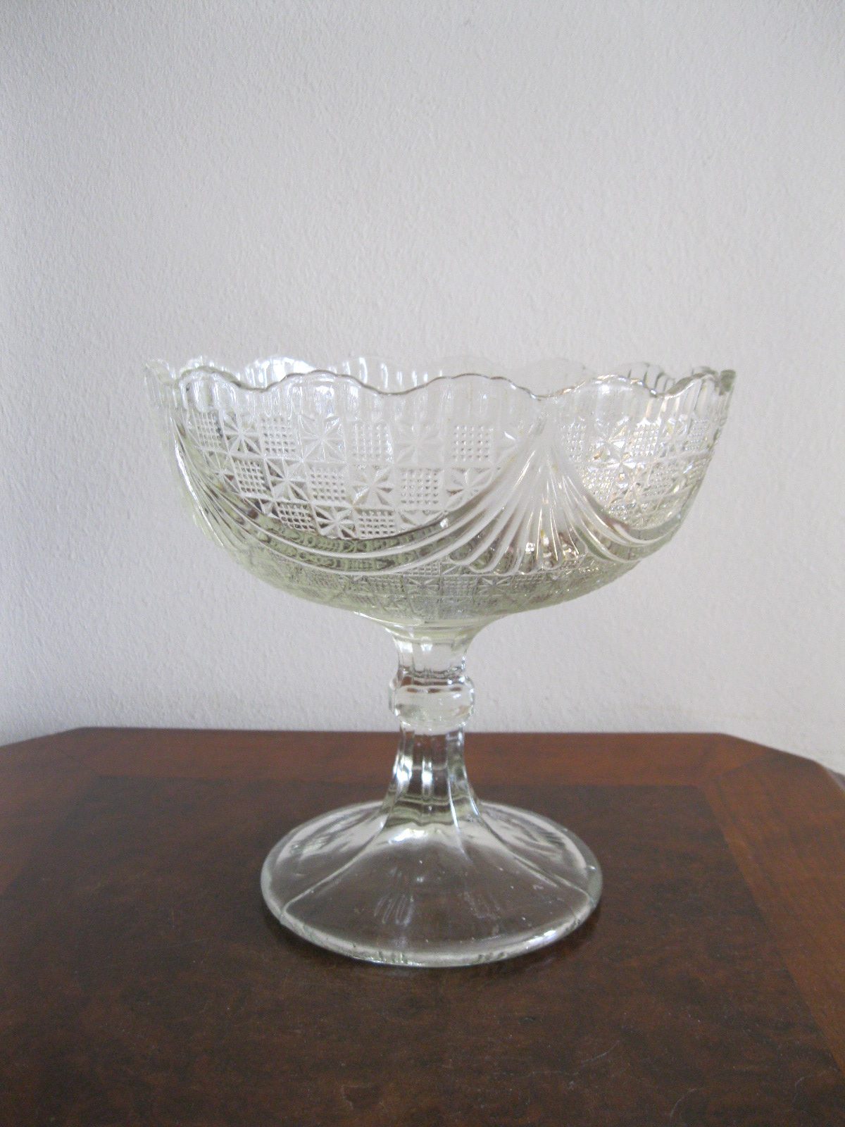 Oryginalna, bardzo dekoracyjna, stara, duża, patera na nodze Girlandy huta Ząbkowice. Wykonana z przeźroczystego szkła w białym kolorze, zdobiona od zewnątrz bogatym tłoczeniem. Zachowana w stanie bardzo dobrym; cała bez uszkodzeń, na czaszy, na górze od zewnątrz posiada miejscowe skupione fabryczne wybrzuszenia co jest widoczne przy bardzo wnikliwym oglądzie, bez znaczenia na urodę Polecam !