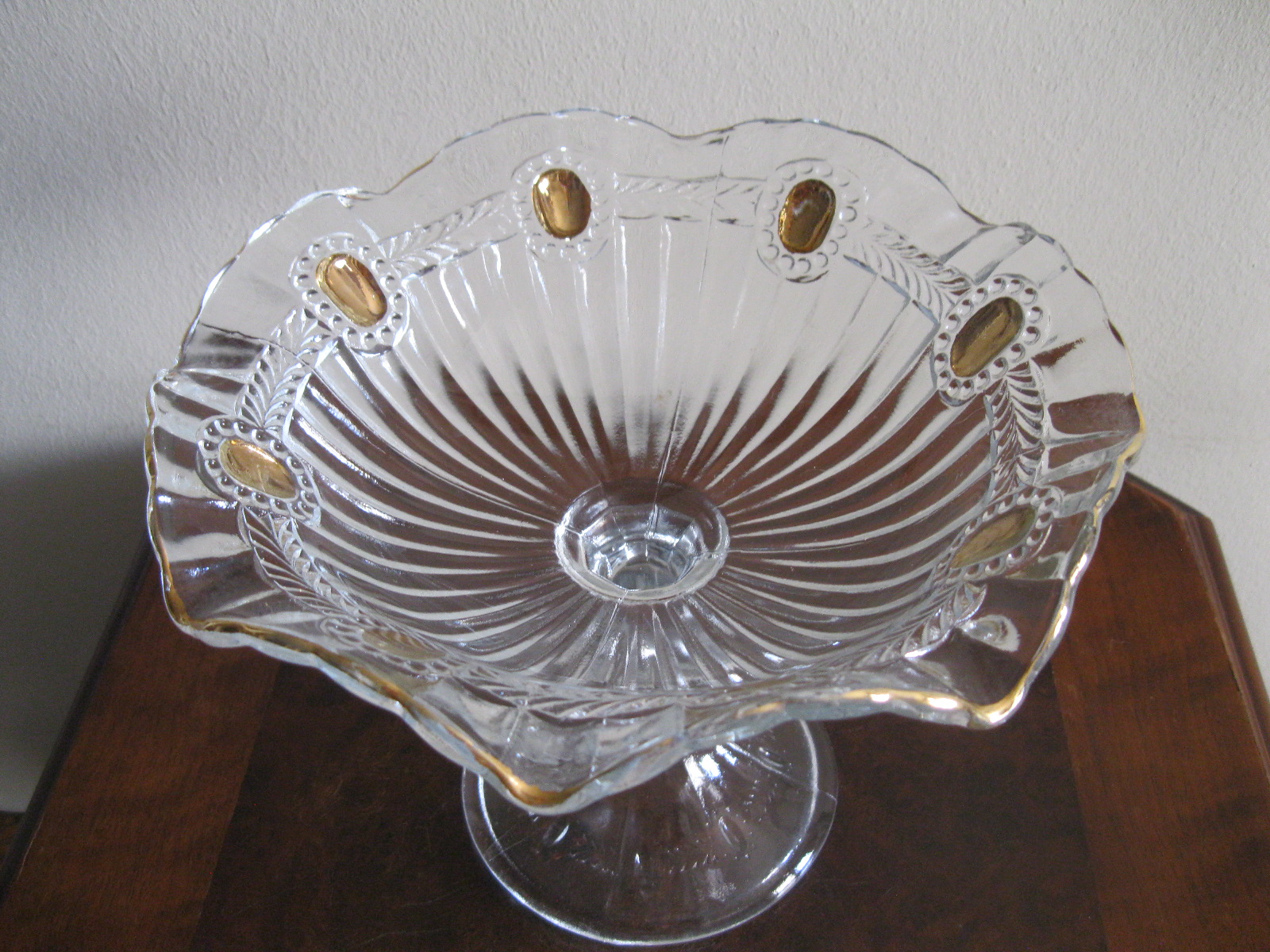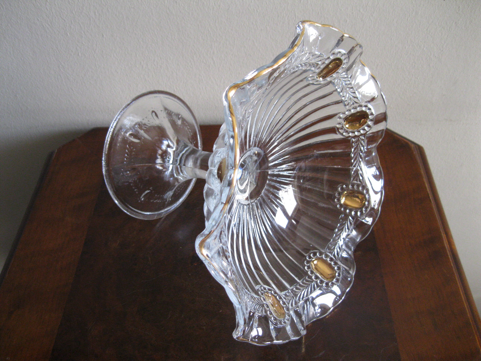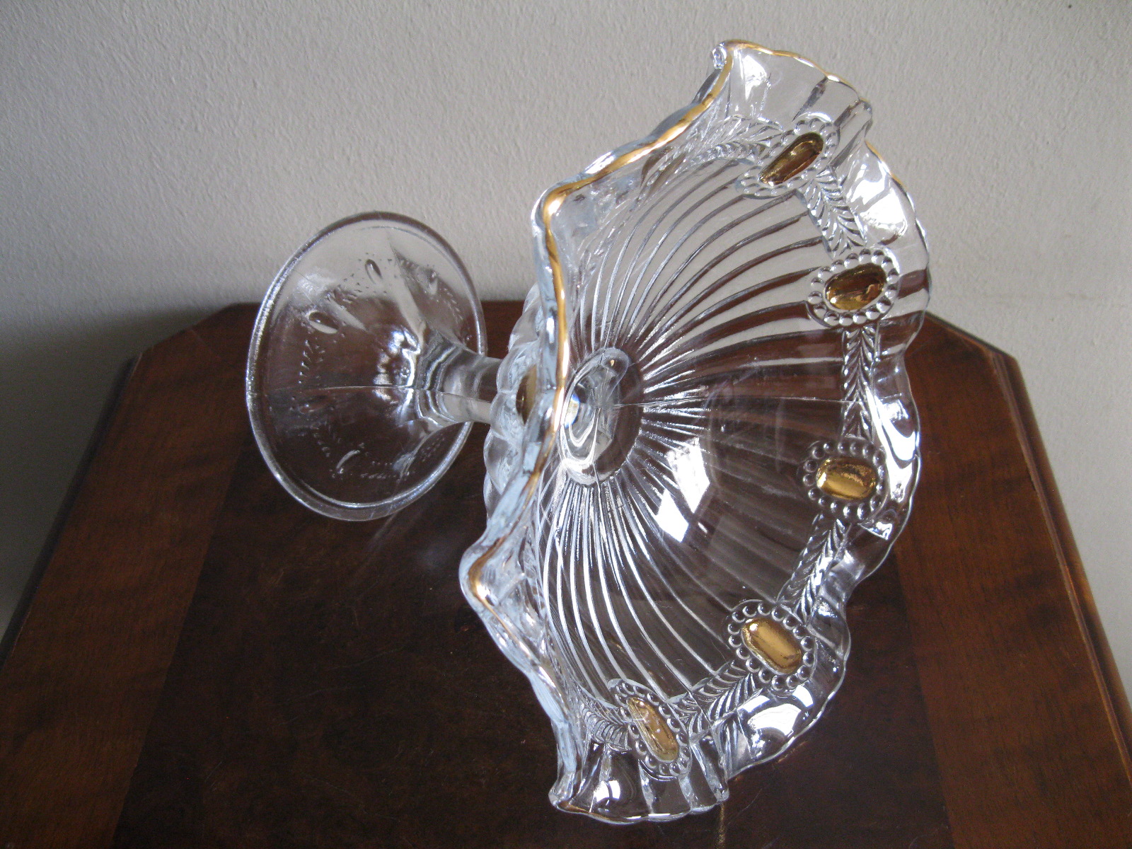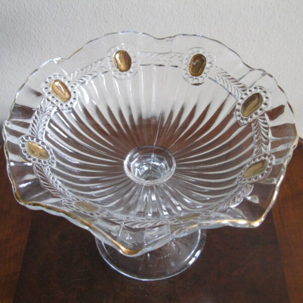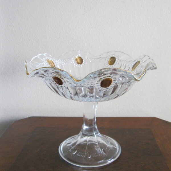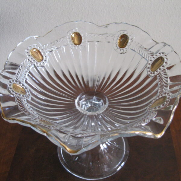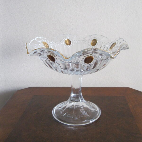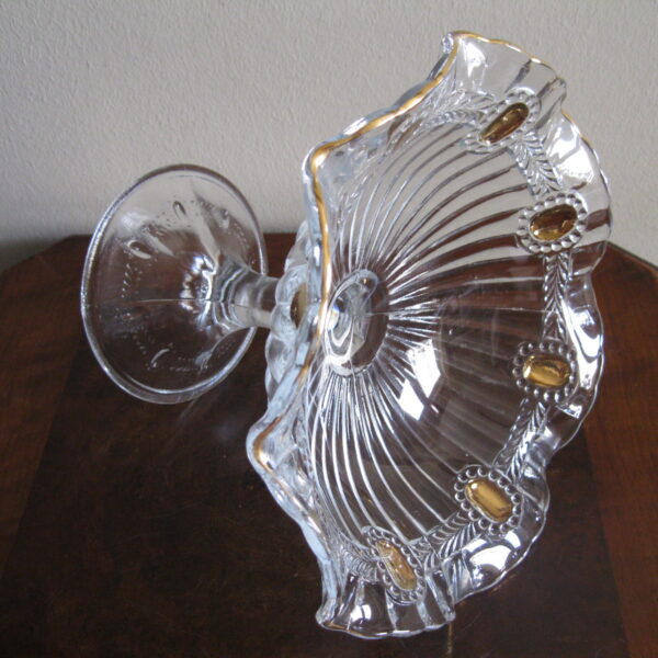 Oryginalna, bardzo dekoracyjna, stara, duża, patera na nodze Olivia huta Ząbkowice. Wykonana z przeźroczystego szkła w białym kolorze, zdobiona od zewnątrz bogatym, reliefowym tłoczeniem, od wewnątrz na owalnych, wypukłych oczkach dodatkowo złoceniem. Zachowana w stanie bardzo dobrym; cała bez uszkodzeń. Idealna do ozdoby lub prezentowania np. owoców. Piękne stare szkło. Polecam !