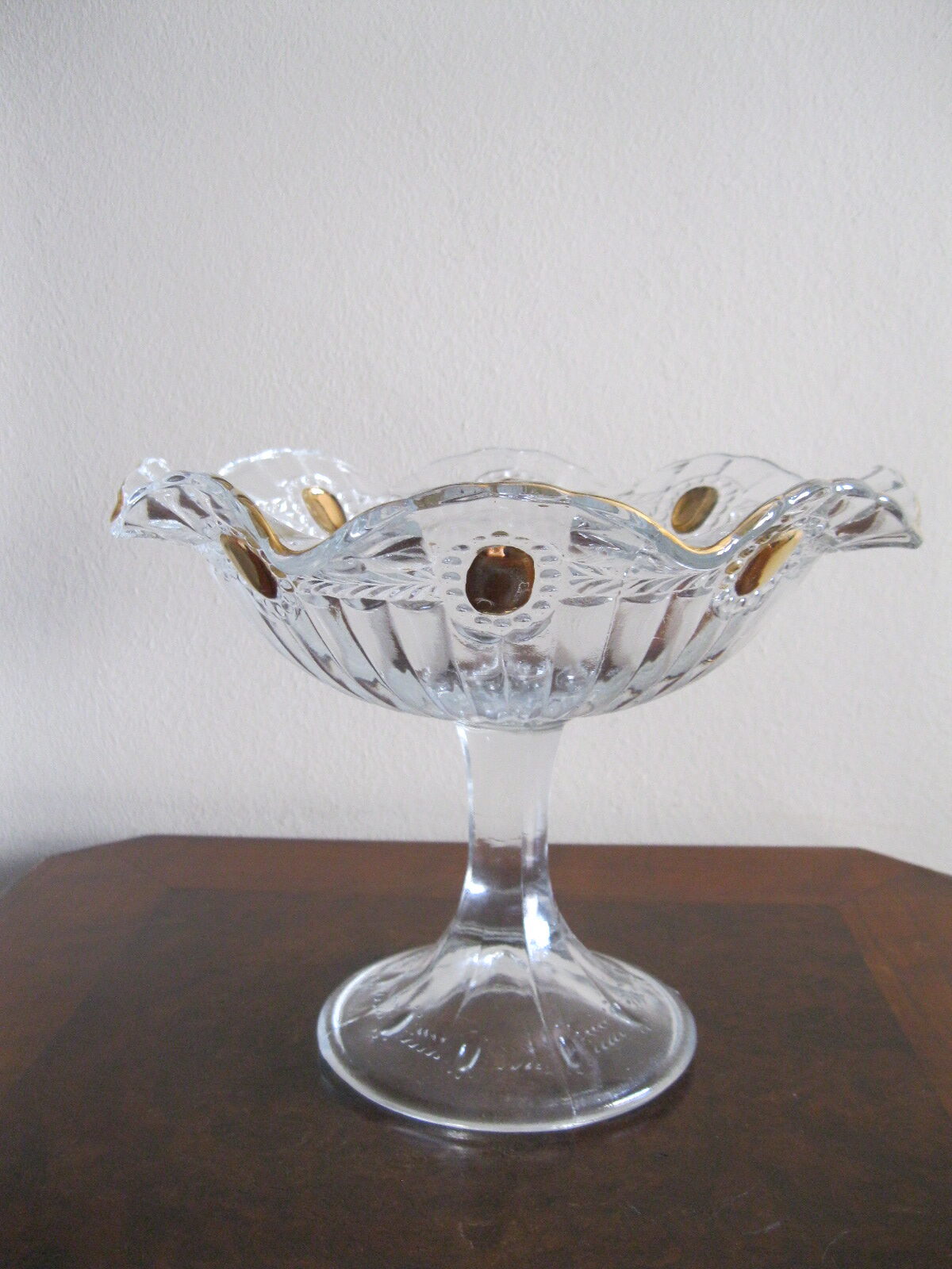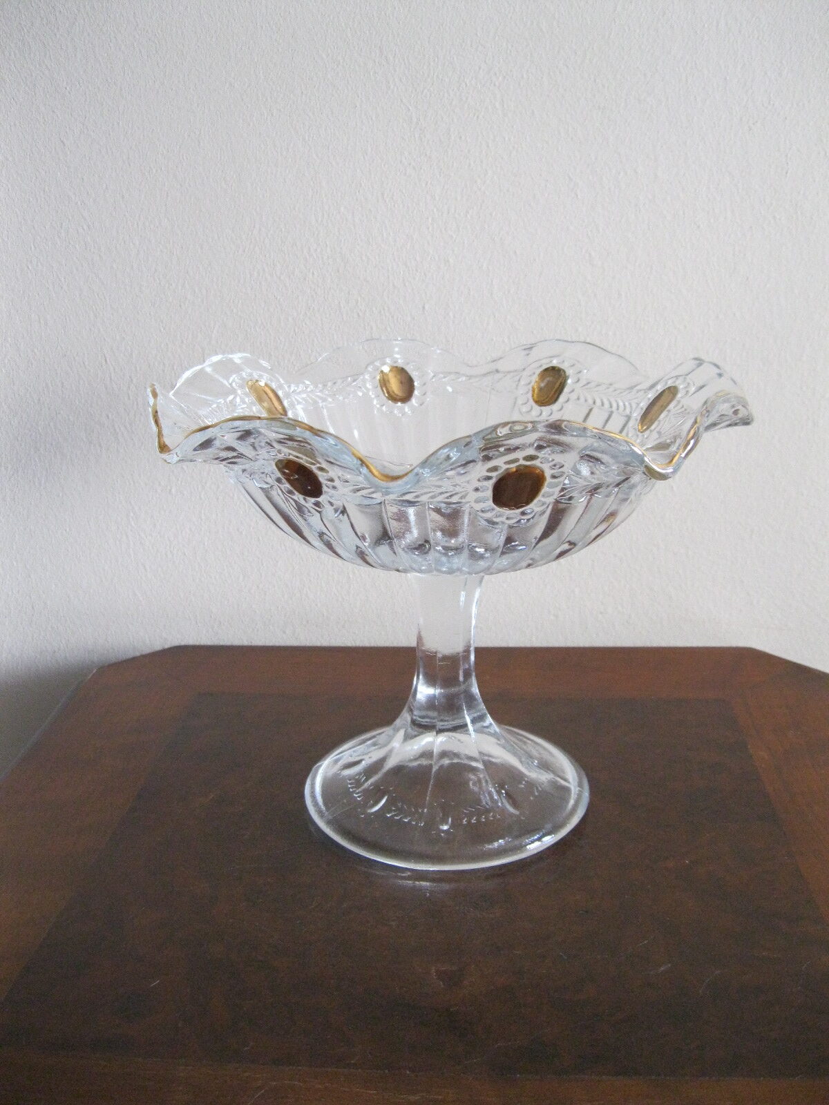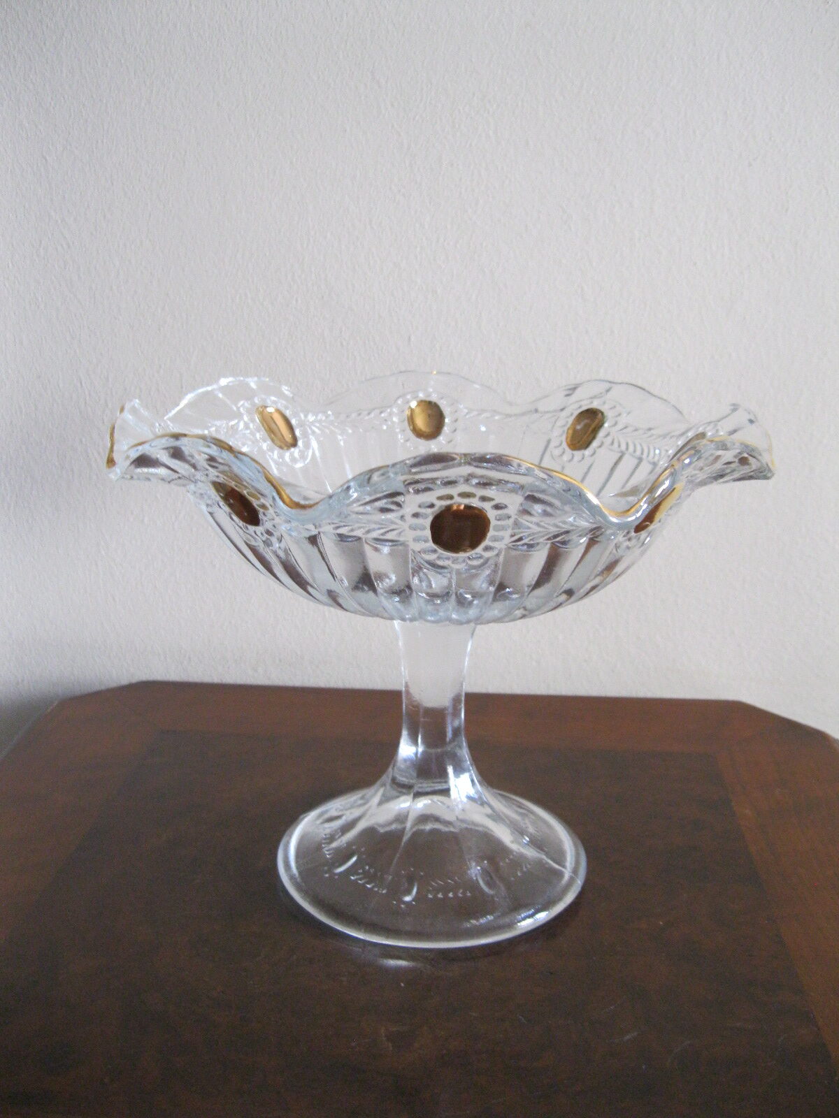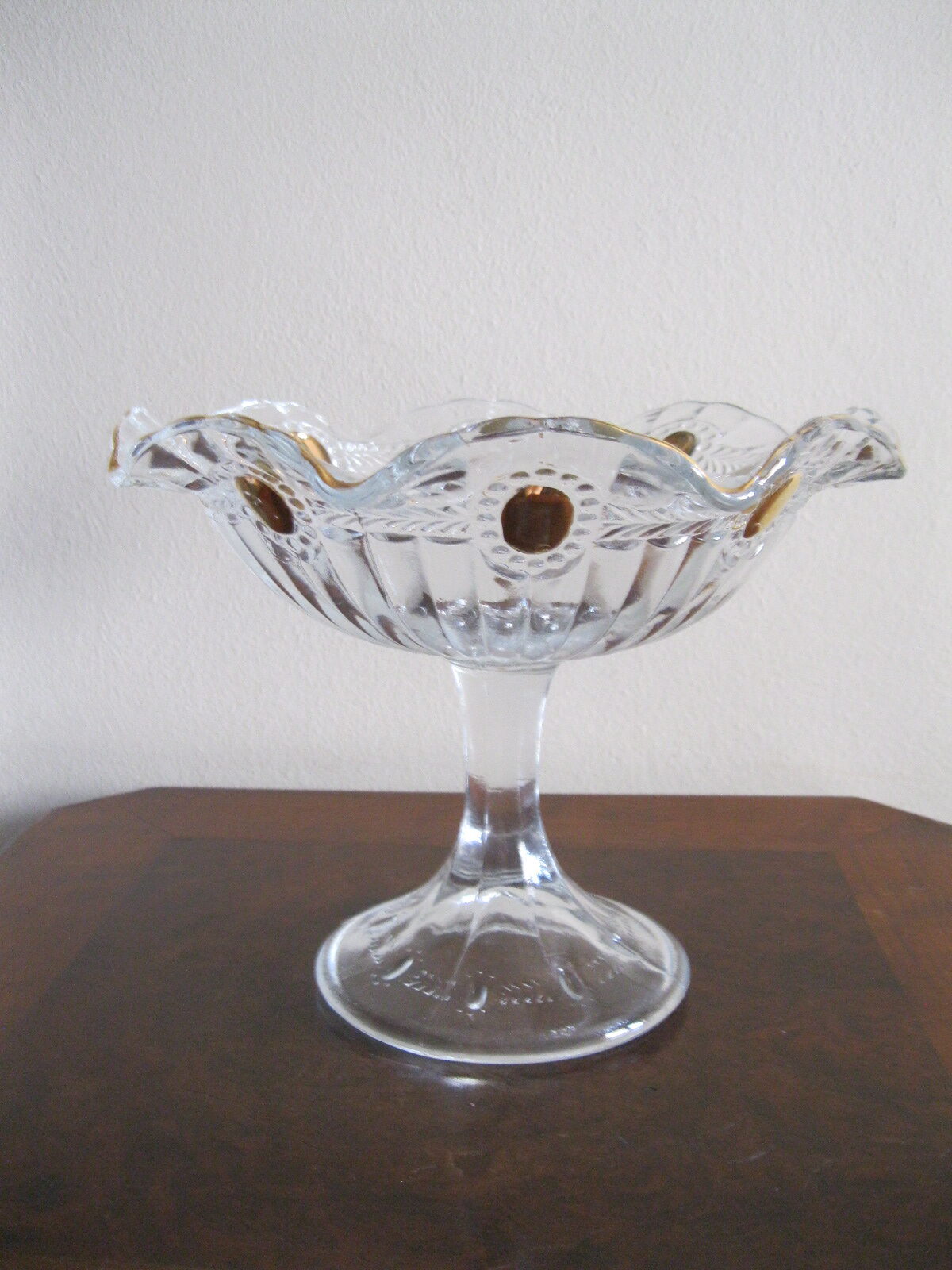 Oryginalna, bardzo dekoracyjna, stara, duża, patera na nodze Olivia huta Ząbkowice. Wykonana z przeźroczystego szkła w białym kolorze, zdobiona od zewnątrz bogatym, reliefowym tłoczeniem, od wewnątrz na owalnych, wypukłych oczkach dodatkowo złoceniem. Zachowana w stanie bardzo dobrym; cała bez uszkodzeń. Idealna do ozdoby lub prezentowania np. owoców. Piękne stare szkło. Polecam !