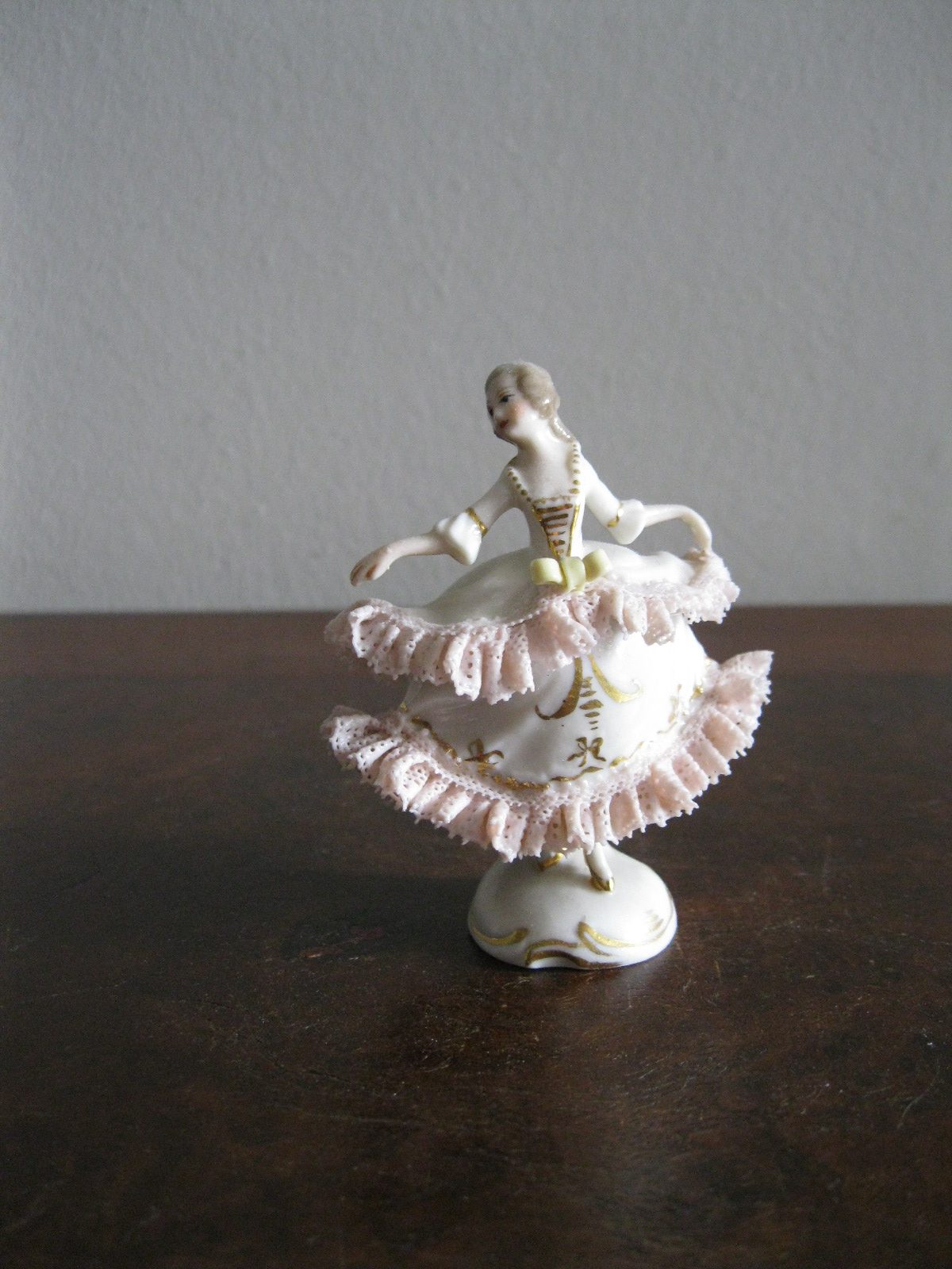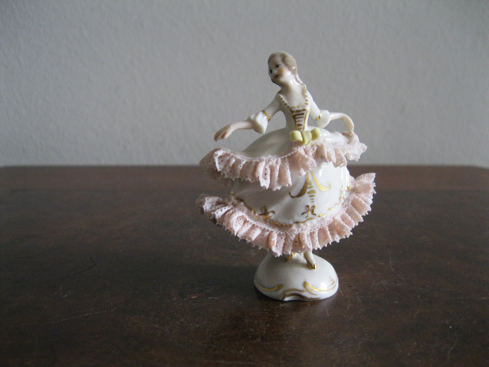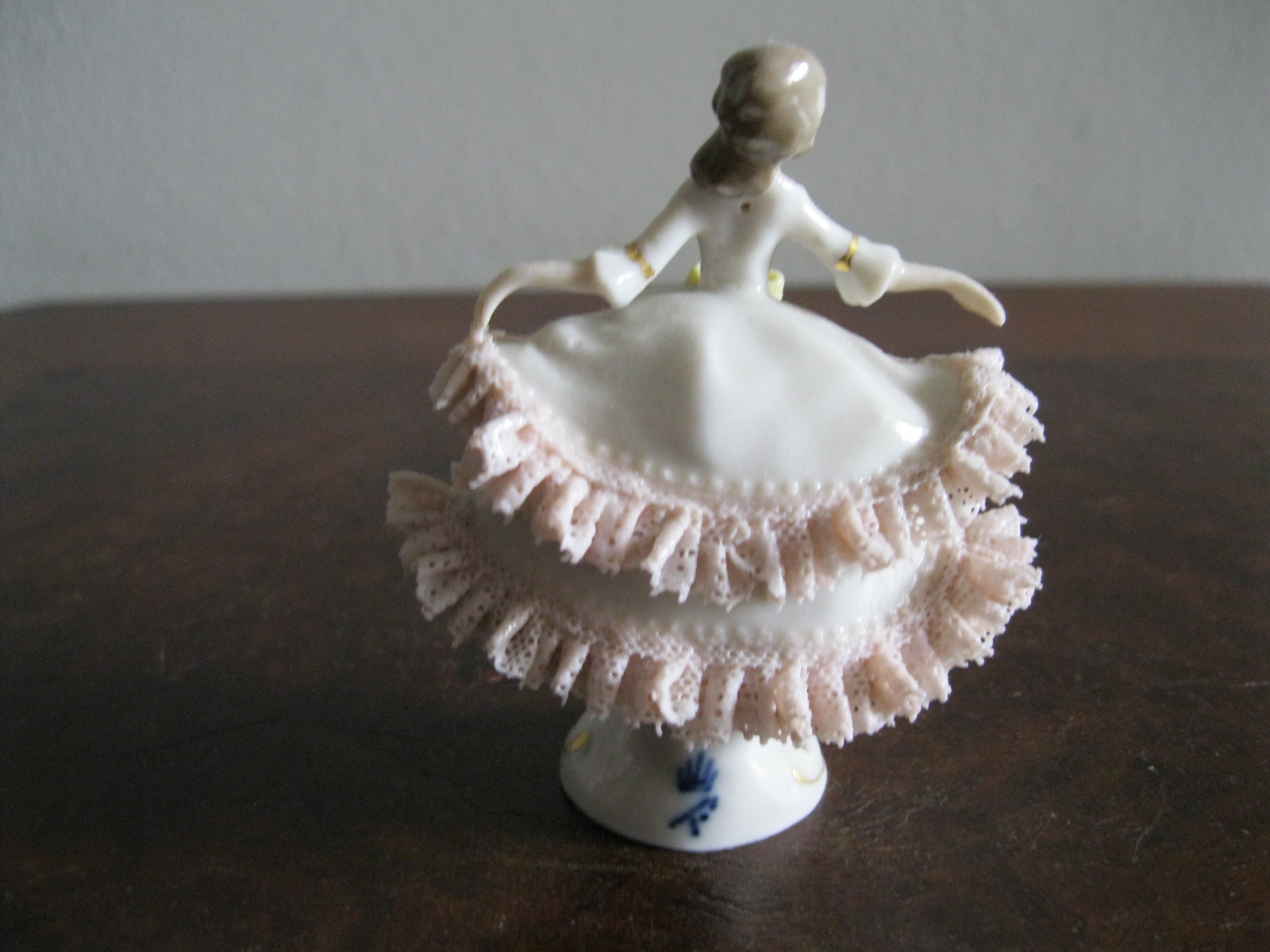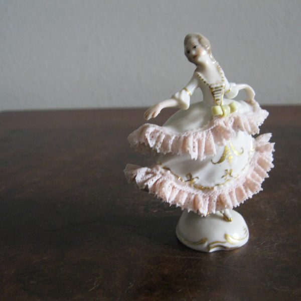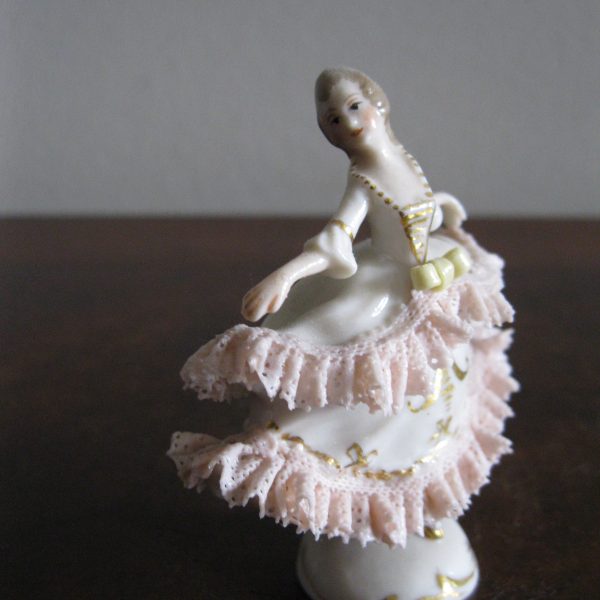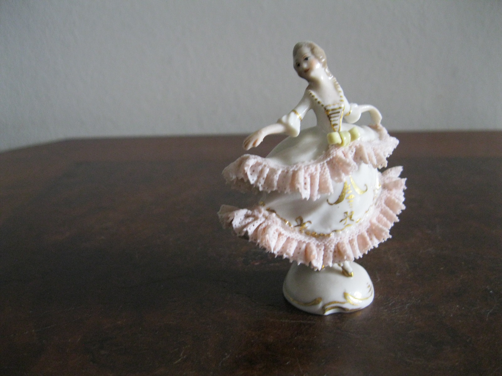 Oryginalna, bardzo stara, nieduża porcelanowa figurka Damy w misternej koronkowej sukni w falbankach. Pochodzi ze słynnej drezdeńskiej manufaktury. Wykonana z bardzo dobrej jakości, delikatnej porcelany, wyjątkowo ładnie ręcznie malowana i doskonale szkliwiona. Zachowana w stanie bardzo dobrym, cała bez uszkodzeń. Sygnowana. Polecam !
