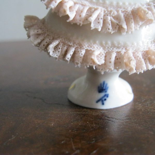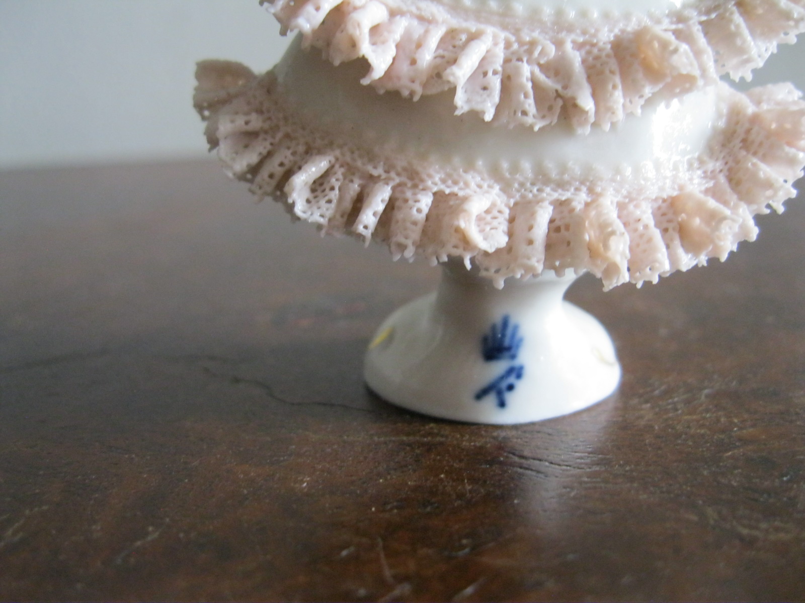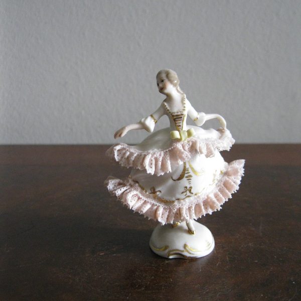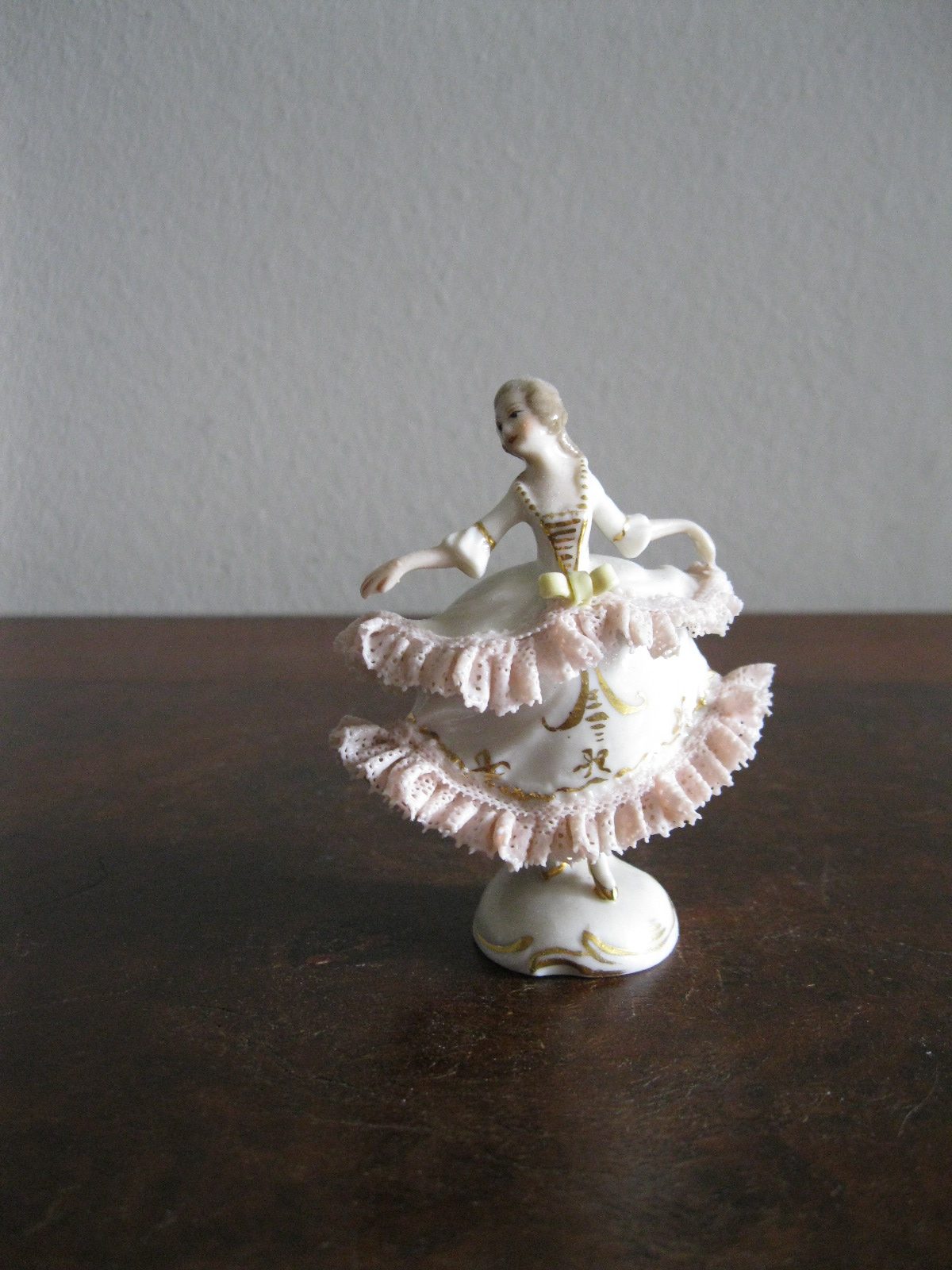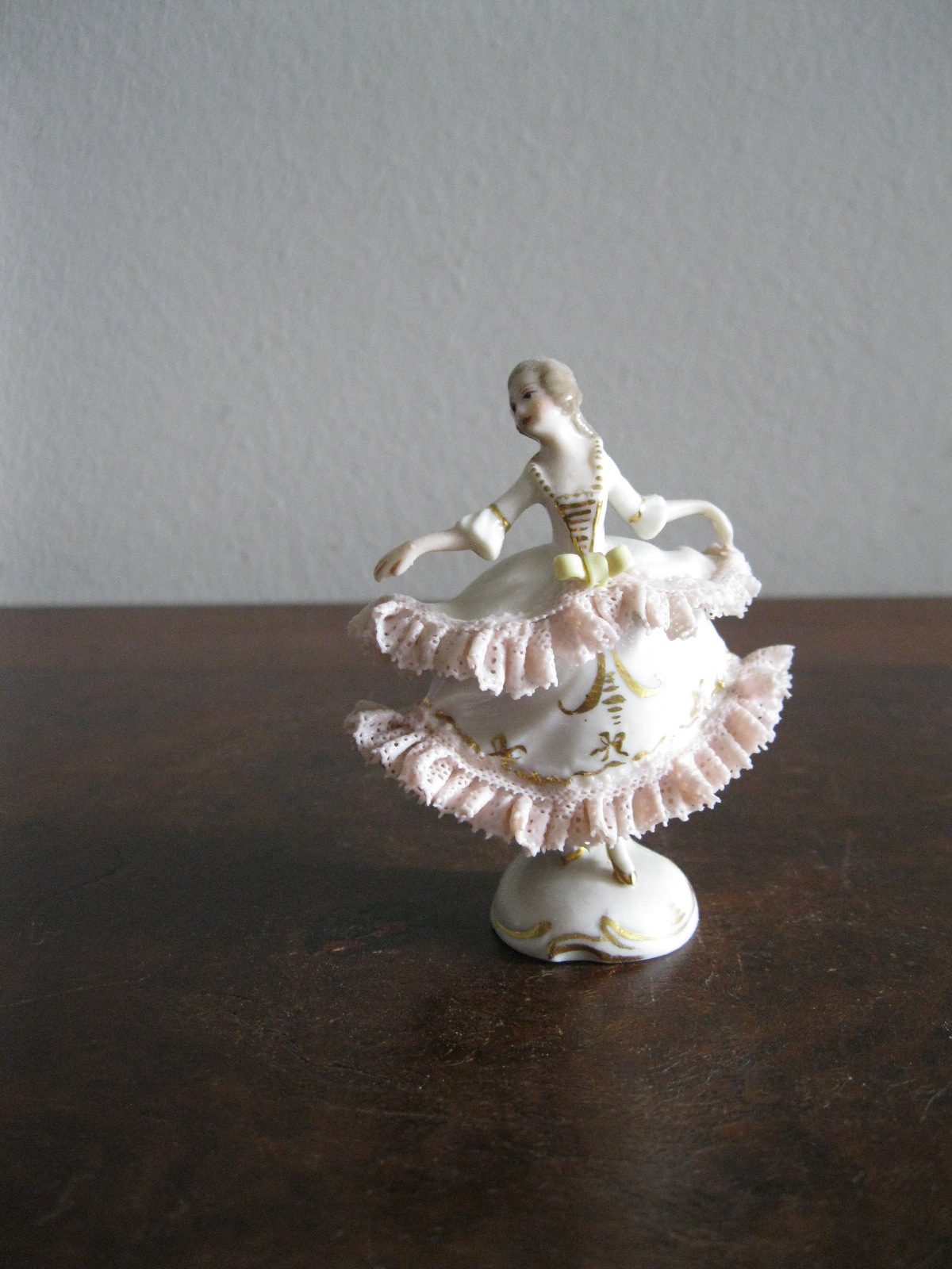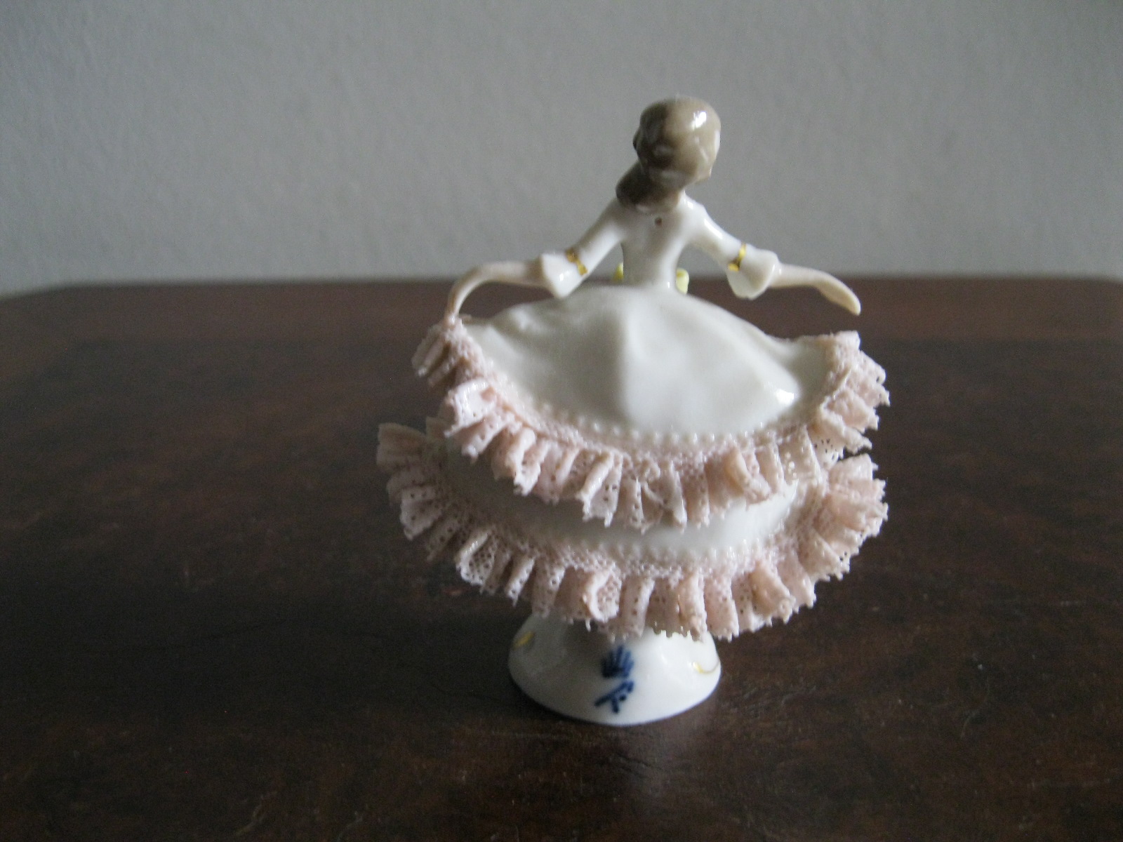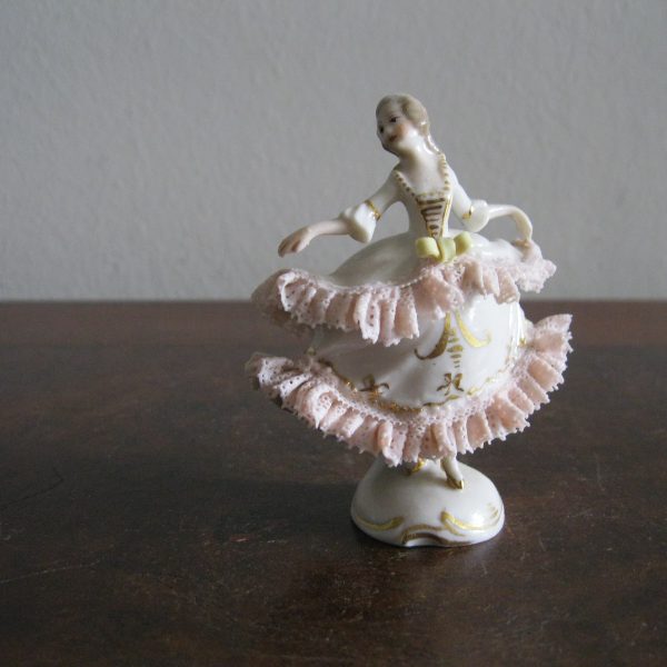 Oryginalna, bardzo stara, nieduża porcelanowa figurka Damy w misternej koronkowej sukni w falbankach. Pochodzi ze słynnej drezdeńskiej manufaktury. Wykonana z bardzo dobrej jakości, delikatnej porcelany, wyjątkowo ładnie ręcznie malowana i doskonale szkliwiona. Zachowana w stanie bardzo dobrym, cała bez uszkodzeń. Sygnowana. Polecam !