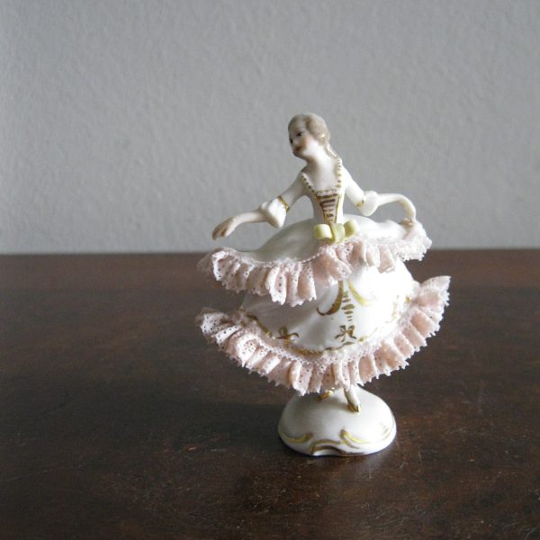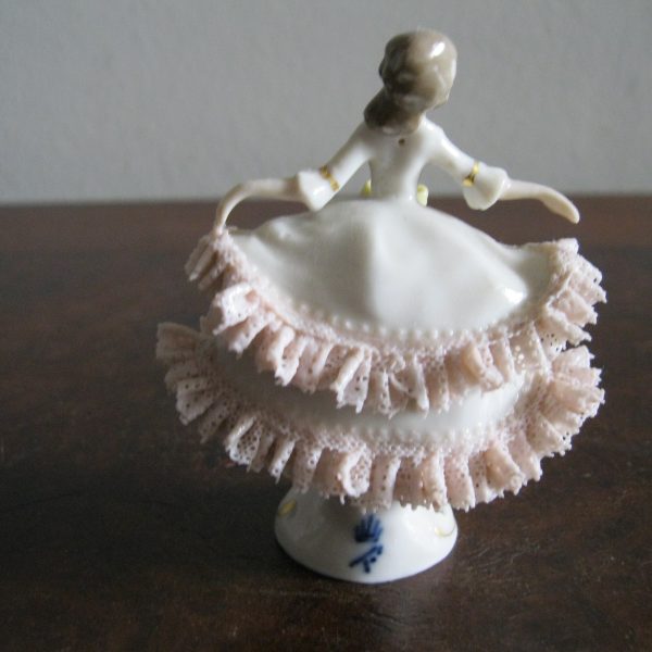 ŚLICZNA STARA FIGURKA DAMA W MISTERNEJ KORONKOWEJ SUKNI