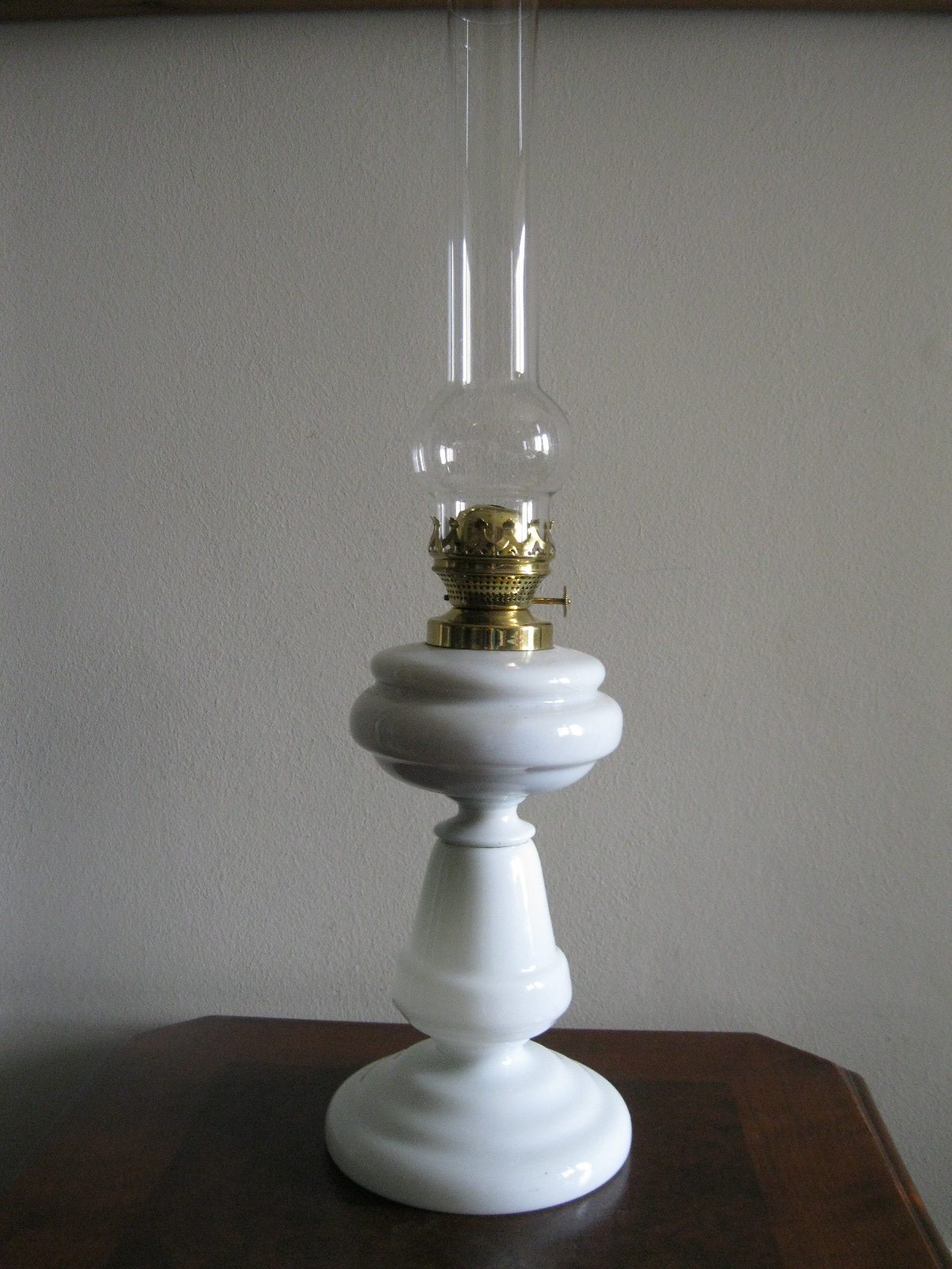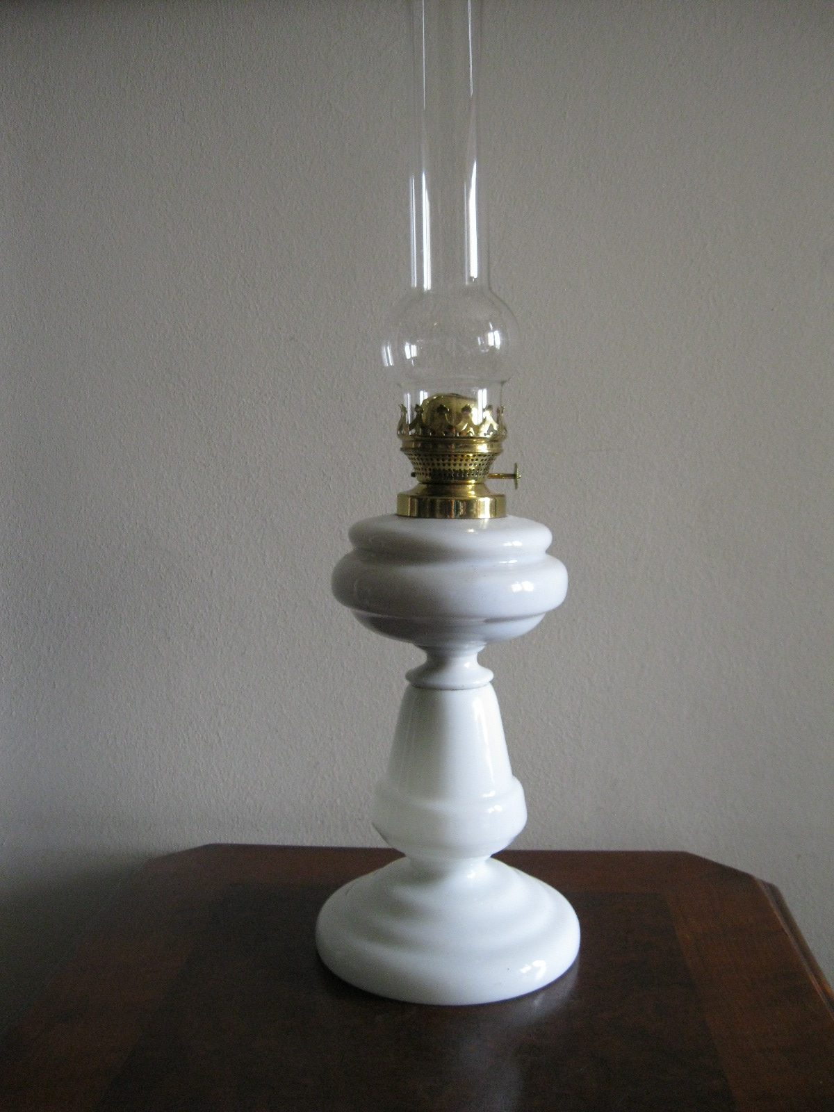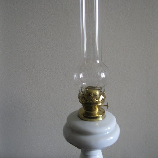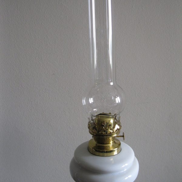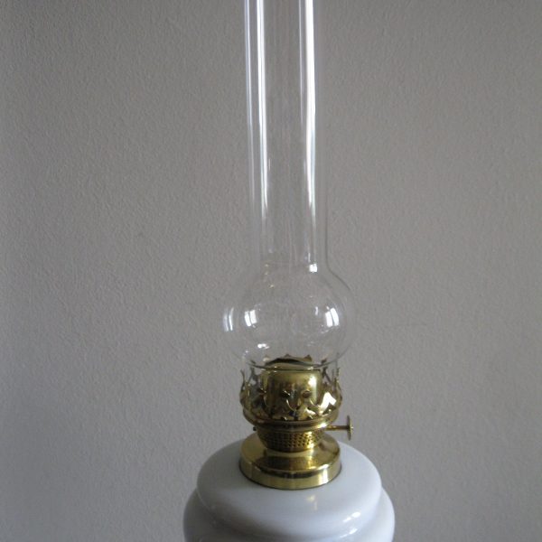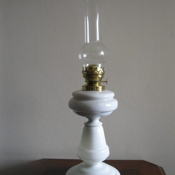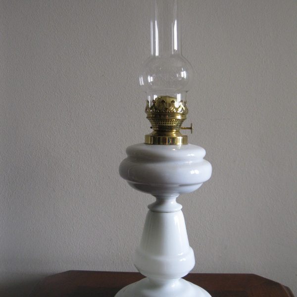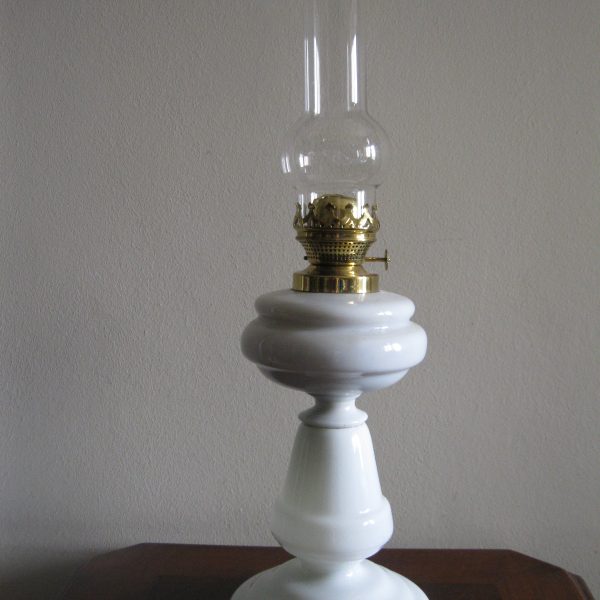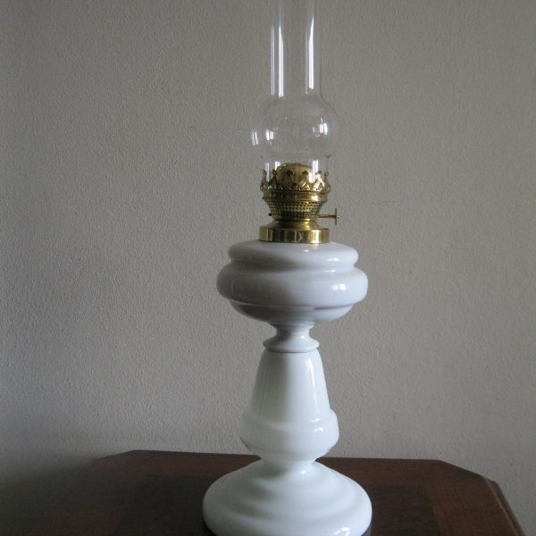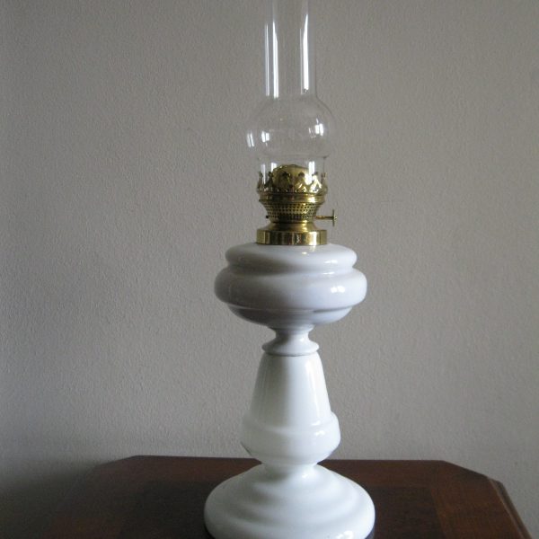 Oryginalna, ozdobna, stara szklana, bardzo dekoracyjna, wysoka lampa naftowa. Wykonana z grubego, solidnego szkła w białym kolorze. Zbiornik lampy pojemny, szczelny. Brener lampy stary, sprawny w złotym kolorze. Lampa nie jest wyposażona w knot. Lampa w komplecie z oryginalnym cylindrem w białym, przeźroczystym kolorze. Polecam !