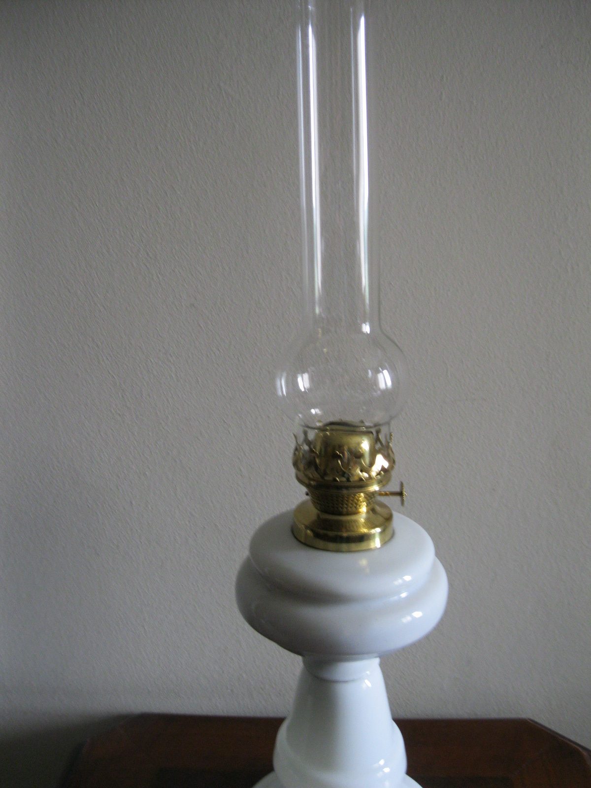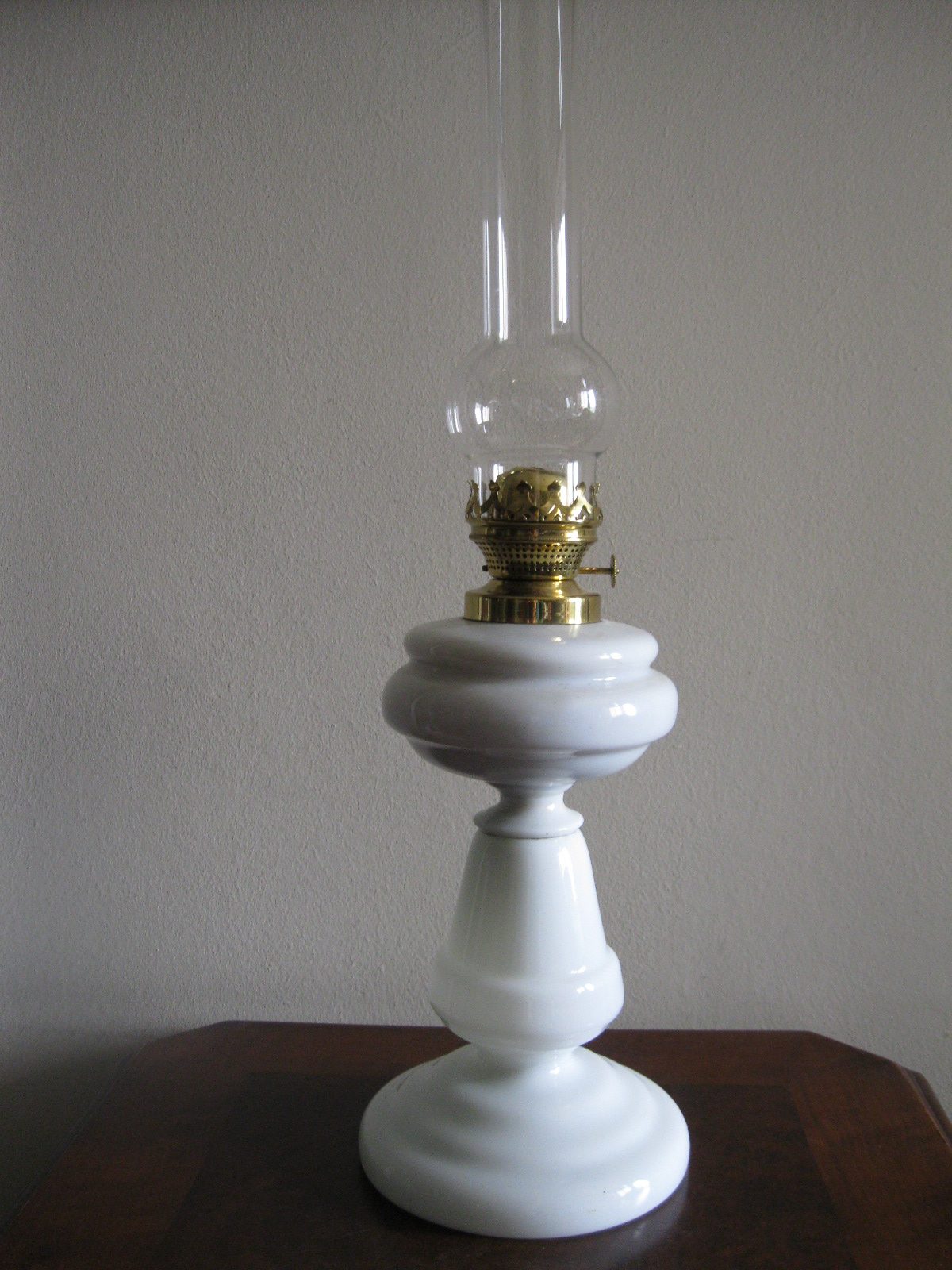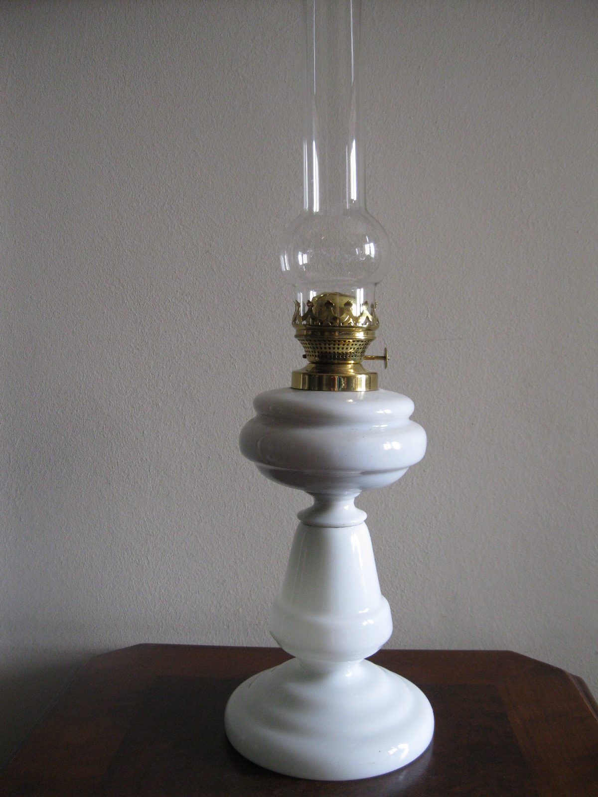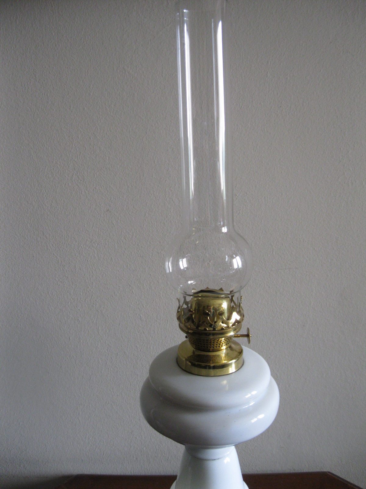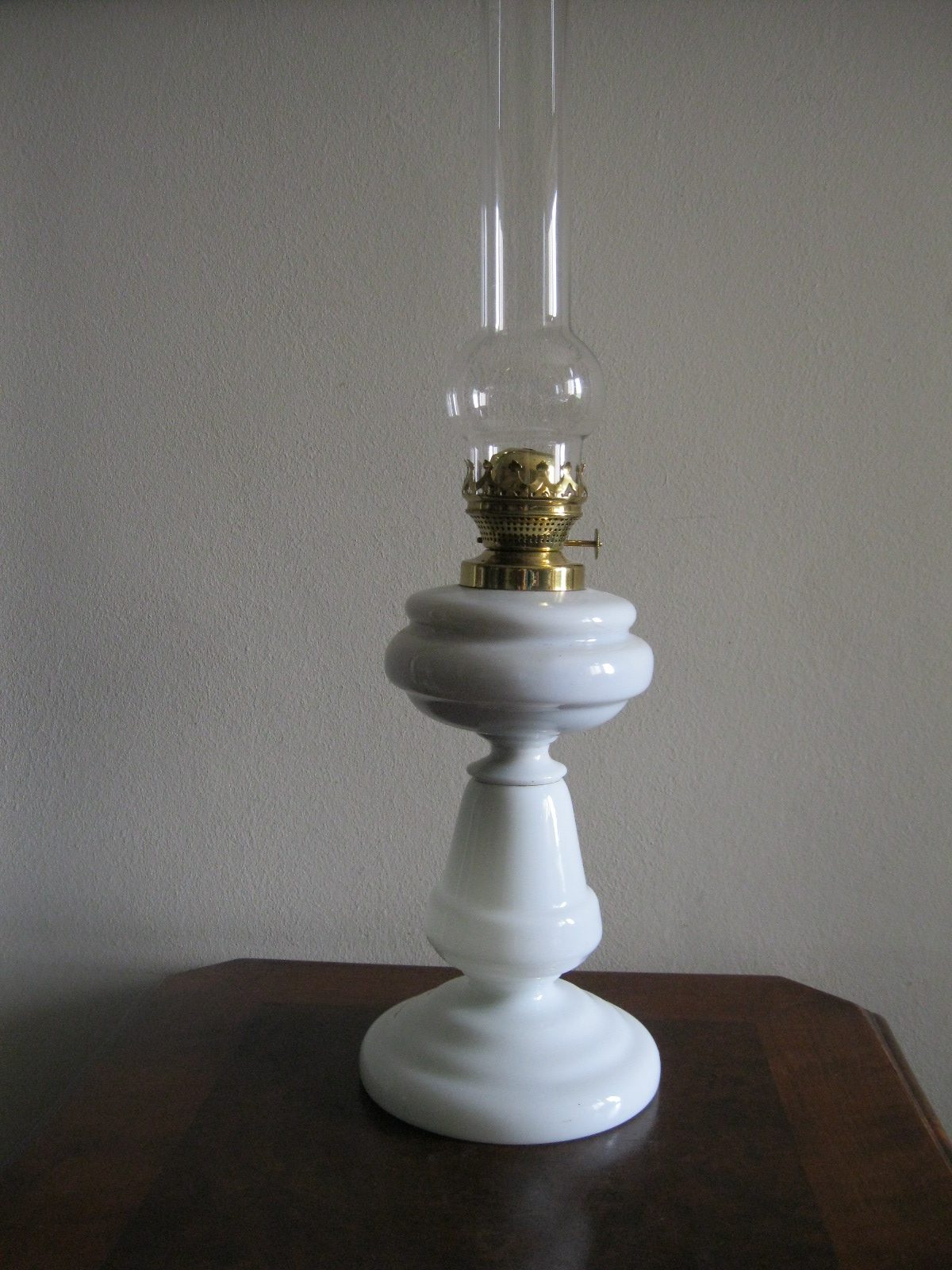 Oryginalna, ozdobna, stara szklana, bardzo dekoracyjna, wysoka lampa naftowa. Wykonana z grubego, solidnego szkła w białym kolorze. Zbiornik lampy pojemny, szczelny. Brener lampy stary, sprawny w złotym kolorze. Lampa nie jest wyposażona w knot. Lampa w komplecie z oryginalnym cylindrem w białym, przeźroczystym kolorze. Polecam !
