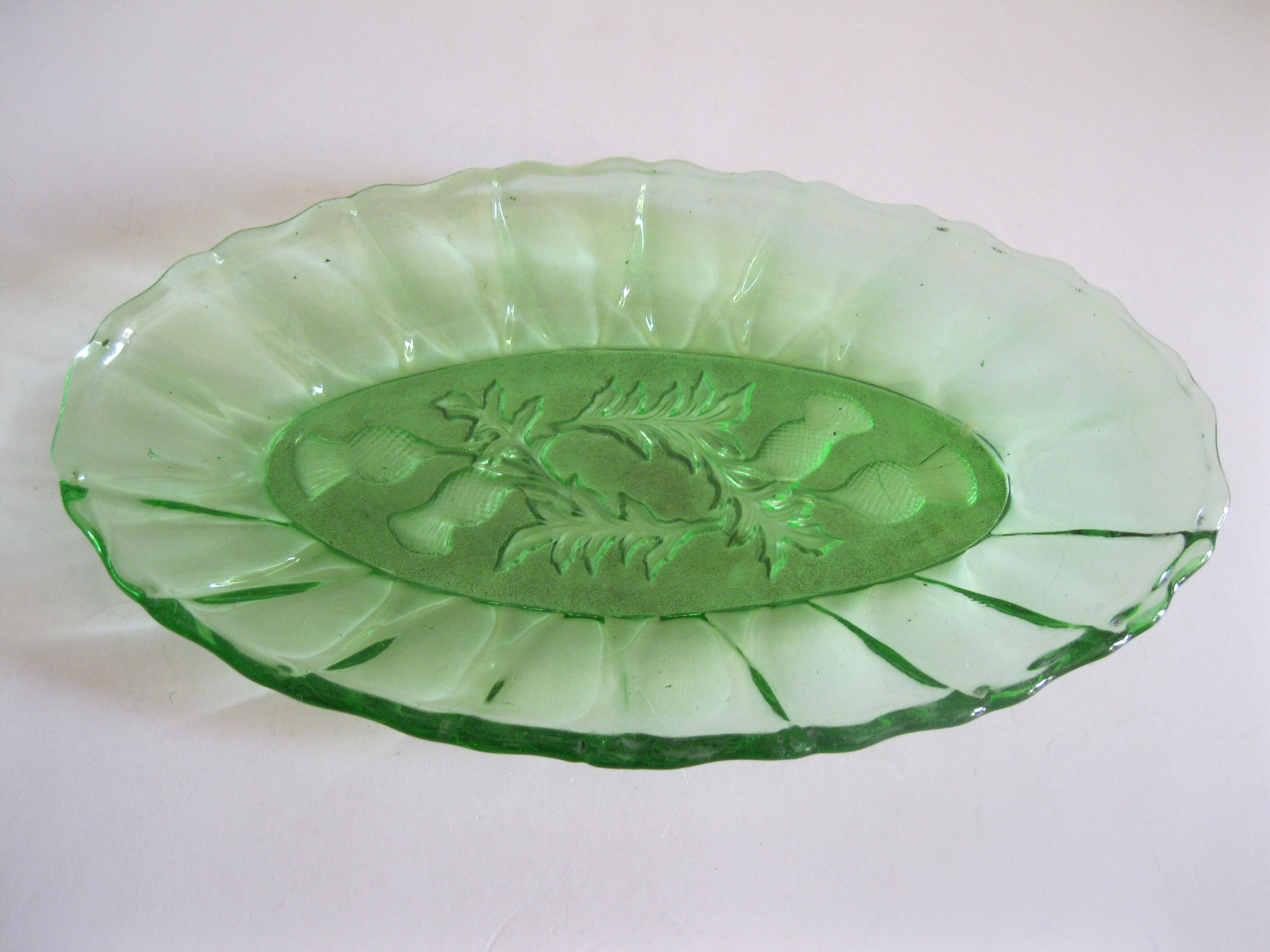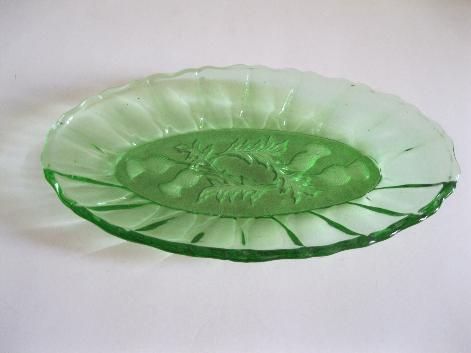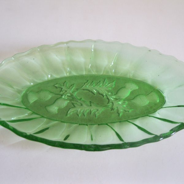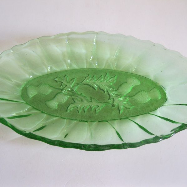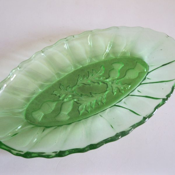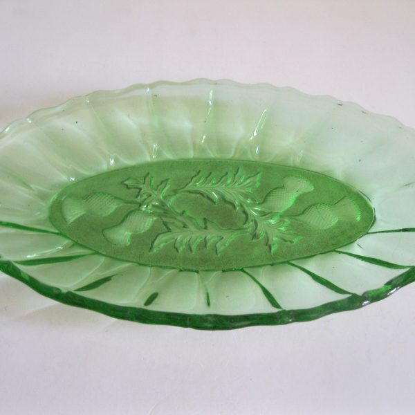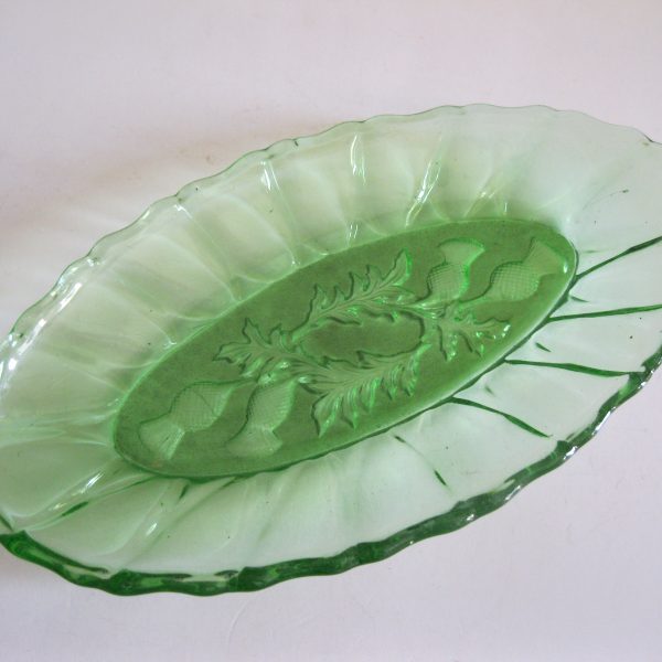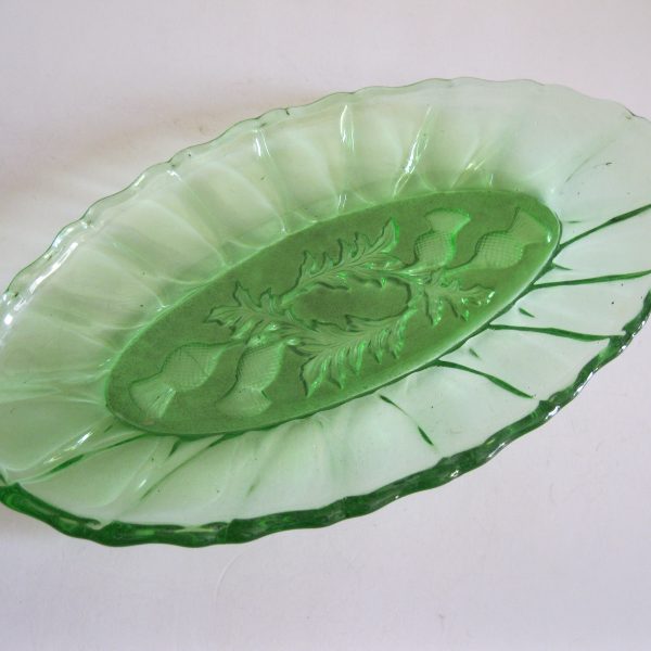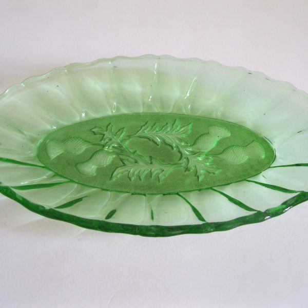 Oryginalny, stary, szklany, średniej wielkości półmisek osty/ maki. Huta Ząbkowice. Wykonany z białego, przeźroczystego szkła w wysyconym zielonym kolorze, zdobiony po bokach ozdobnym tłoczeniem, dno półmiska szkło prasowane zdobione na całości roślinnym wzorem w osty/maki. Zachowany w wizualnym stanie bardzo dobrym, cały bez uszkodzeń bez rys i wyszczerbień. Polecam !