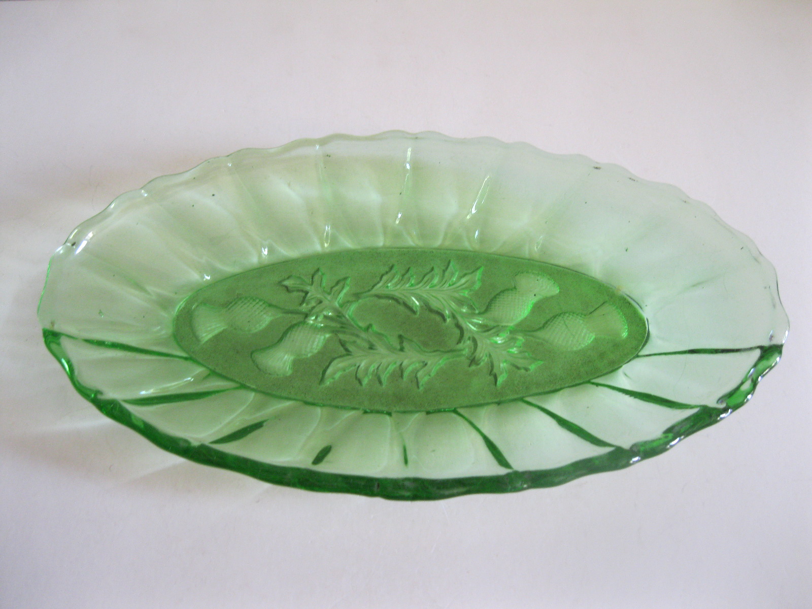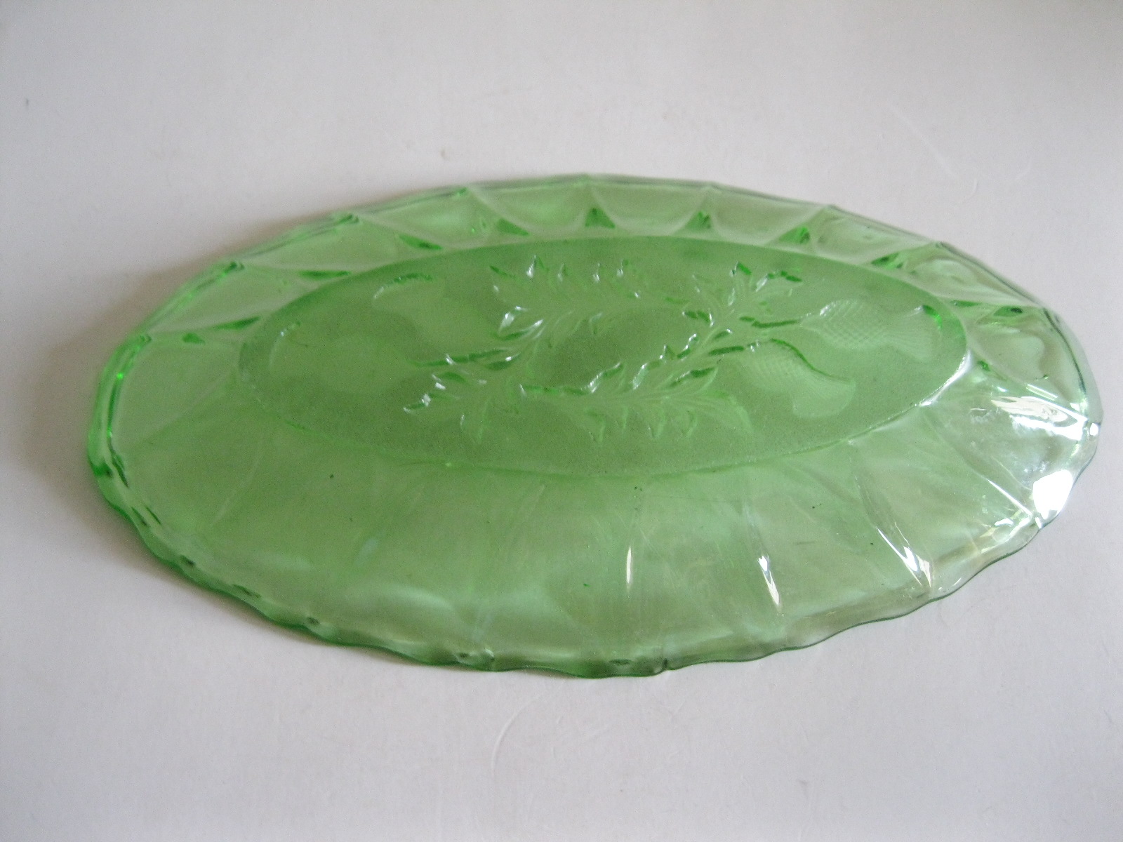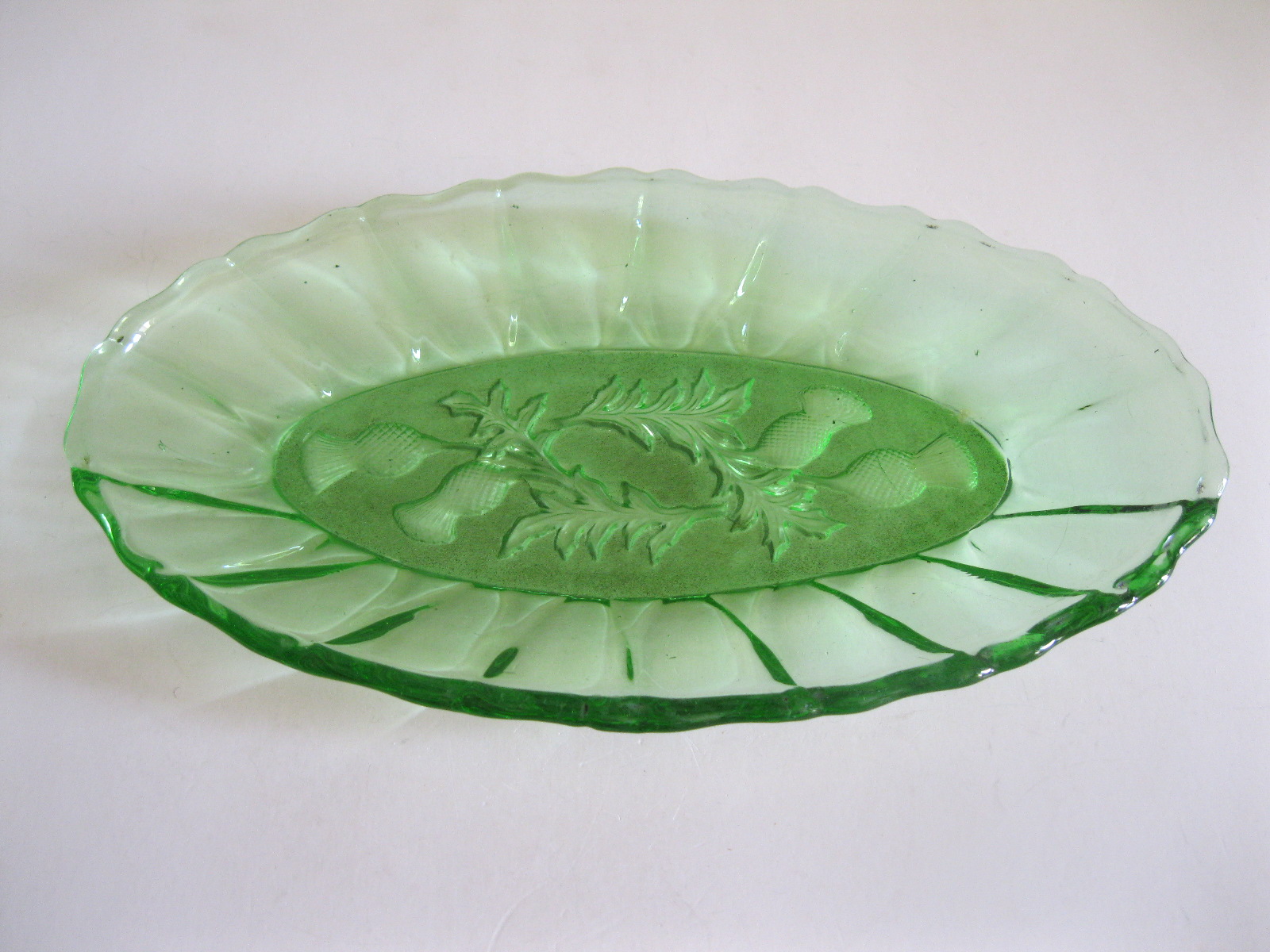 Oryginalny, stary, szklany, średniej wielkości półmisek osty/ maki. Huta Ząbkowice. Wykonany z białego, przeźroczystego szkła w wysyconym zielonym kolorze, zdobiony po bokach ozdobnym tłoczeniem, dno półmiska szkło prasowane zdobione na całości roślinnym wzorem w osty/maki. Zachowany w wizualnym stanie bardzo dobrym, cały bez uszkodzeń bez rys i wyszczerbień. Polecam !