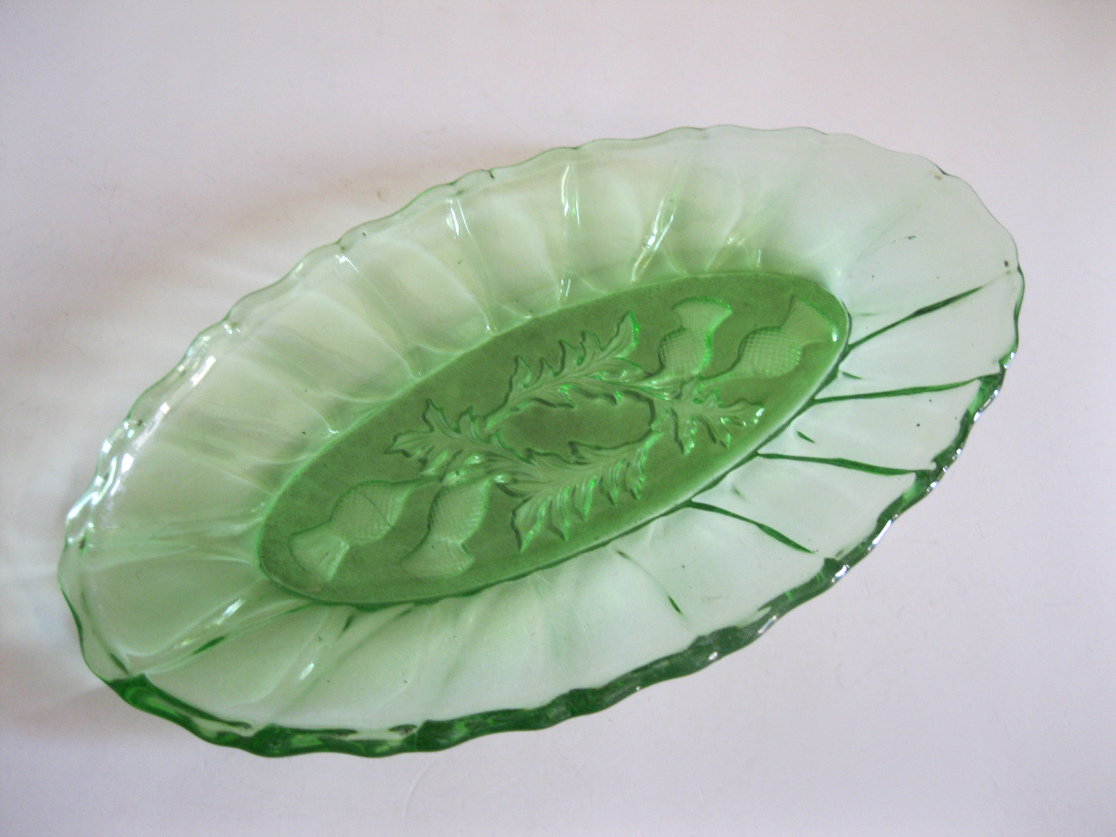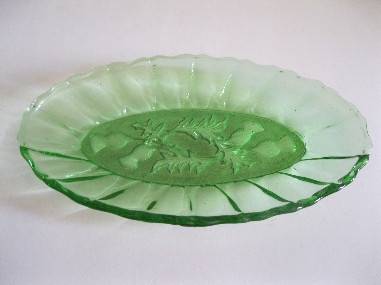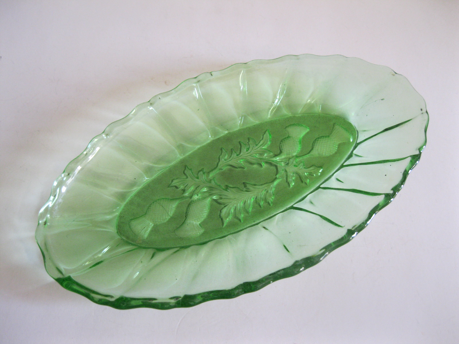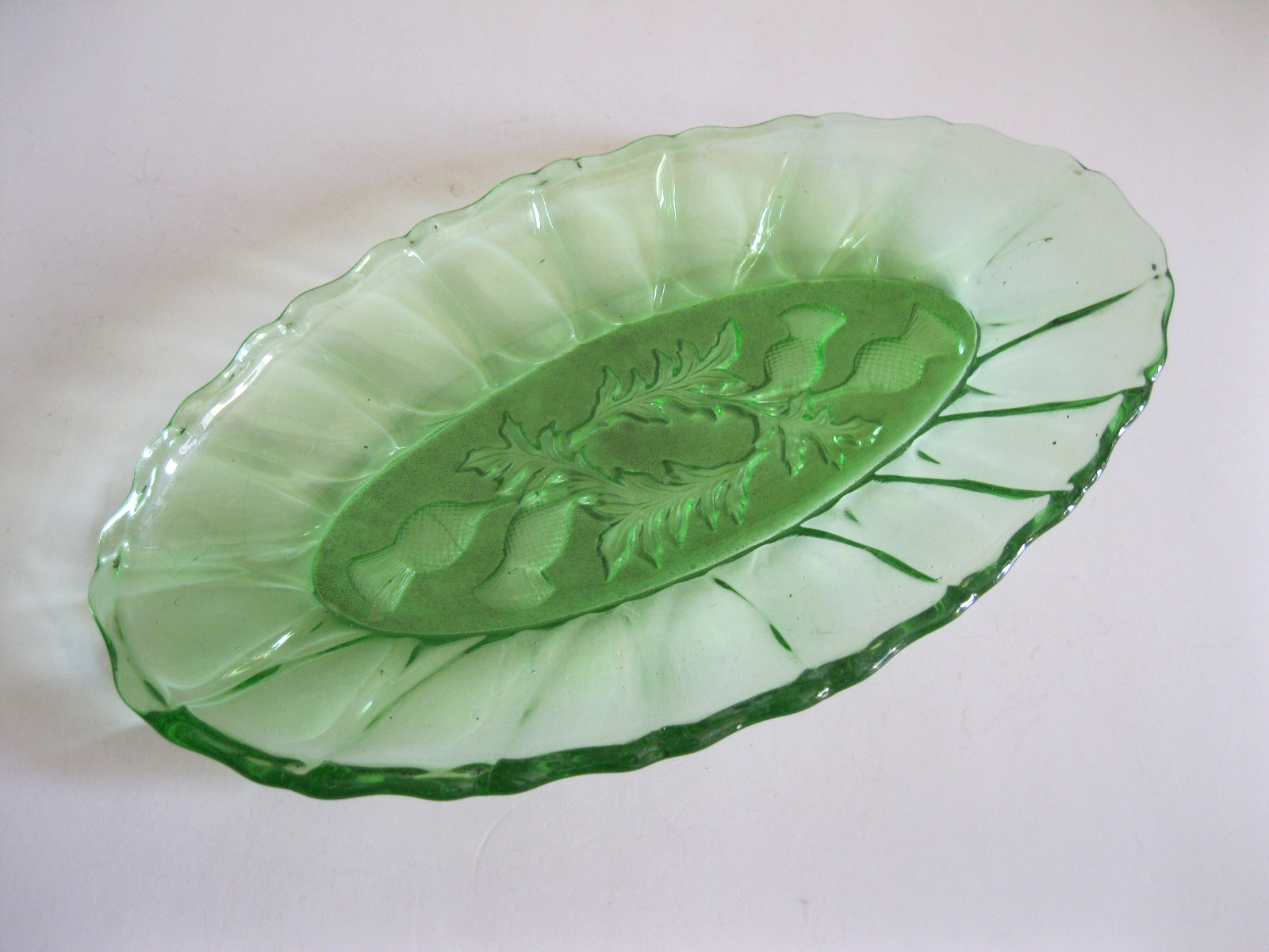 Oryginalny, stary, szklany, średniej wielkości półmisek osty/ maki. Huta Ząbkowice. Wykonany z białego, przeźroczystego szkła w wysyconym zielonym kolorze, zdobiony po bokach ozdobnym tłoczeniem, dno półmiska szkło prasowane zdobione na całości roślinnym wzorem w osty/maki. Zachowany w wizualnym stanie bardzo dobrym, cały bez uszkodzeń bez rys i wyszczerbień. Polecam !