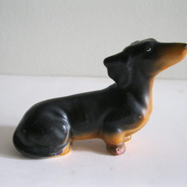 Oryginalna, stara, ceramiczna, bardzo ładna, ceramiczna figurka Pies Jamnik. Wykonana z ceramiki, malowana w czarnym i brązowym kolorze. Zachowana wizualnie w stanie bardzo dobrym minus, posiada odprysk malatury na na prawej łapie i mały drobny na szyi i na brzuszku i chyba nieco przytarta malatura na uszach. Jako całość , te drobne niedoskonałości nie odbierają urody tej bardzo ładnej figurce. Niesygnowana. Polecam !