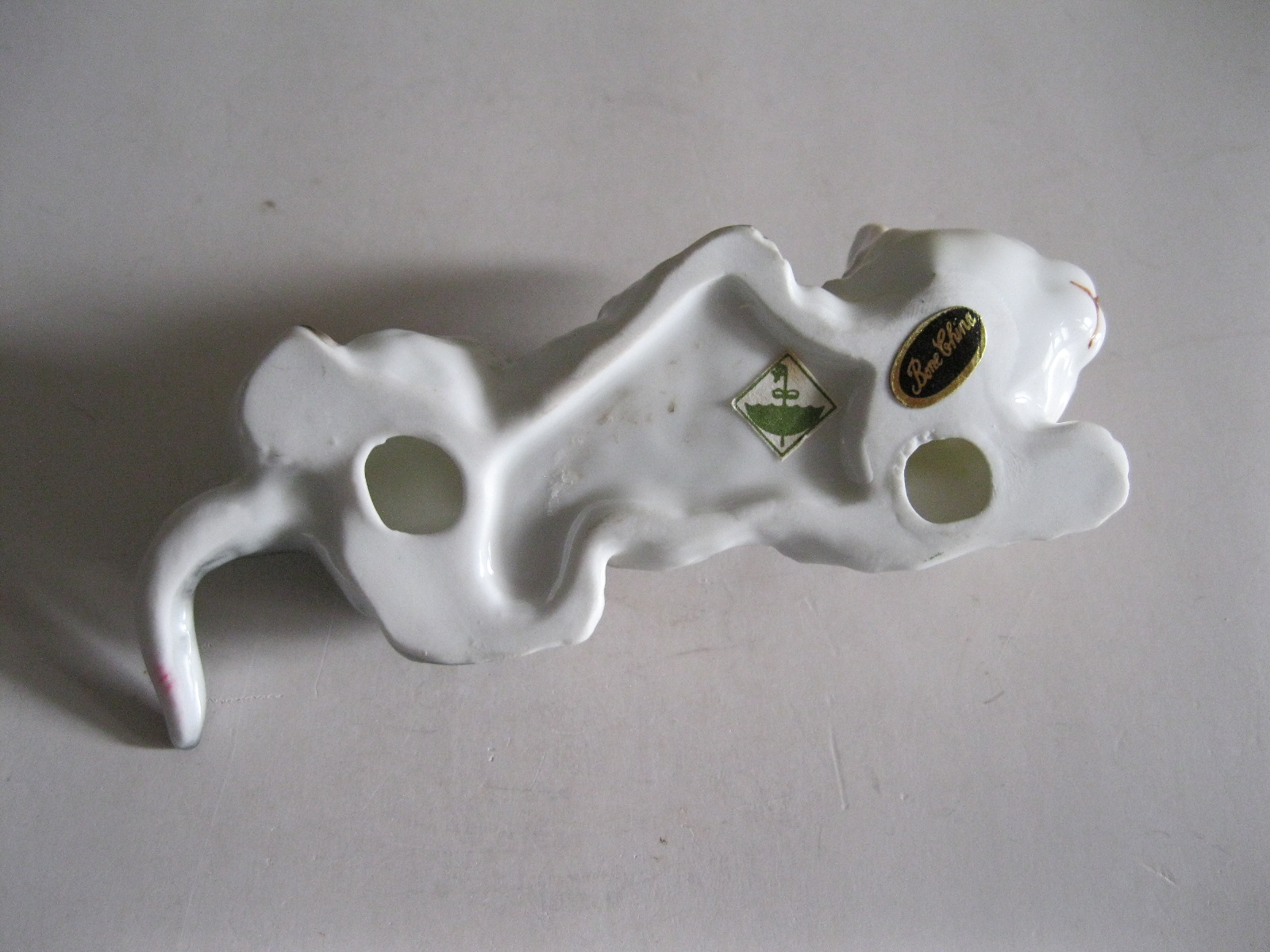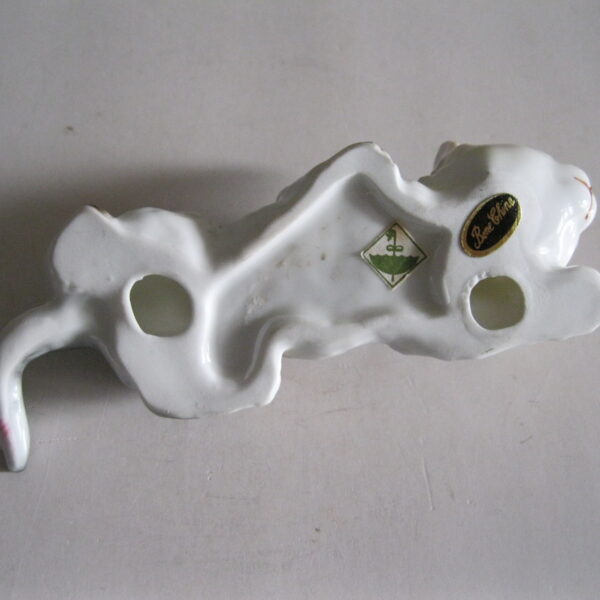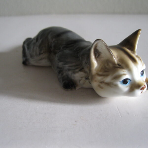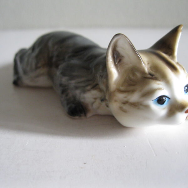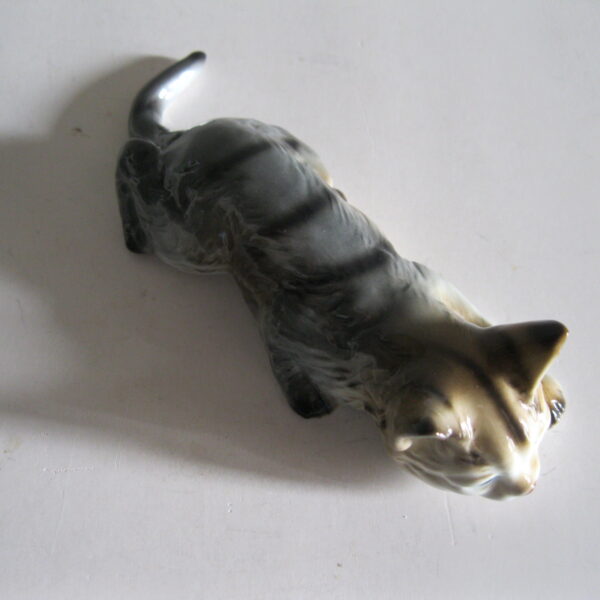 Oryginalna, stara, bardzo ładna, średniej wielkości, porcelanowa, niemiecka figurka Pręgowany kot przyczajony. Wykonana z delikatnej porcelany w białym kolorze, ręcznie malowana w popielato beżowym kolorze, dodatkowo malowana czarnymi pręgami. Bardzo dobrze szkliwiona. Bardzo oryginalny design i forma. Zachowana w stanie bardzo dobrym, cała bez uszkodzeń. Sygnowana. Polecam !