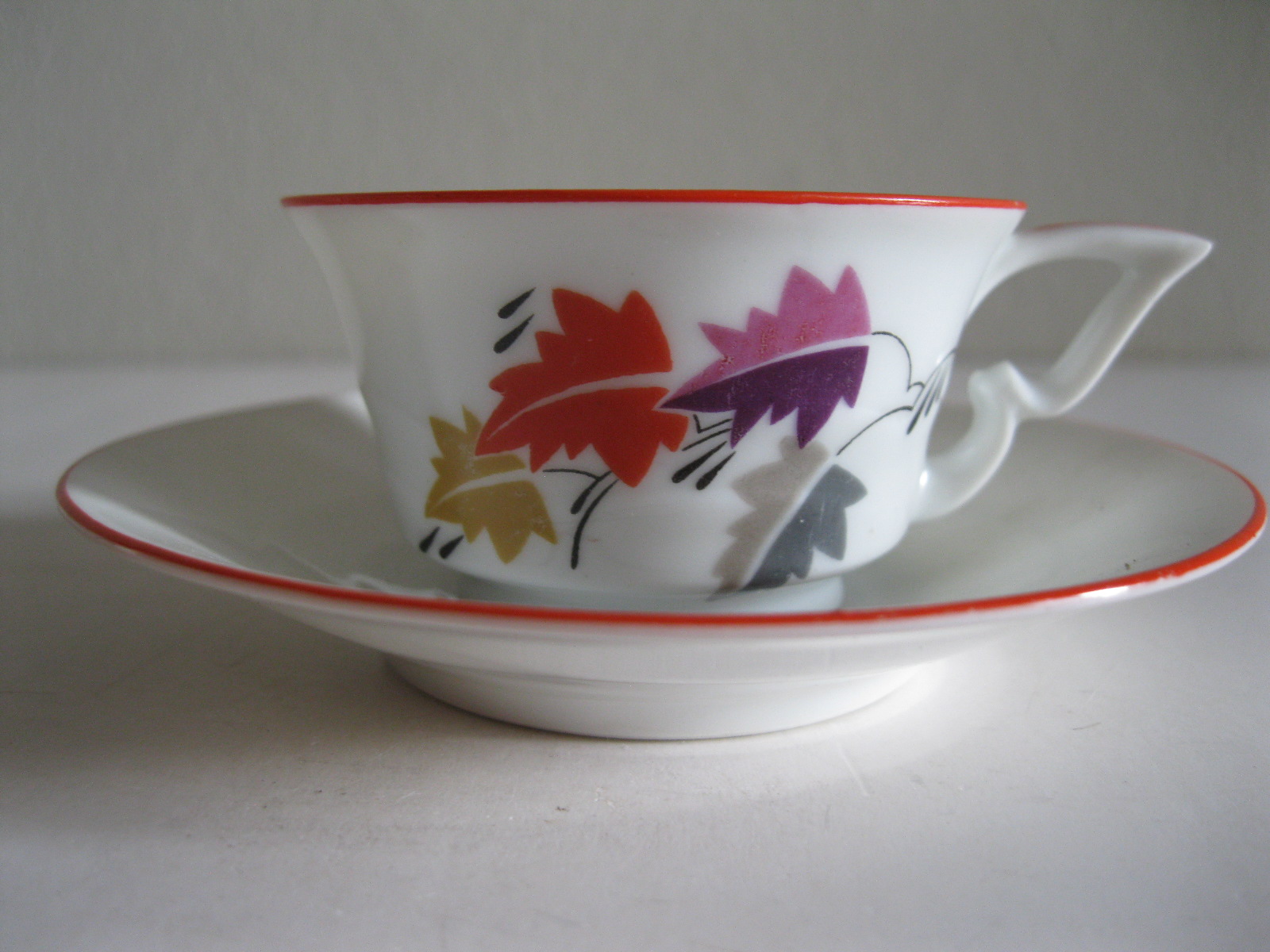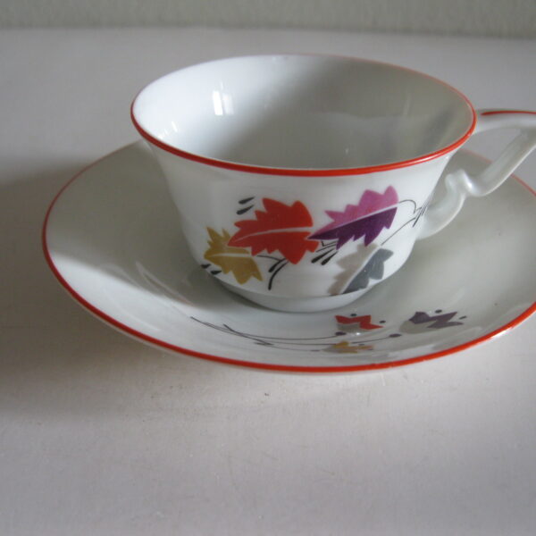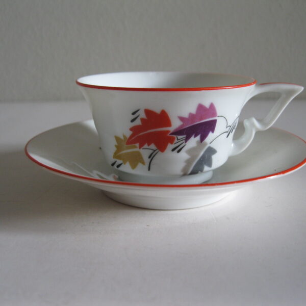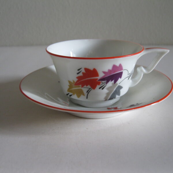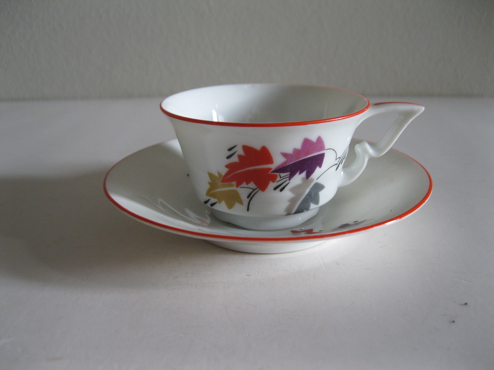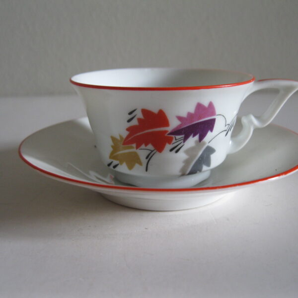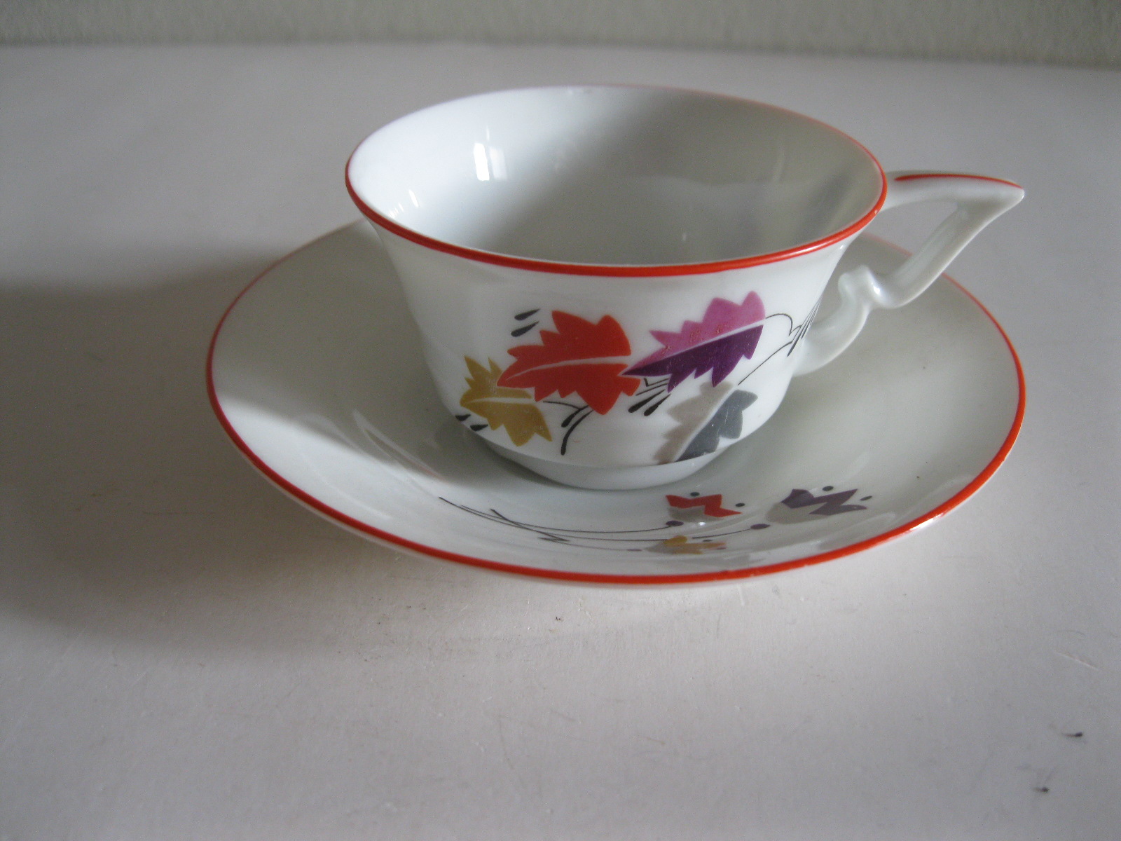 Oryginalny, stara, zabytkowa, kolekcjonerska filiżanka do mokki Czechoslovakia. Filiżanka w komplecie z podstawkiem. Wykonana z doskonałej jakości białej, bardzo delikatnej, prześwitującej porcelany, zdobiona finezyjnym reliefowym tłoczeniem, ślicznym wzorem roślinnym w kolorowe liście i wykończona pomarańczowym paseczkiem.. Zachowana w stanie bardzo dobrym, cała bez uszkodzeń. Sygnowana. Polecam !