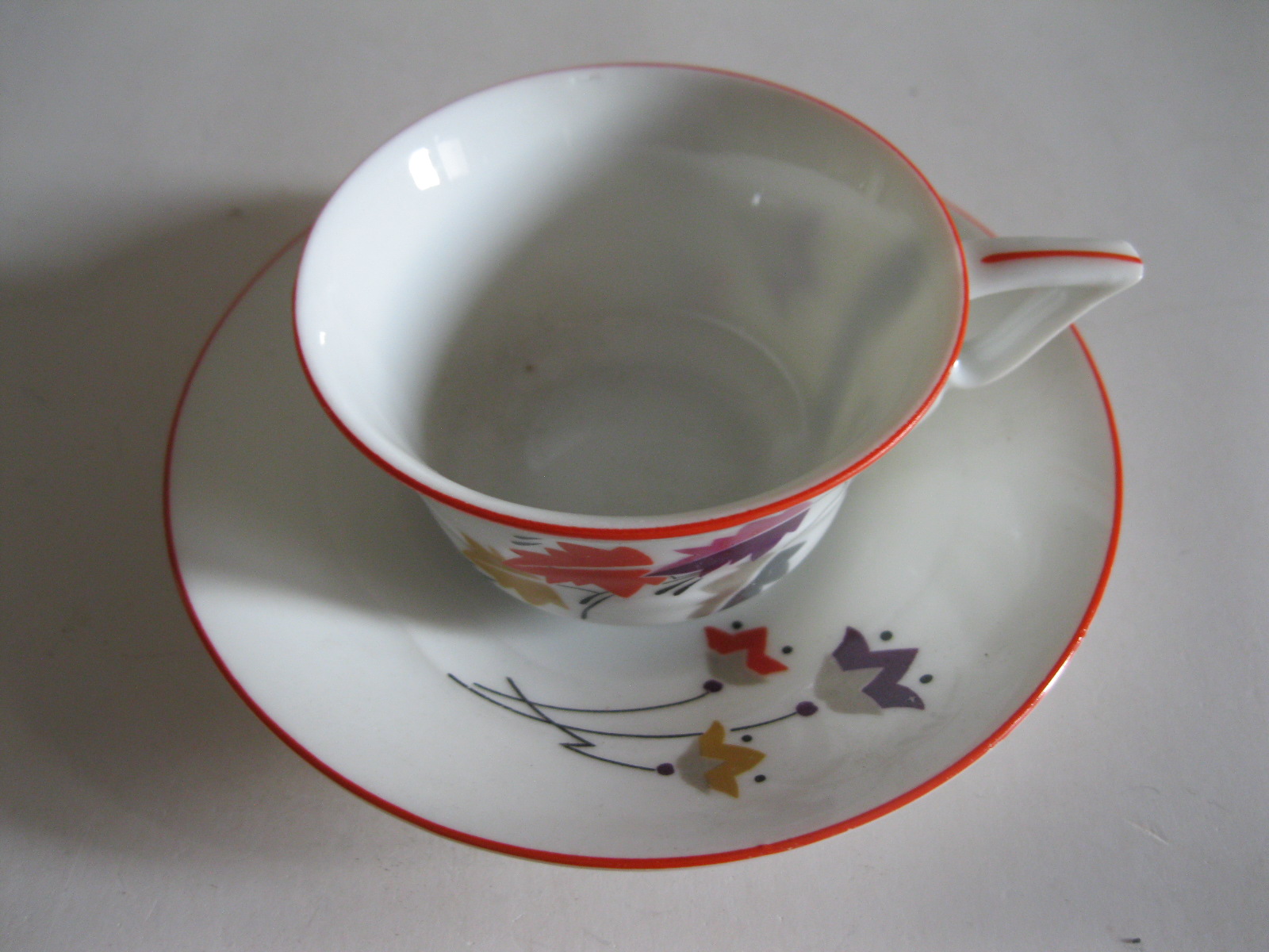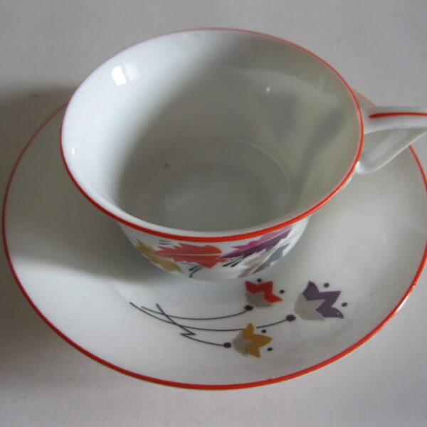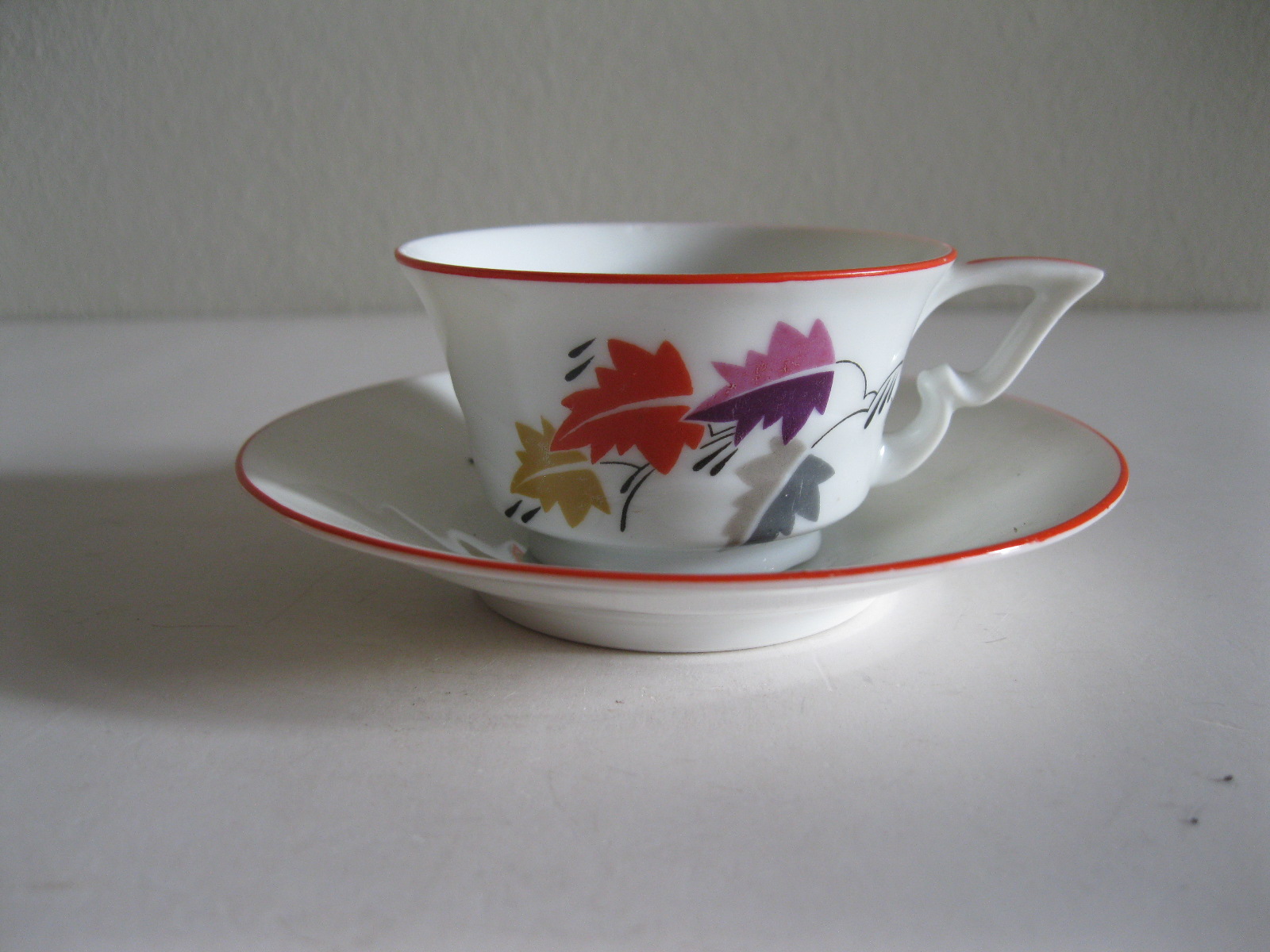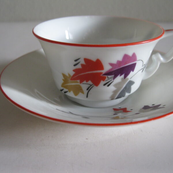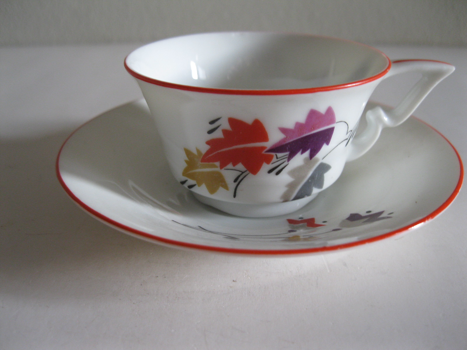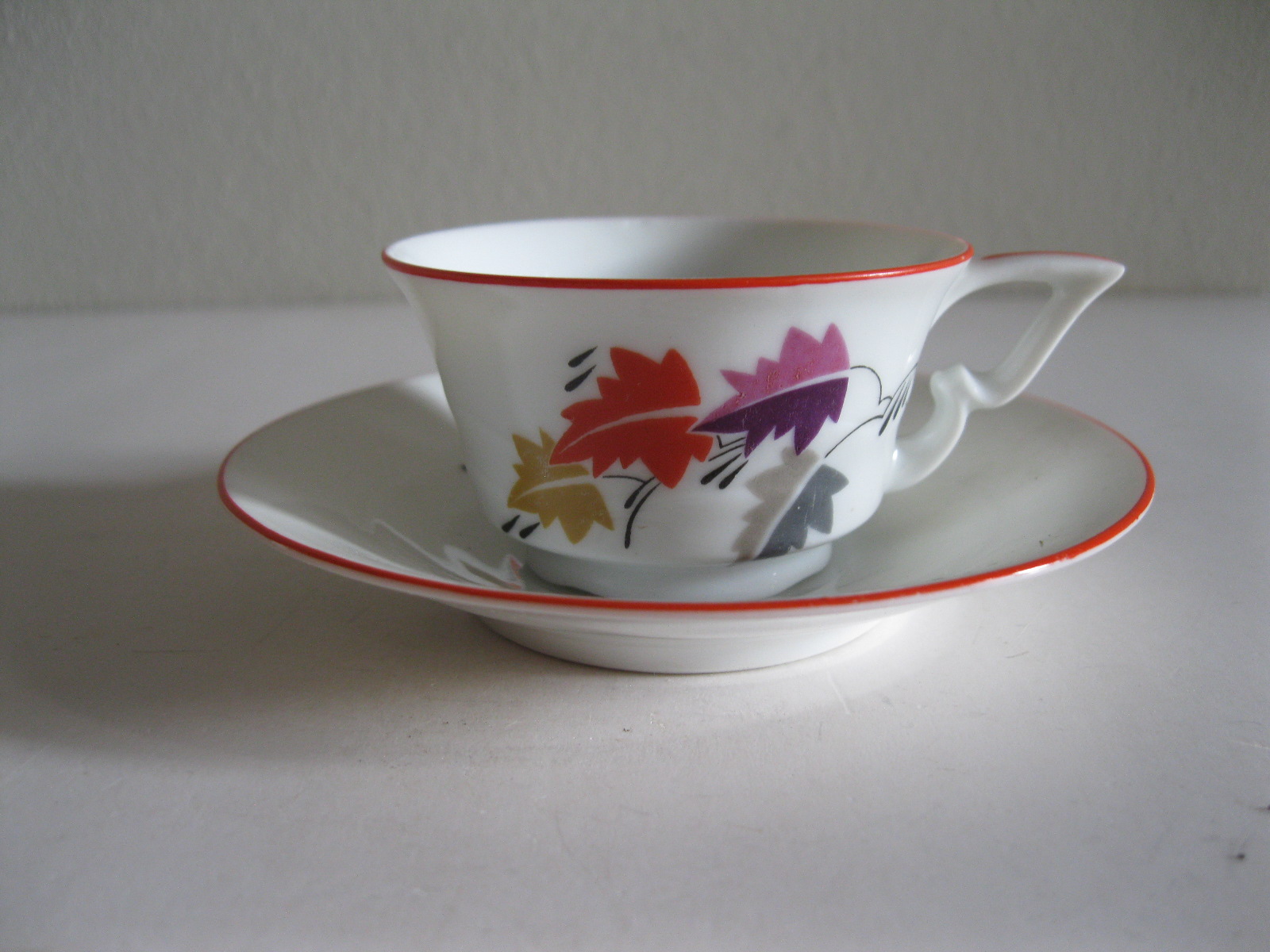 Oryginalny, stara, zabytkowa, kolekcjonerska filiżanka do mokki Czechoslovakia. Filiżanka w komplecie z podstawkiem. Wykonana z doskonałej jakości białej, bardzo delikatnej, prześwitującej porcelany, zdobiona finezyjnym reliefowym tłoczeniem, ślicznym wzorem roślinnym w kolorowe liście i wykończona pomarańczowym paseczkiem.. Zachowana w stanie bardzo dobrym, cała bez uszkodzeń. Sygnowana. Polecam !
