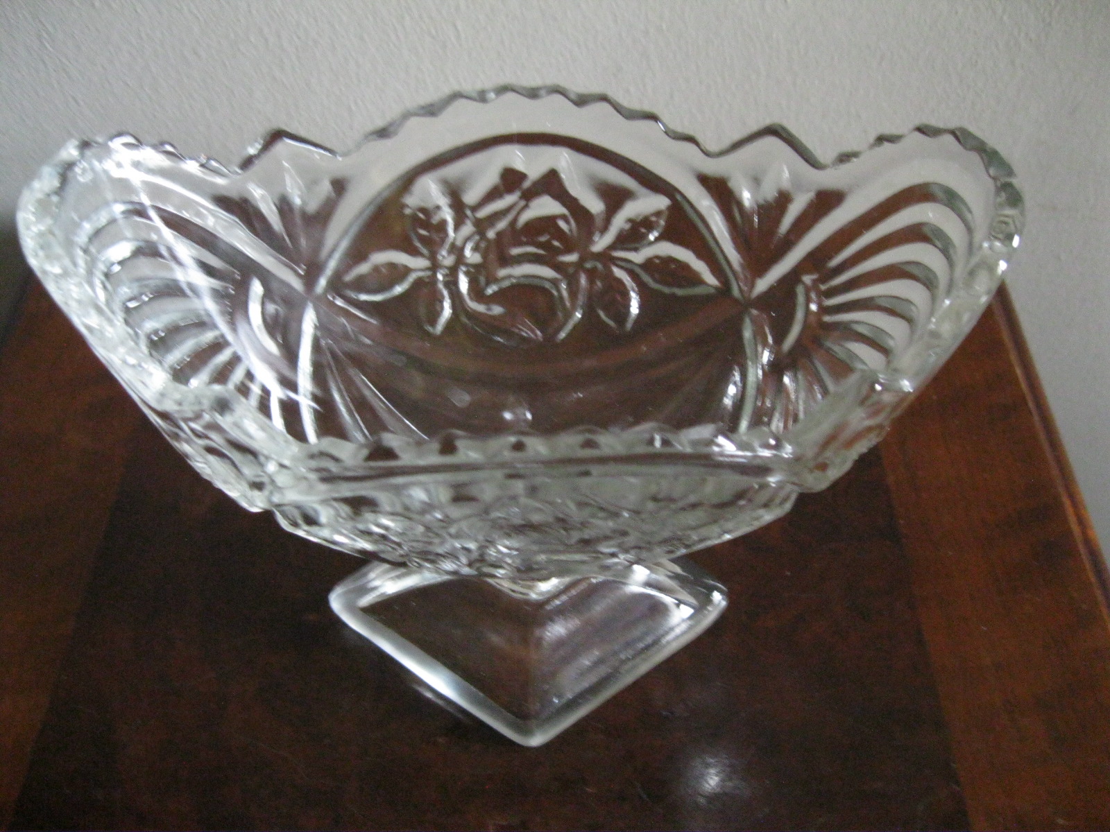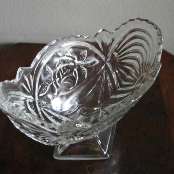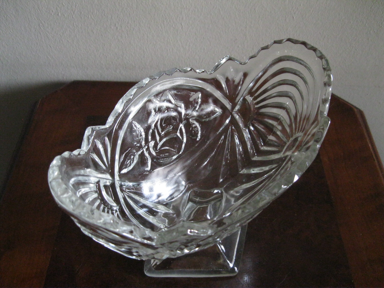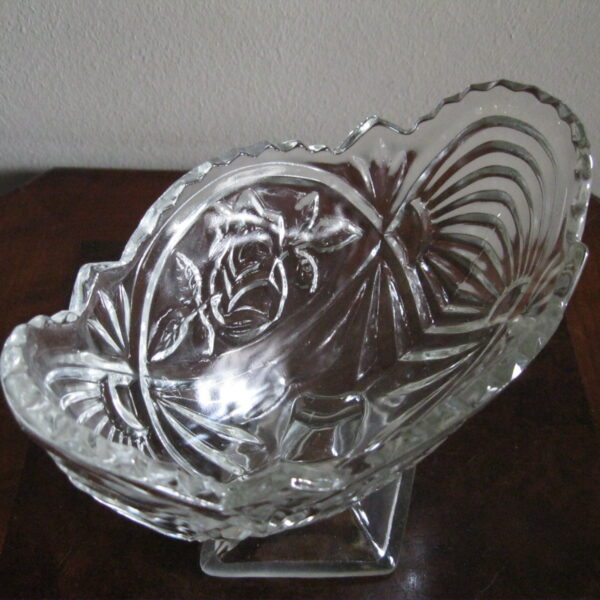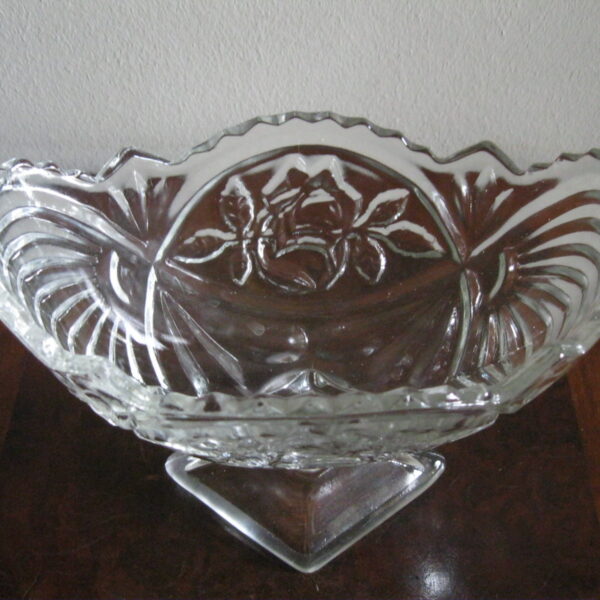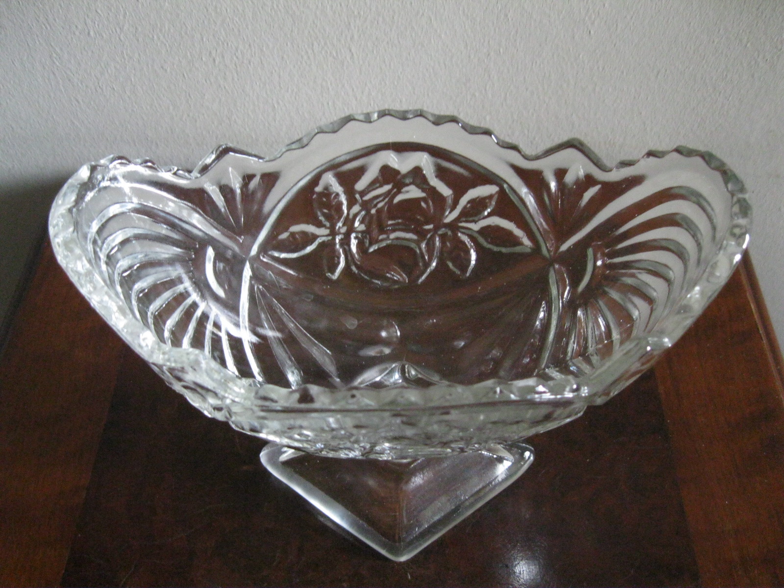 Oryginalna, stara, przepiękna, patera z różą na nodze huta Ząbkowice. Wykonana z przeźroczystego, dobrej jakości, grubego szkła w białym, przeźroczystym kolorze, zdobiona od zewnątrz bogatym, reliefowym tłoczeniem, osadzona na kształtnej nodze. Zachowana w stanie bardzo dobrym/witrynowym, cała bez uszkodzeń. Polecam !