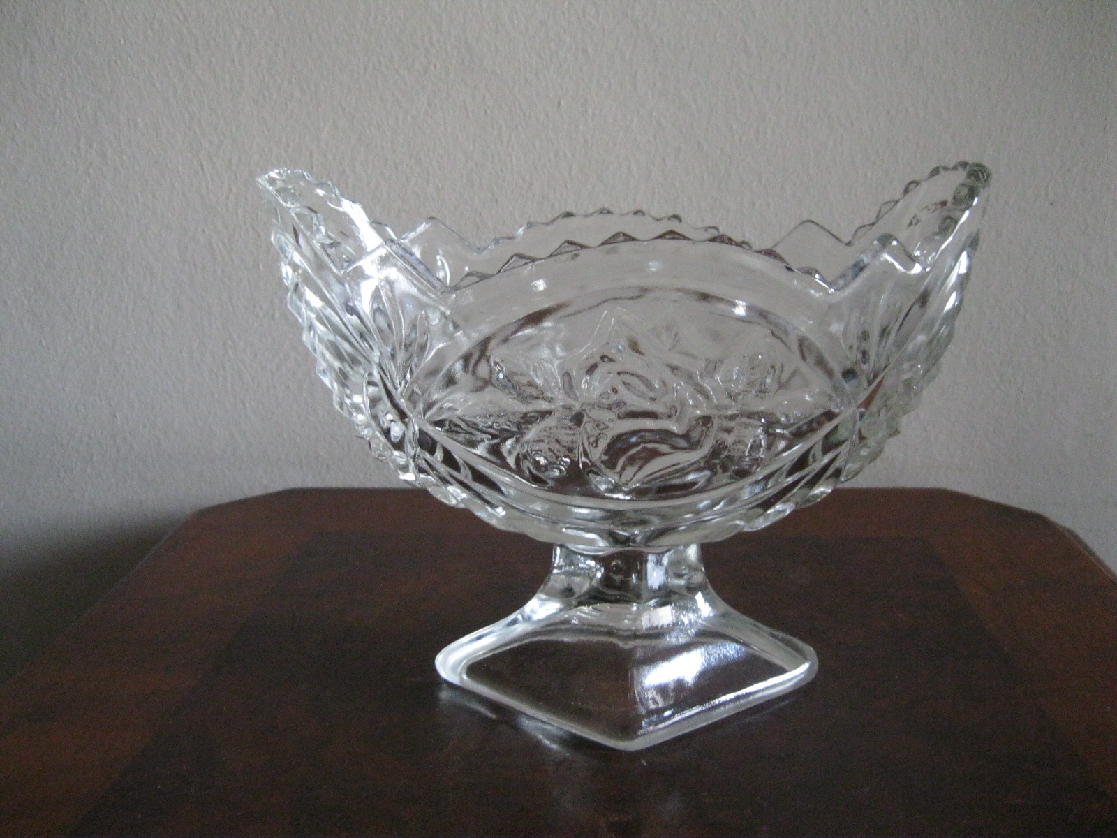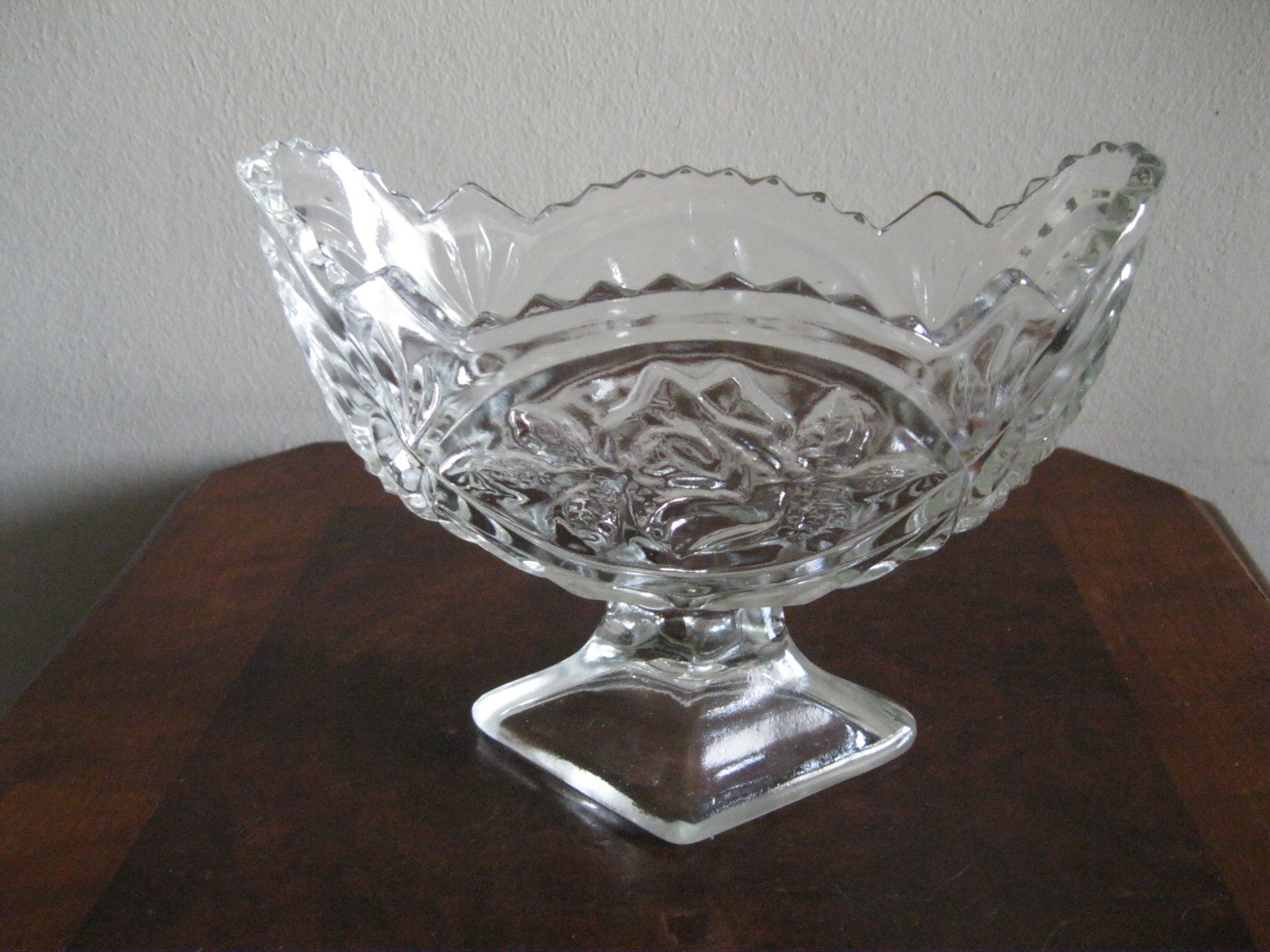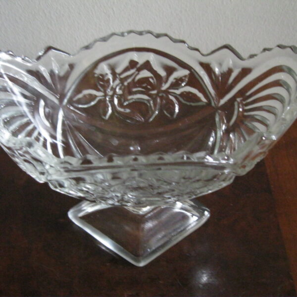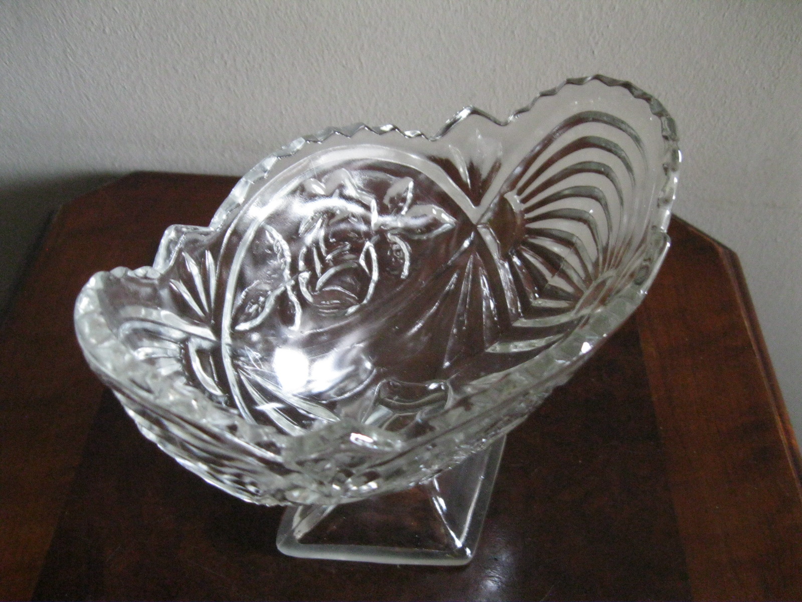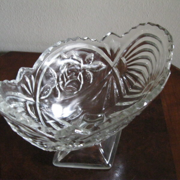 Oryginalna, stara, przepiękna, patera z różą na nodze huta Ząbkowice. Wykonana z przeźroczystego, dobrej jakości, grubego szkła w białym, przeźroczystym kolorze, zdobiona od zewnątrz bogatym, reliefowym tłoczeniem, osadzona na kształtnej nodze. Zachowana w stanie bardzo dobrym/witrynowym, cała bez uszkodzeń. Polecam !