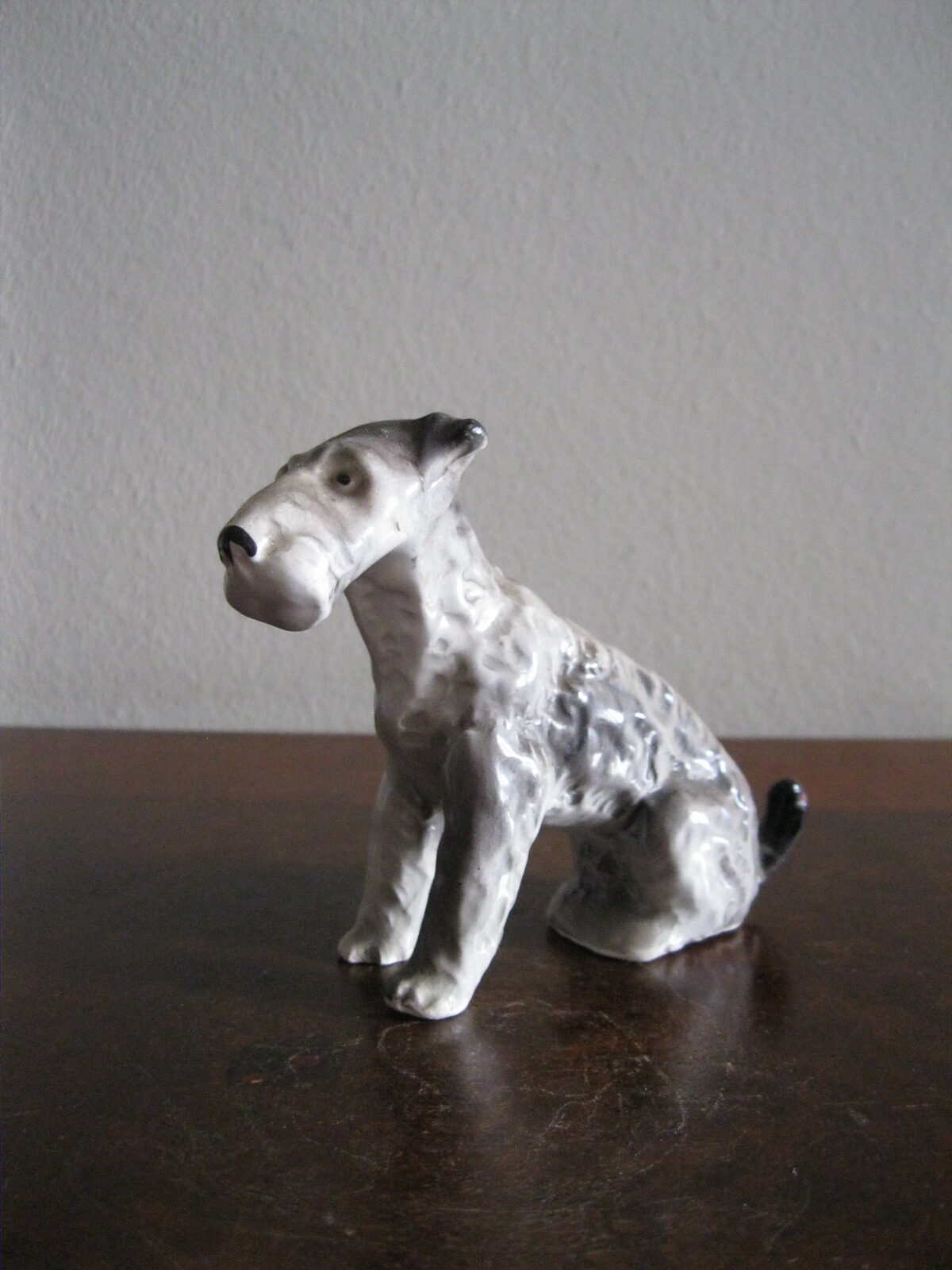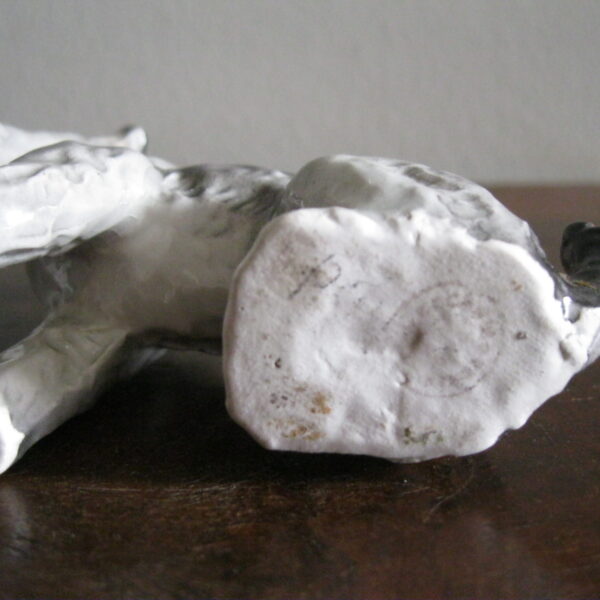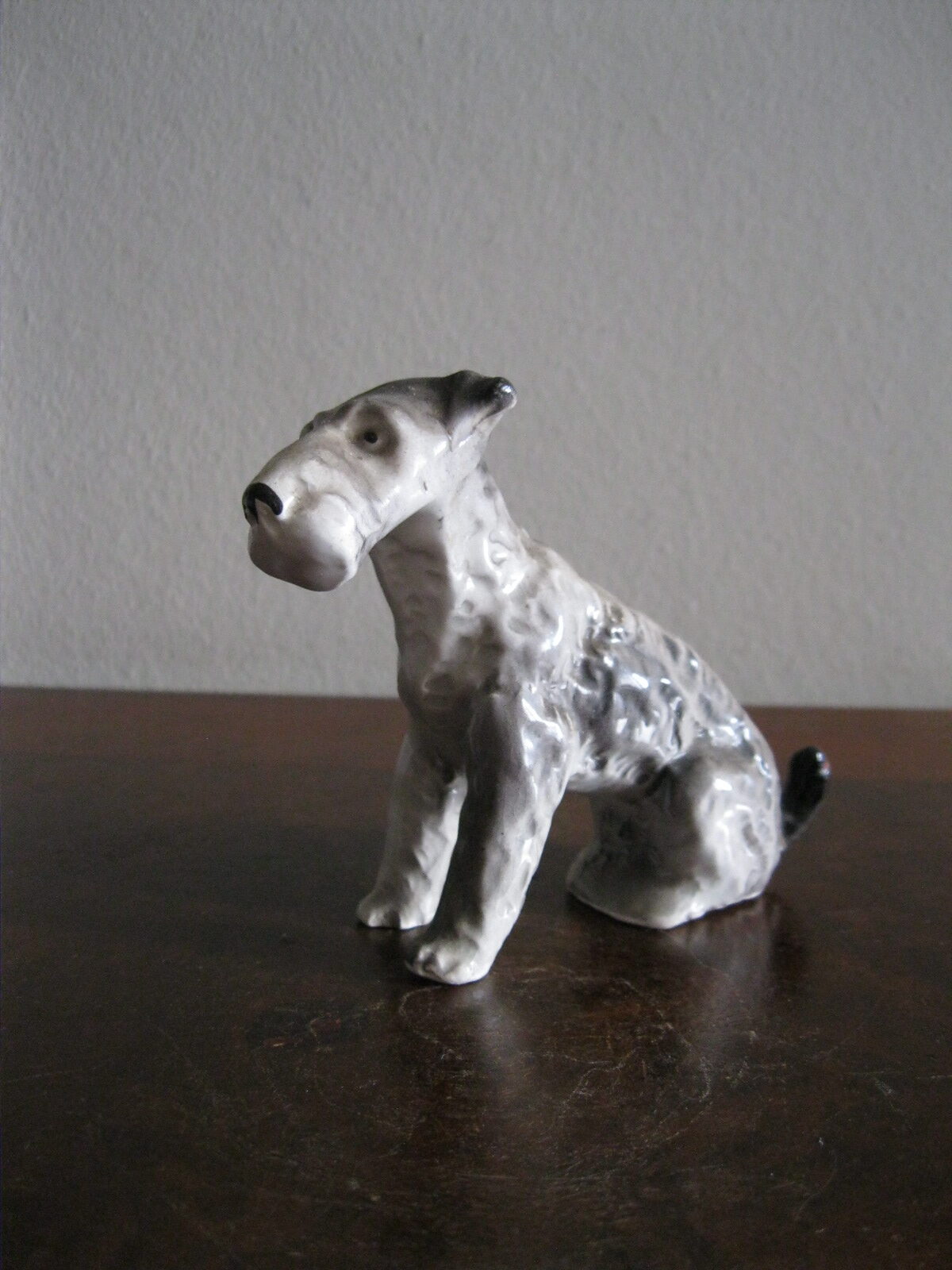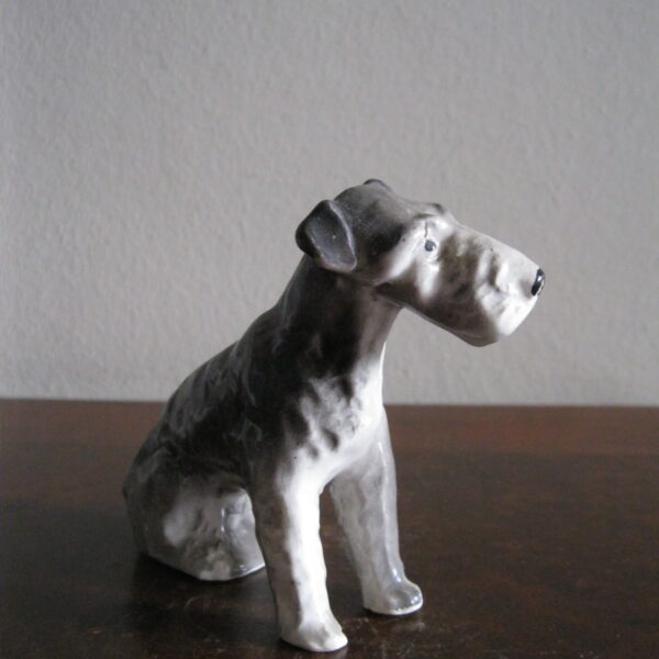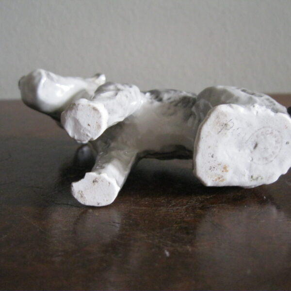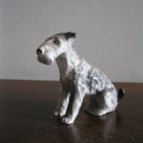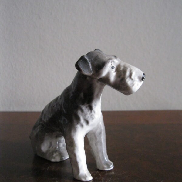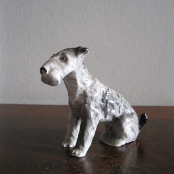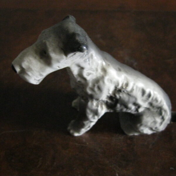 Oryginalna, bardzo stara, wyjątkowo ładna, średniej wielkości, porcelanowa, figurka Pies Terier siedzący. Wykonana z delikatnej porcelany w białym kolorze, ręcznie malowana w popielatym kolorze, bardzo dobrze odwzorowana szorstka sierść psa. Doskonały design design i forma. Zachowana wizualnie w stanie bardzo dobrym, posiada niewielki odprysk na prawej łapie ale w przypadku tej figurki nie ma to znaczenia. Sygnowana starą mało czytelną szarą sygnaturą w kółeczku. Polecam !
