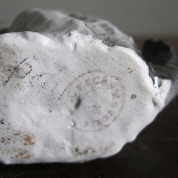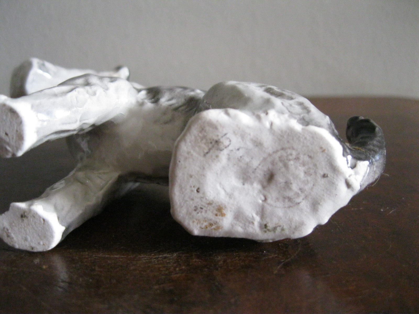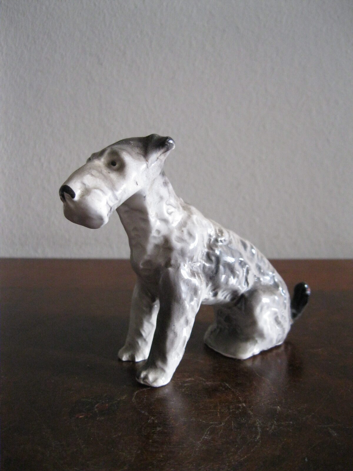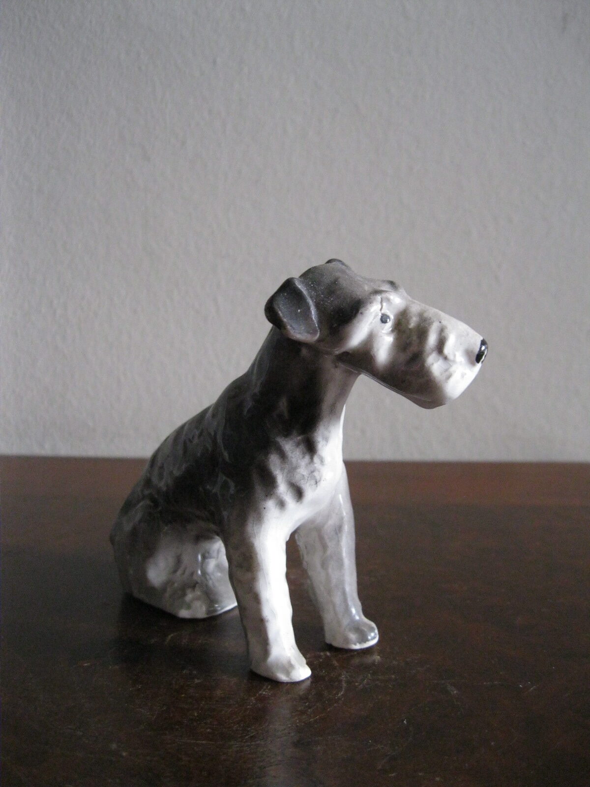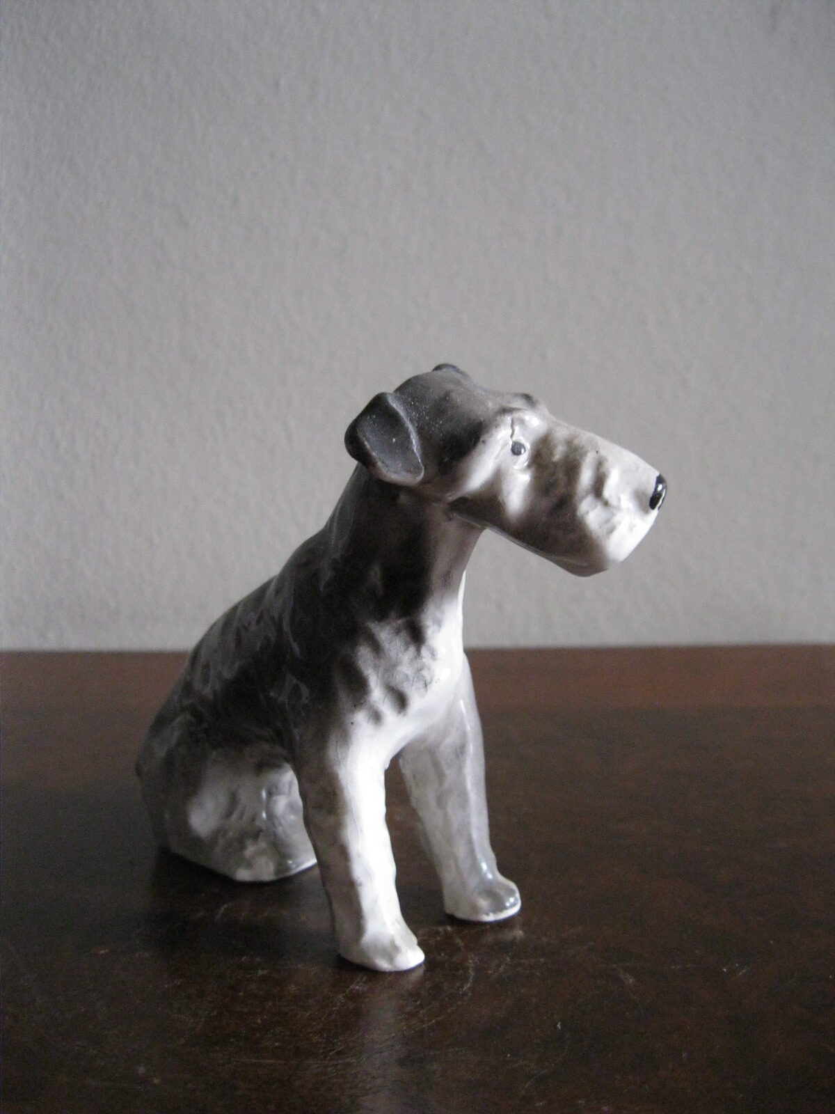 Oryginalna, bardzo stara, wyjątkowo ładna, średniej wielkości, porcelanowa, figurka Pies Terier siedzący. Wykonana z delikatnej porcelany w białym kolorze, ręcznie malowana w popielatym kolorze, bardzo dobrze odwzorowana szorstka sierść psa. Doskonały design design i forma. Zachowana wizualnie w stanie bardzo dobrym, posiada niewielki odprysk na prawej łapie ale w przypadku tej figurki nie ma to znaczenia. Sygnowana starą mało czytelną szarą sygnaturą w kółeczku. Polecam !