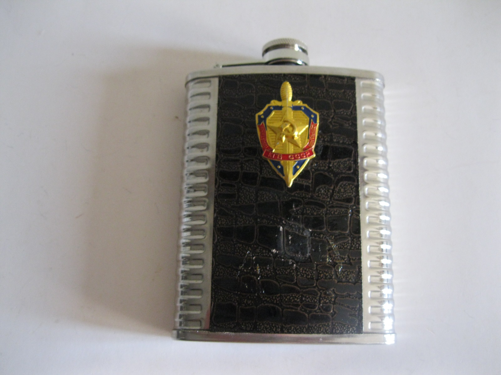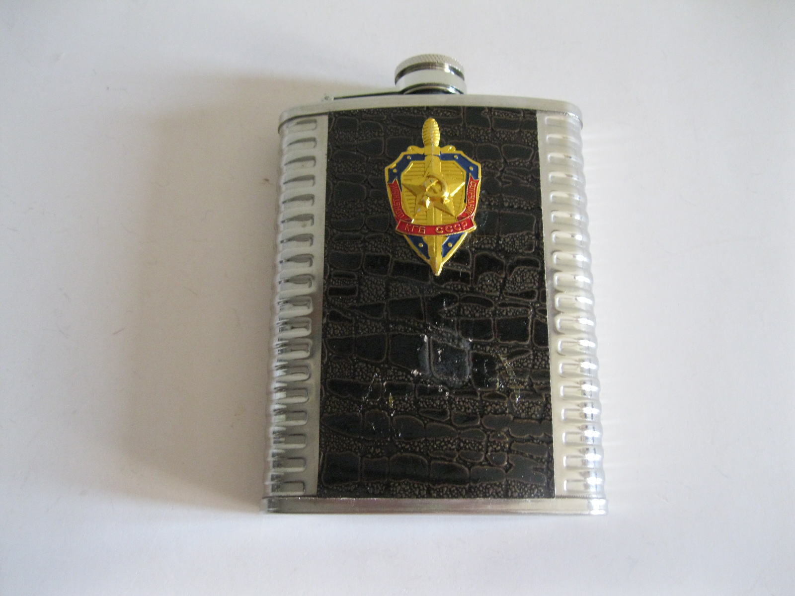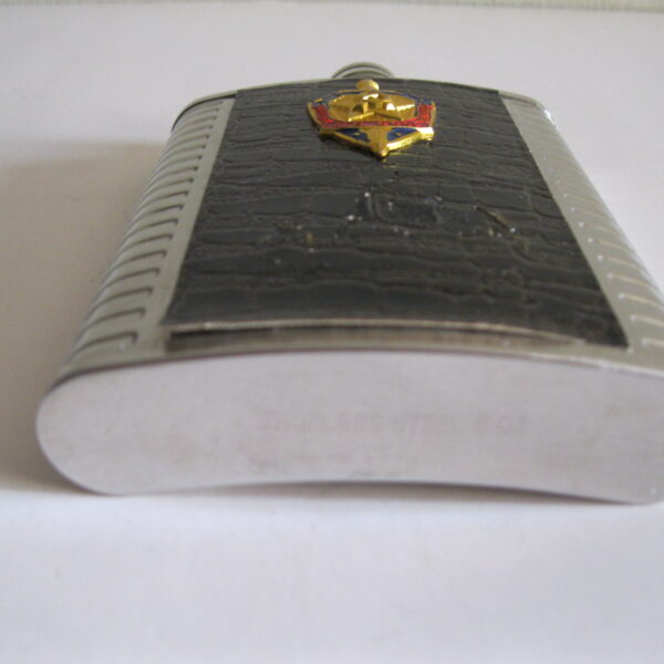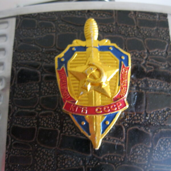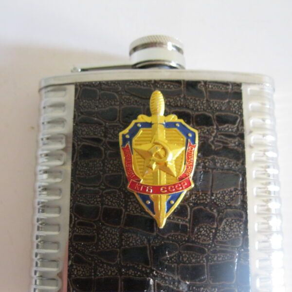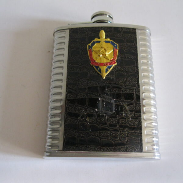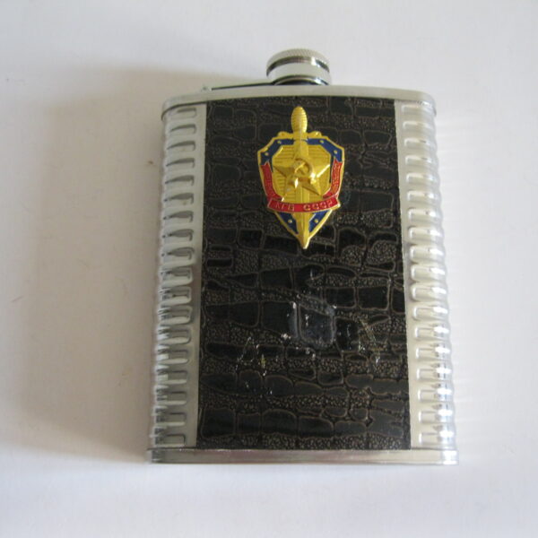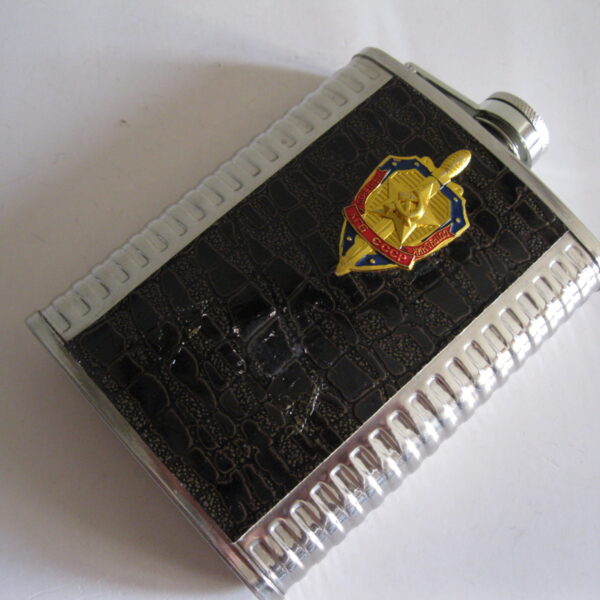 Oryginalna, stara, metalowa/stalowa butelka piersiówka do wódki z lat 80 – 90 – tych. Wykonana ze stali, dekorowana dwustronnie brązową, wężową skórą, złotą odznaką z gwiazdą i wypukłym sierpem i młotem oraz wypukłym napisem KGB CCCP. Zachowana jako całość w stanie bardzo dobrym, posiada, niewielkie plackowe zmatowienie ozdobnej skórki pod odznaką. Nadal w pełni użytkowa. Polecam !
