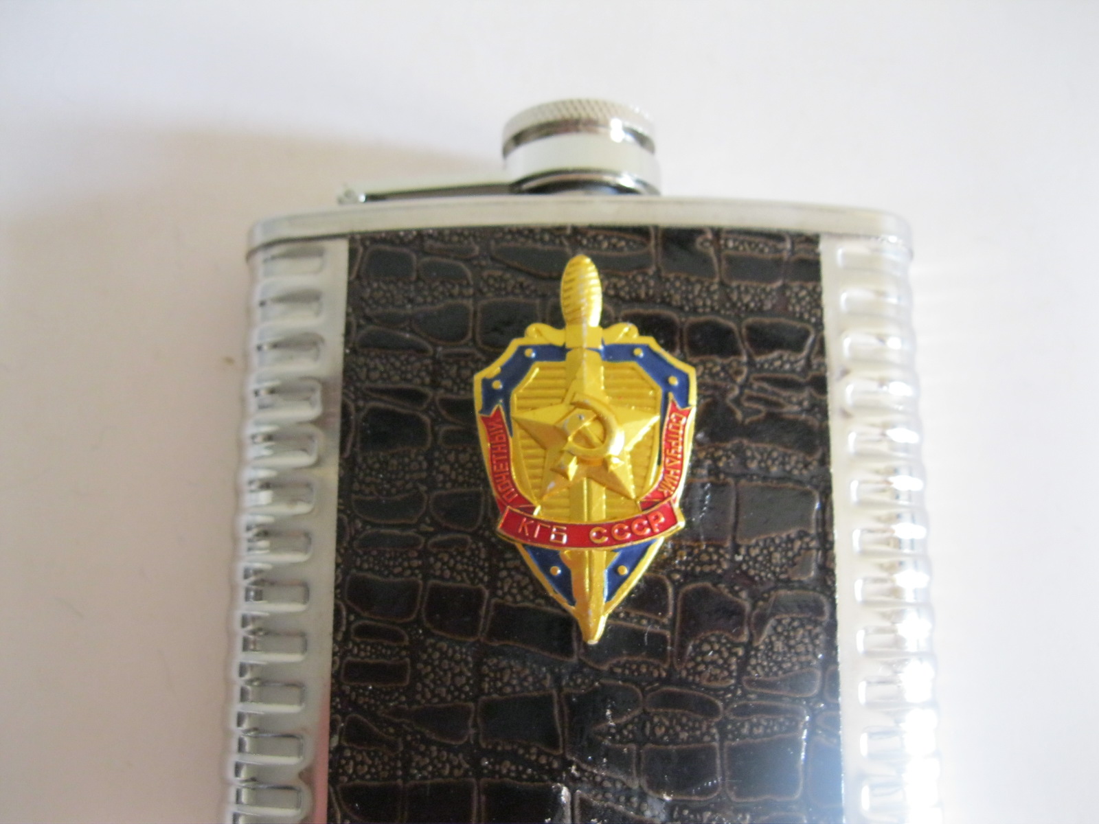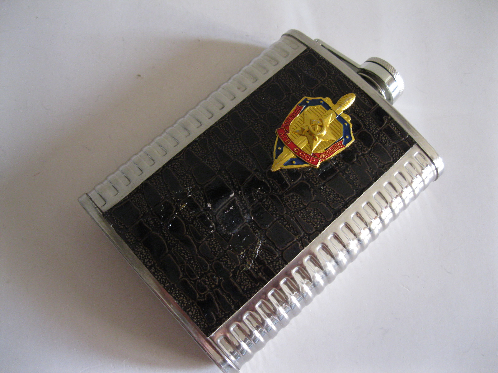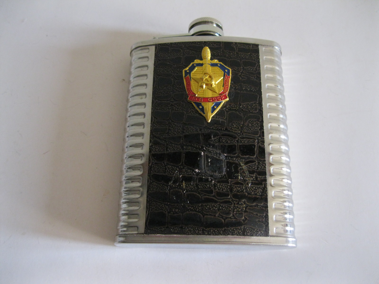 Oryginalna, stara, metalowa/stalowa butelka piersiówka do wódki z lat 80 – 90 – tych. Wykonana ze stali, dekorowana dwustronnie brązową, wężową skórą, złotą odznaką z gwiazdą i wypukłym sierpem i młotem oraz wypukłym napisem KGB CCCP. Zachowana jako całość w stanie bardzo dobrym, posiada, niewielkie plackowe zmatowienie ozdobnej skórki pod odznaką. Nadal w pełni użytkowa. Polecam !