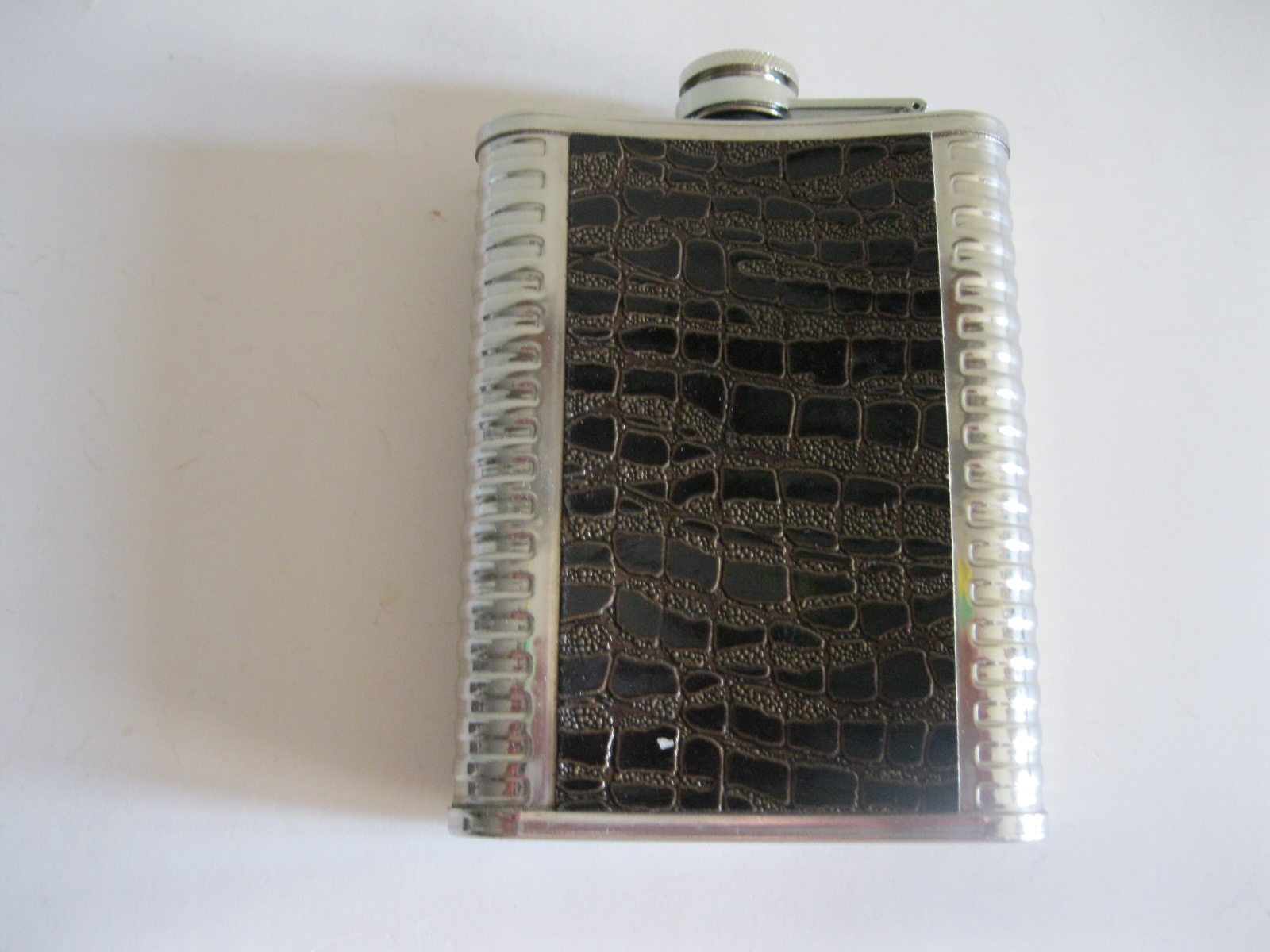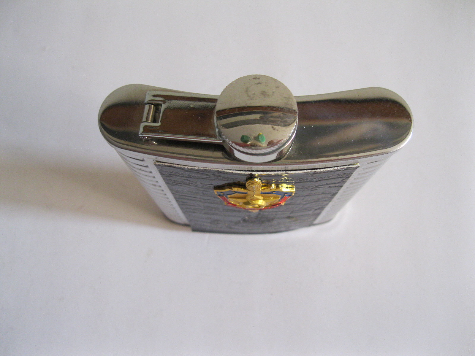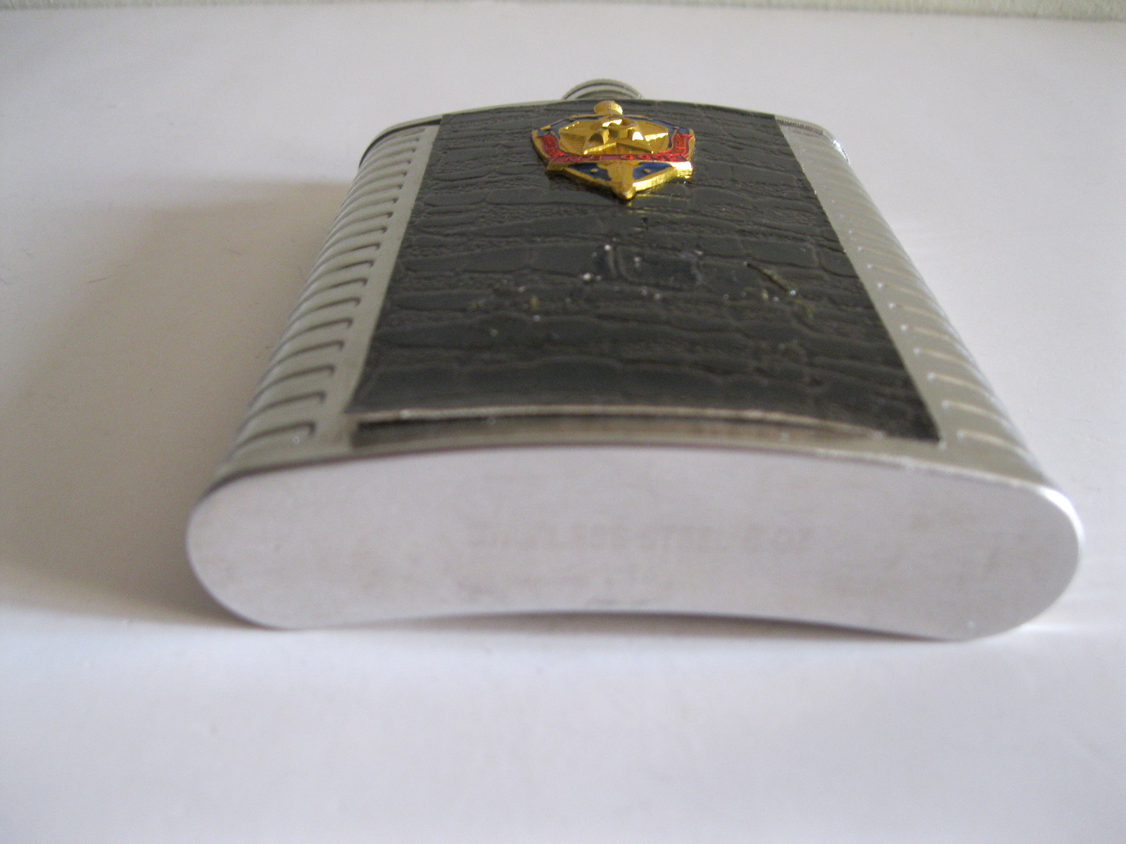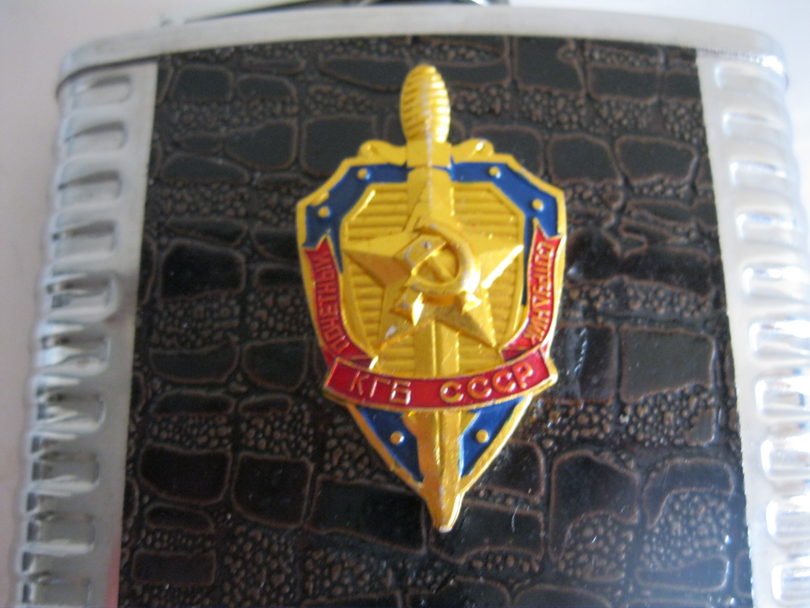 Oryginalna, stara, metalowa/stalowa butelka piersiówka do wódki z lat 80 – 90 – tych. Wykonana ze stali, dekorowana dwustronnie brązową, wężową skórą, złotą odznaką z gwiazdą i wypukłym sierpem i młotem oraz wypukłym napisem KGB CCCP. Zachowana jako całość w stanie bardzo dobrym, posiada, niewielkie plackowe zmatowienie ozdobnej skórki pod odznaką. Nadal w pełni użytkowa. Polecam !