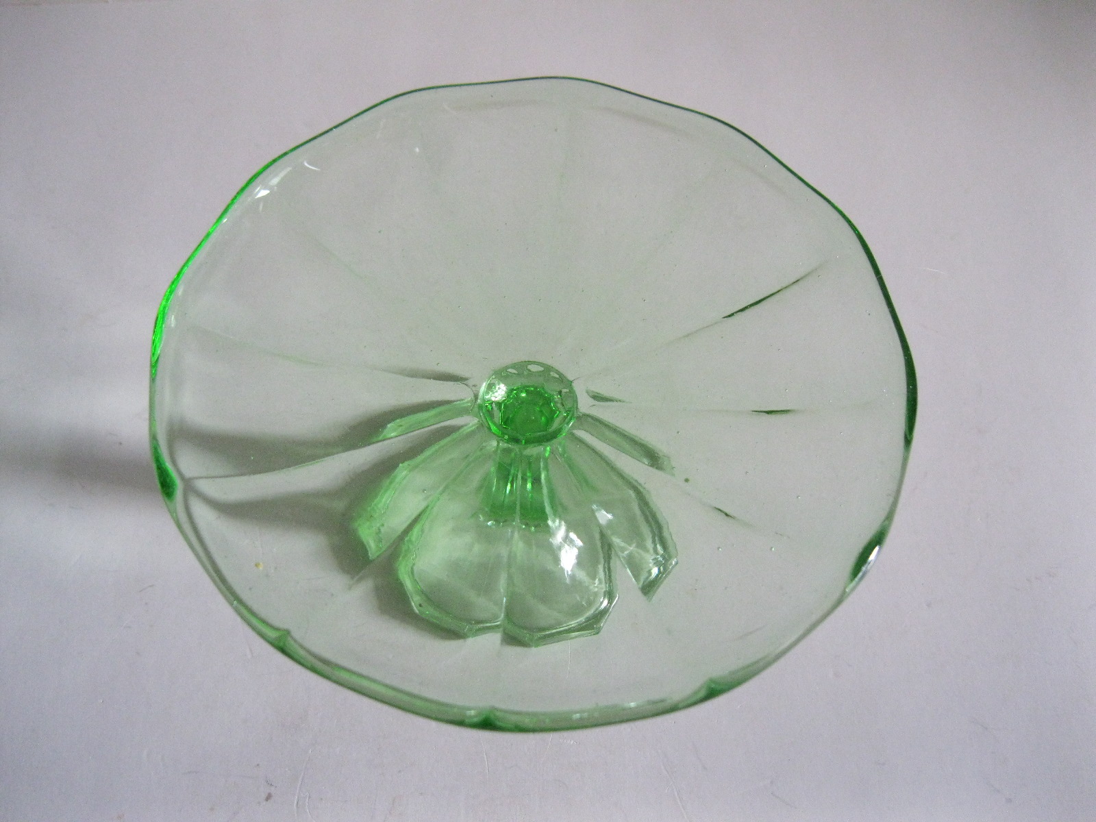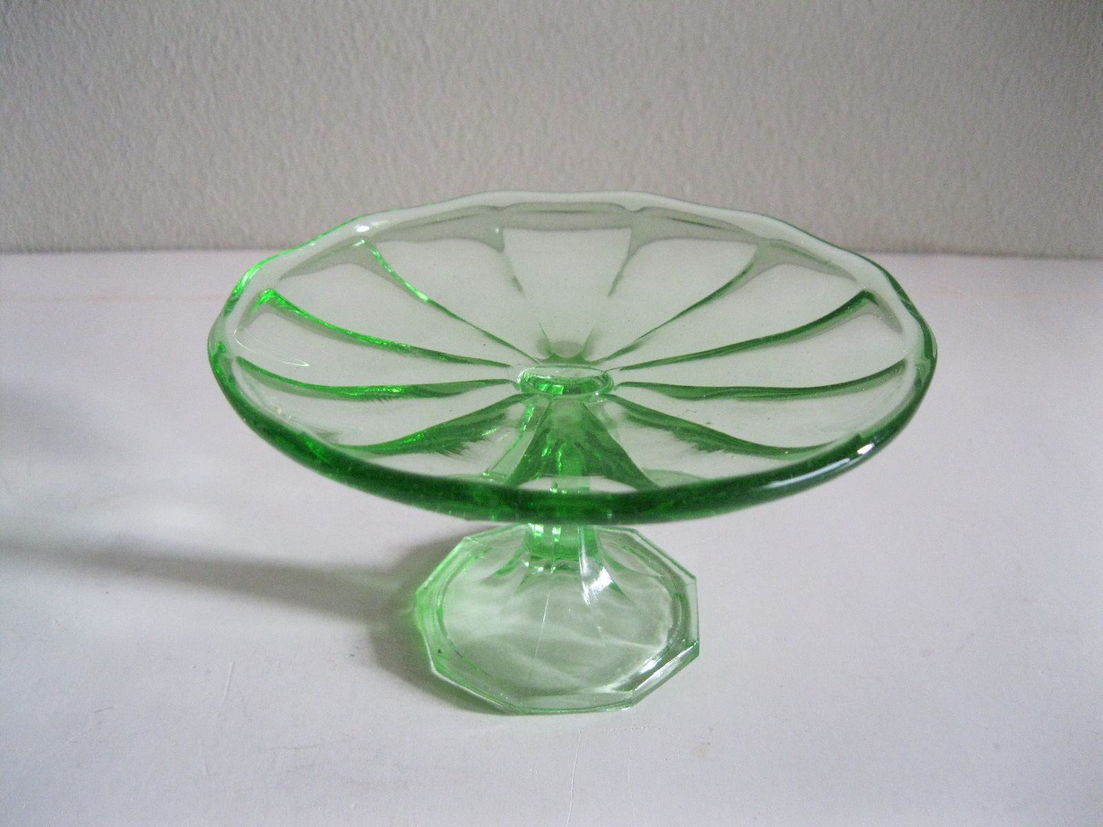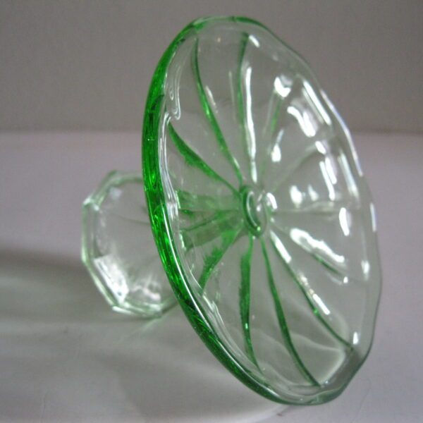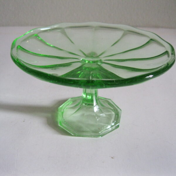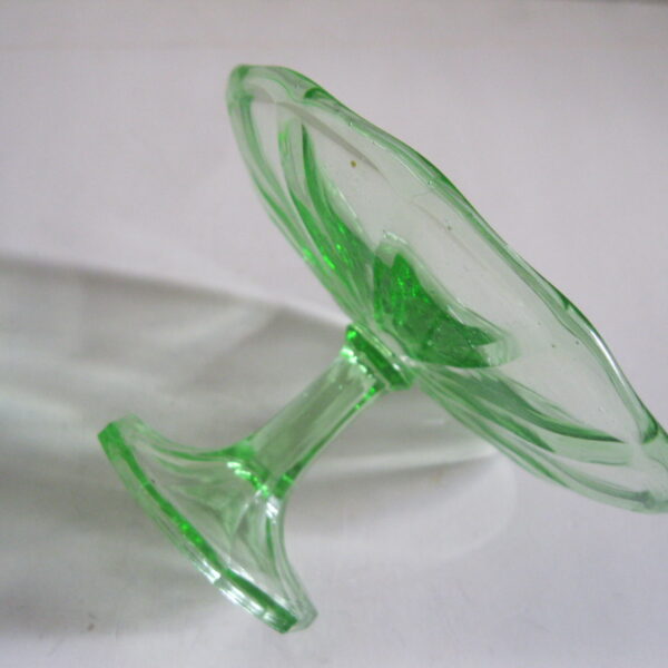 Oryginalna, bardzo dekoracyjna, stara, zielona, nieduża, filigranowa patera na nodze huta Ząbkowice. Wykonana z przeźroczystego szkła w bardzo ładnym, jasnym, świetlistym, zielonym kolorze, zdobiona od zewnątrz bogatym reliefowym tłoczeniem. Na górze wykończona bardzo subtelnym, rozfalowanym rantem ozdobnym. Stopa patery subtelnie zgeometryzowana. Zachowana w stanie bardzo dobrym; cała bez uszkodzeń. Bardzo rzadko obecnie już spotykana. Polecam !