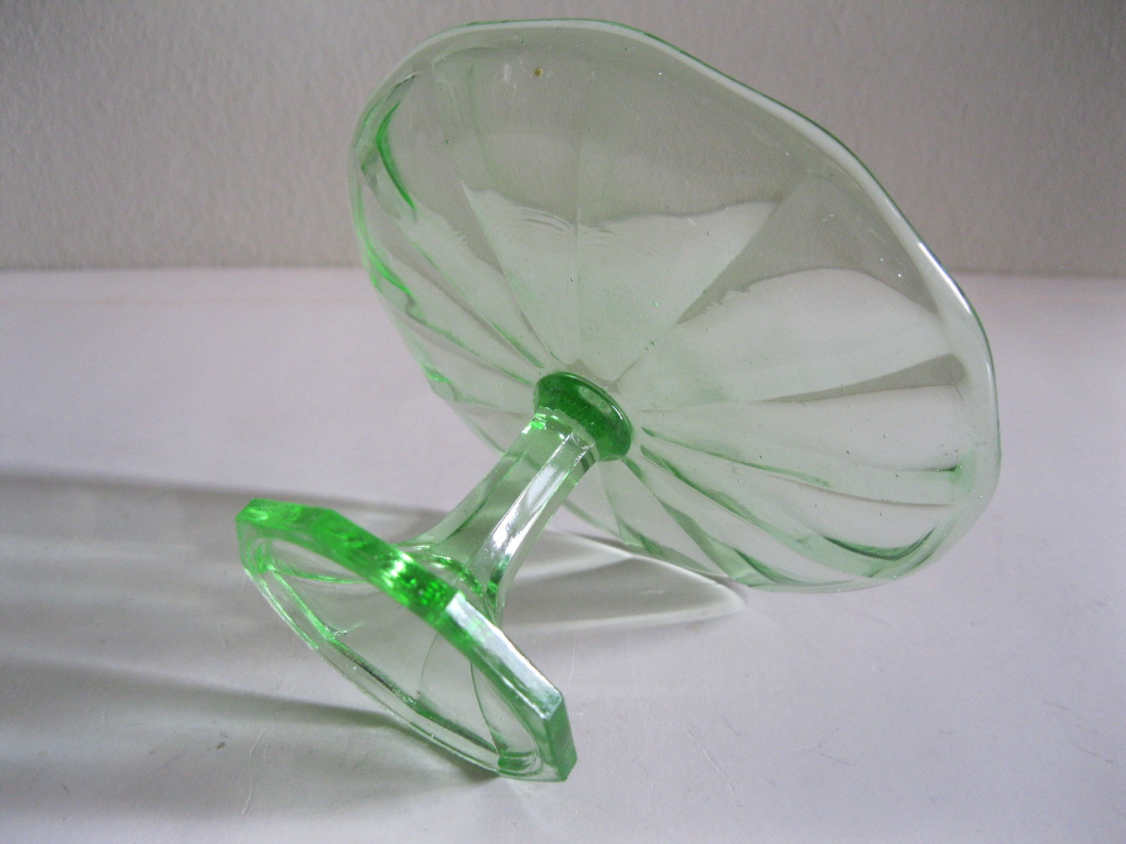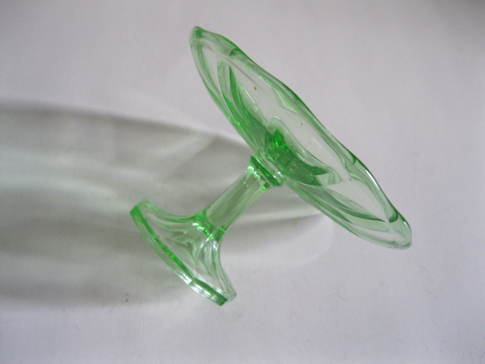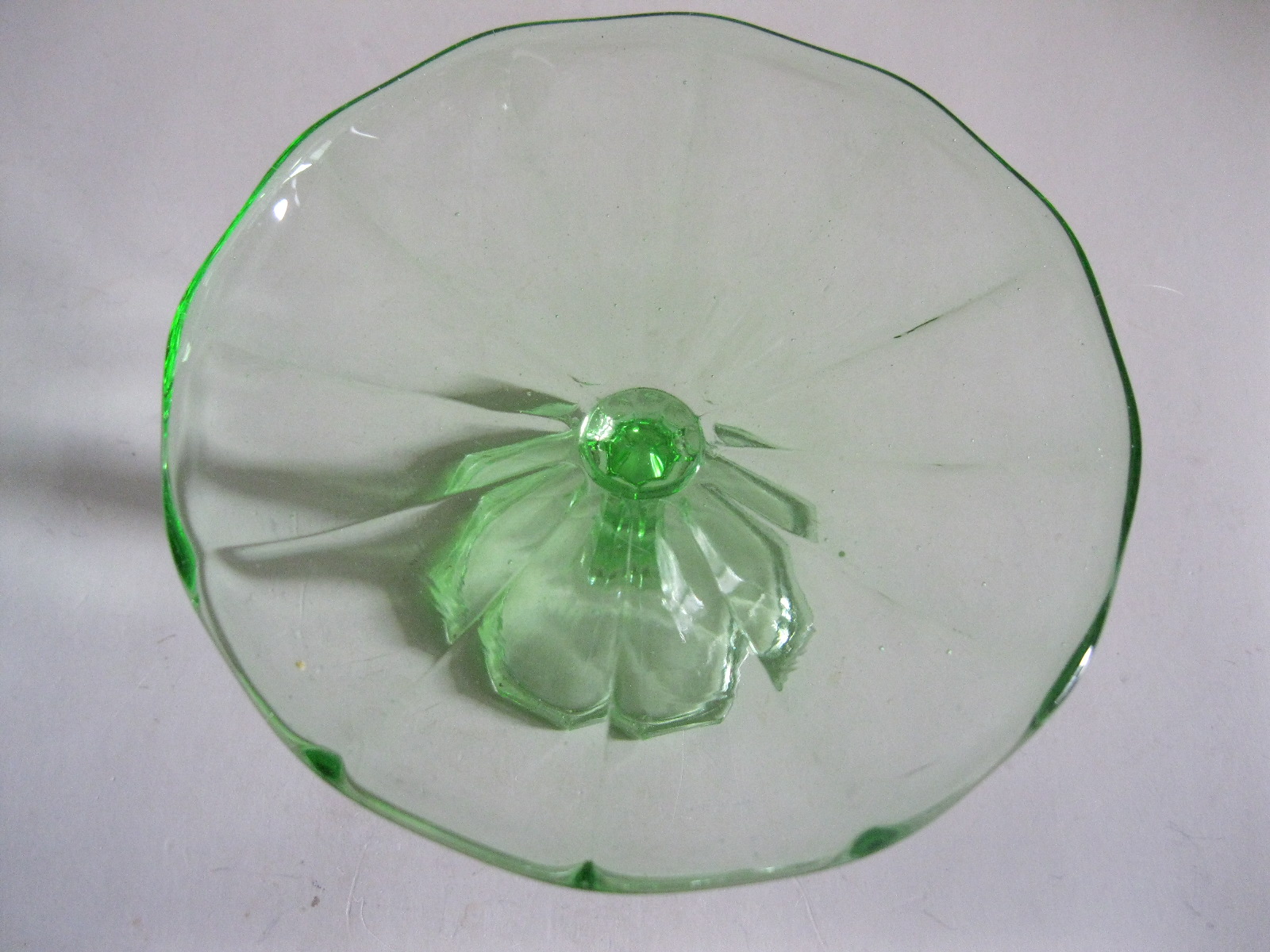Oryginalna, bardzo dekoracyjna, stara, zielona, nieduża, filigranowa patera na nodze huta Ząbkowice. Wykonana z przeźroczystego szkła w bardzo ładnym, jasnym, świetlistym, zielonym kolorze, zdobiona od zewnątrz bogatym reliefowym tłoczeniem. Na górze wykończona bardzo subtelnym, rozfalowanym rantem ozdobnym. Stopa patery subtelnie zgeometryzowana. Zachowana w stanie bardzo dobrym; cała bez uszkodzeń. Bardzo rzadko obecnie już spotykana. Polecam !