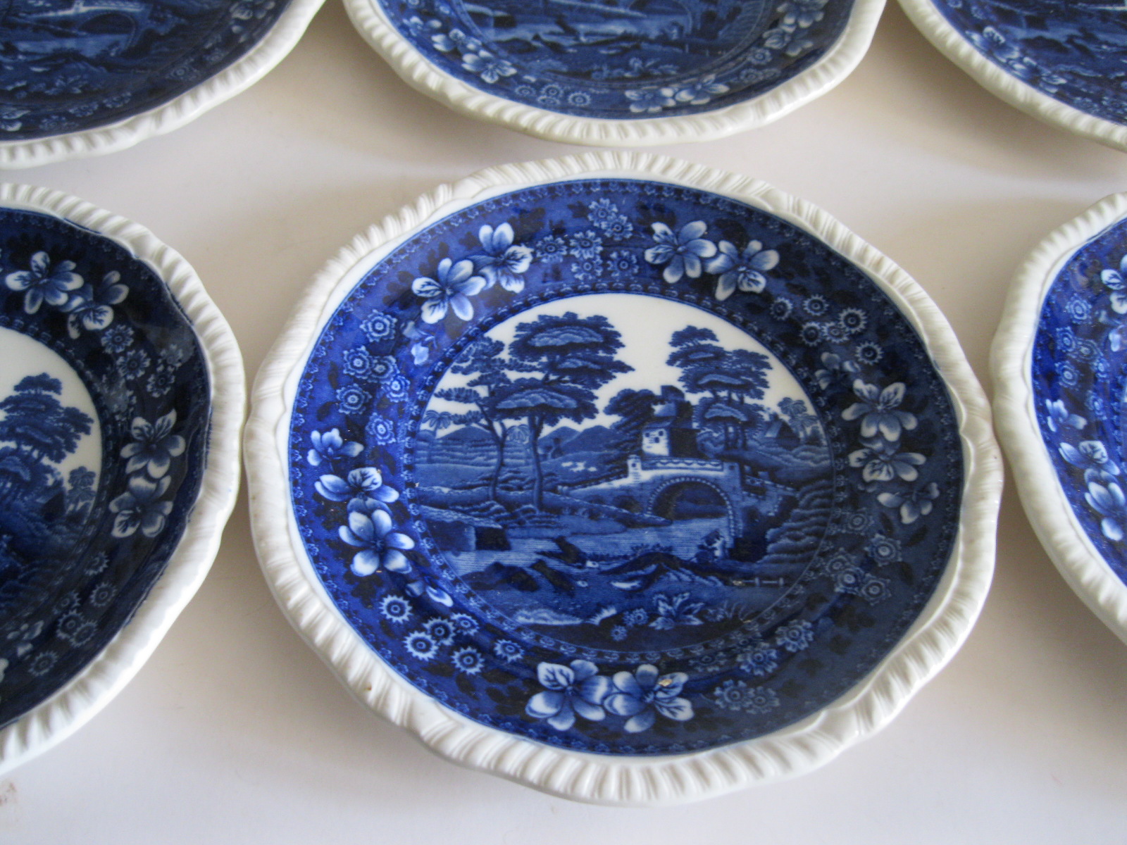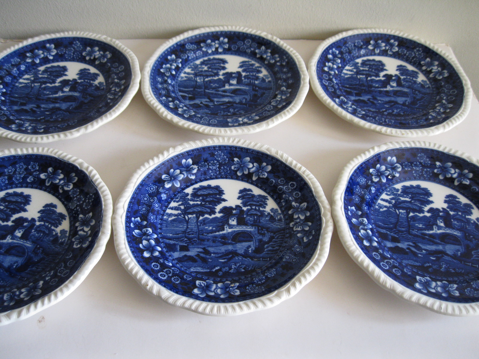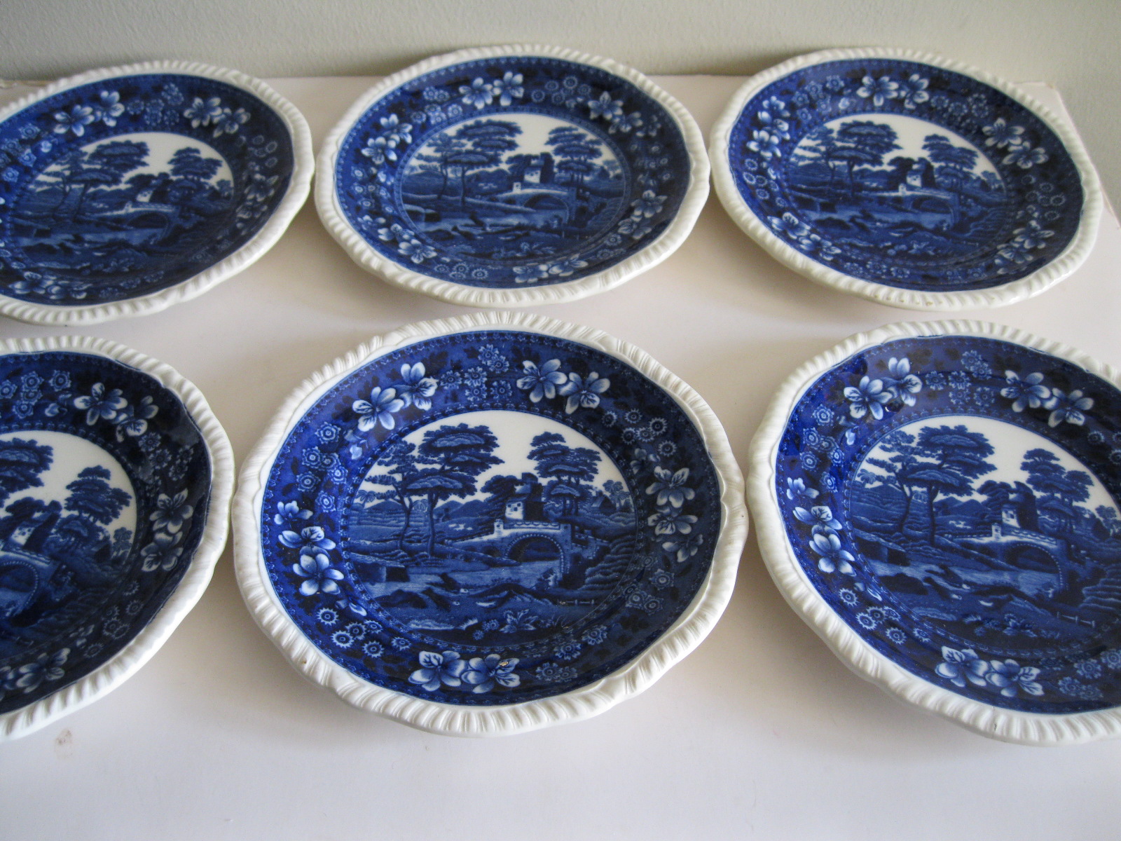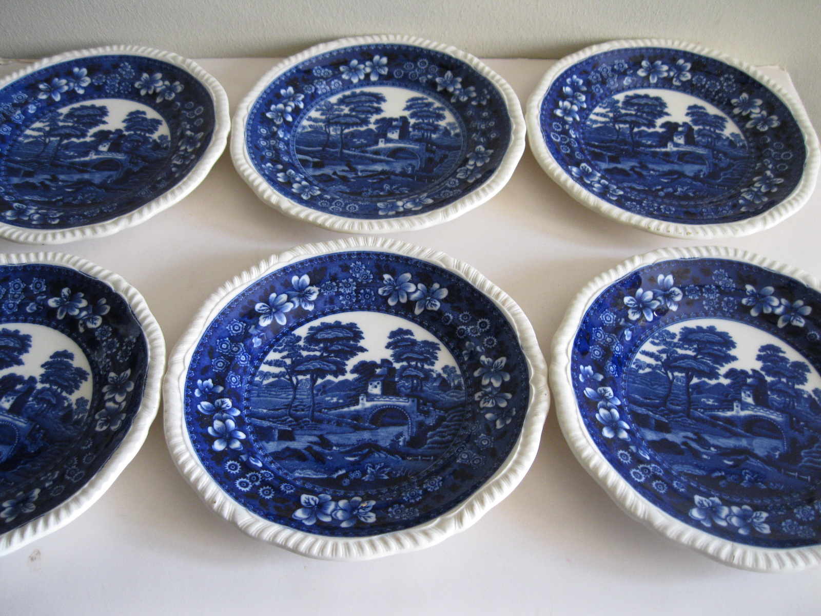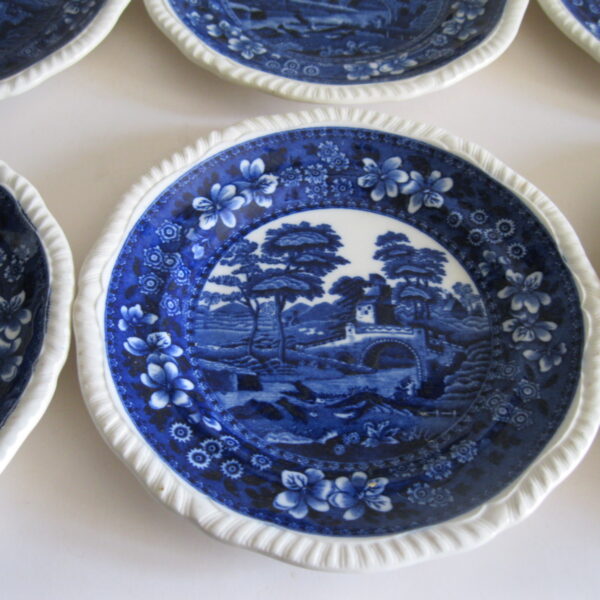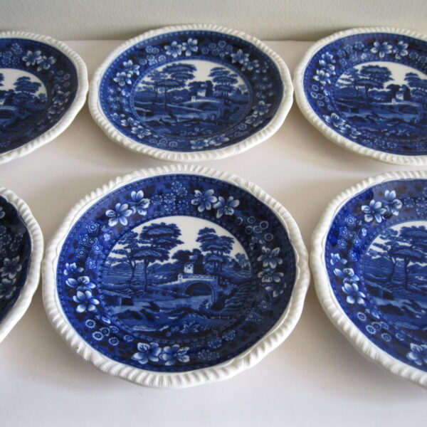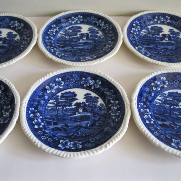 Oryginalny, stary, komplet angielskich talerzy deserowych Copeland. Komplet 6 sztuk. Wykonany z bardzo dobrej jakości, delikatnej porcelany w białym kolorze, zdobiony, przy krawędzi reliefowym tłoczeniem, romantycznym kobaltowym wzorem scenki sielankowej z rzeką i mostkiem. Bardzo dobrze szkliwiony. Komplet zachowany w stanie bardzo dobrym minus, jeden z talerzy posiada niewielki płaski odprysk szkliwa przy krawędzi, nie zmieniający jego owalu, na wszystkich talerzach można dostrzec drobne zarysowania szkliwa. Jest to bez wpływu na ich urodę i dalsze użytkowanie. Sygnowany. Polecam !