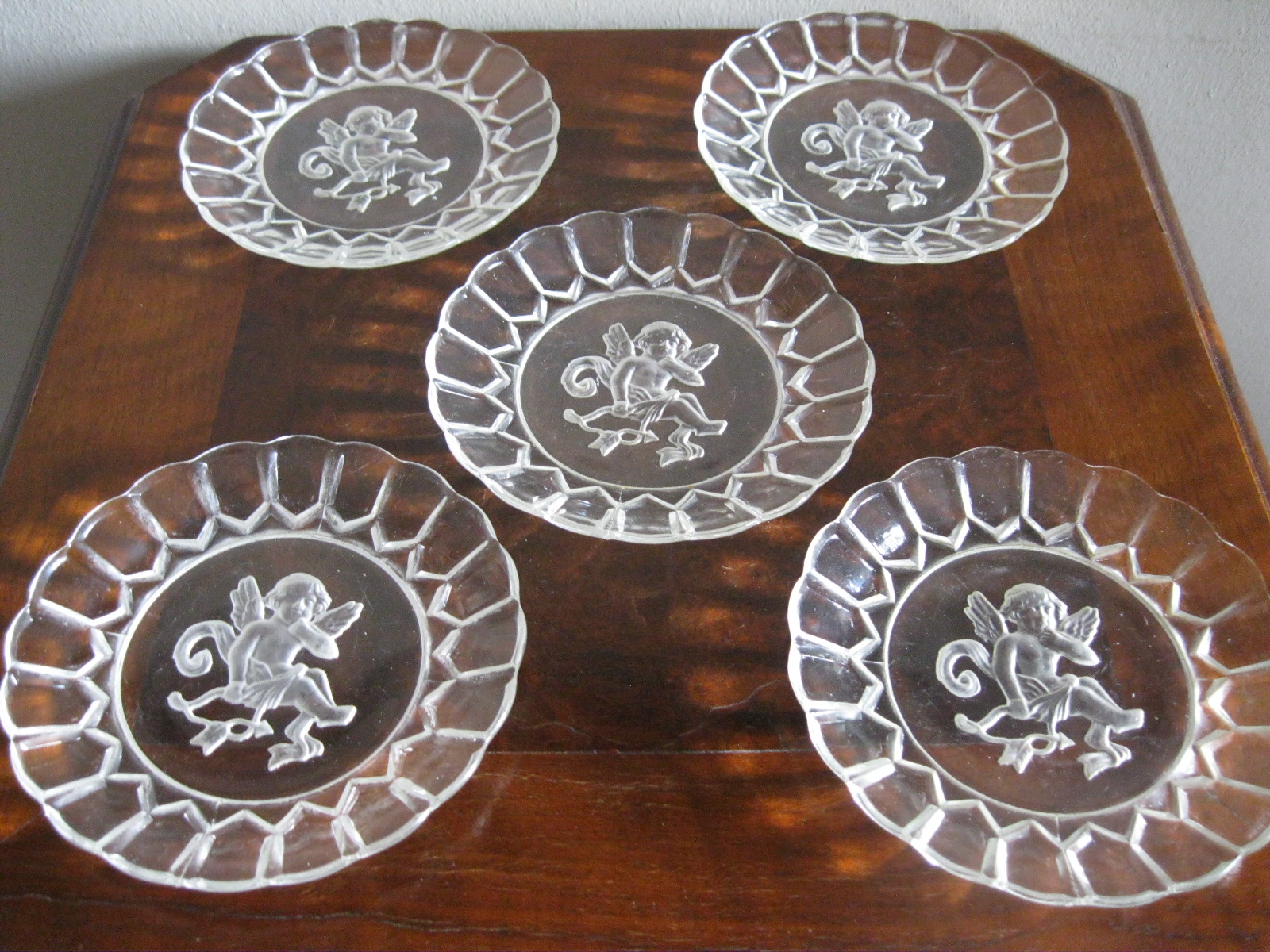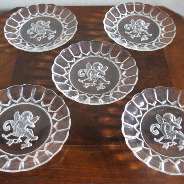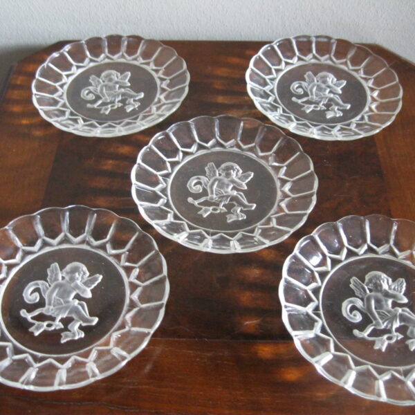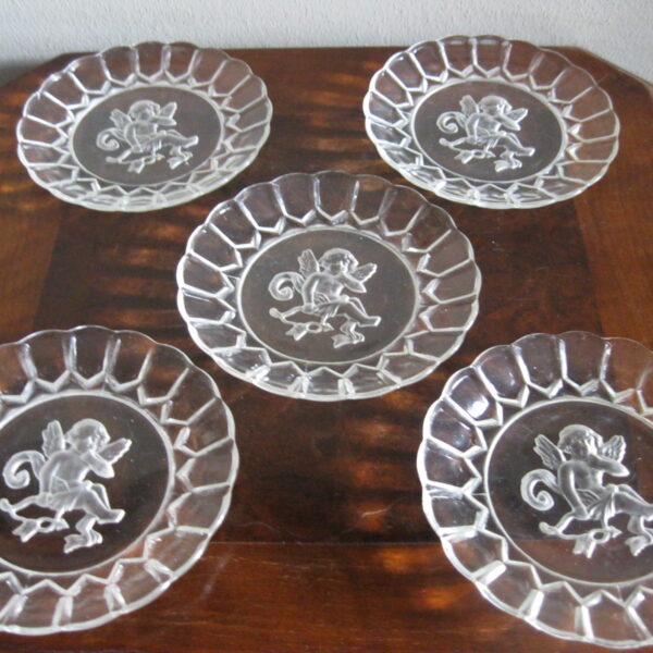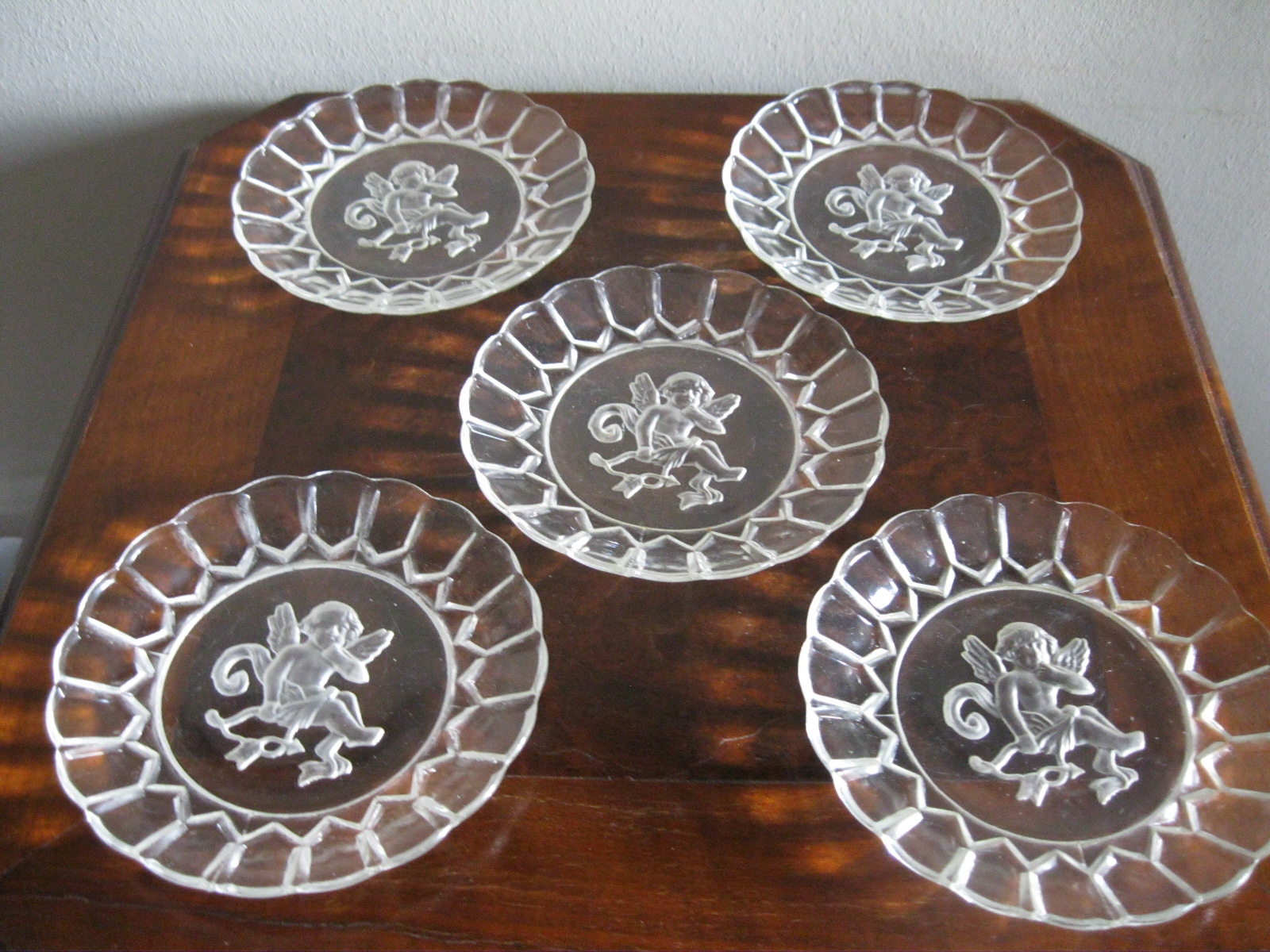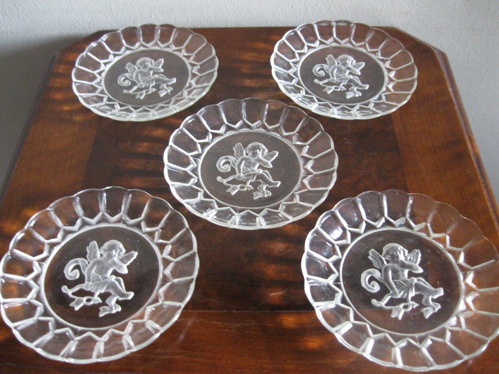 Oryginalne, stare, przedwojenne talerzyki kolekcjonerskie do ciasta z Aniołkiem. Komplet 5 sztuk. Wykonane z dobrej jakości przeźroczystego szkła w białym kolorze zdobione od zewnątrz na dnie reliefowym tłoczeniem z motywem siedzącego aniołka. Zachowane w stanie bardzo dobrym, całe bez uszkodzeń, w lustrze pod światłem widoczne nieliczne, drobne ryski, bez wpływu na urodę jak i użytkowanie. Polecam !