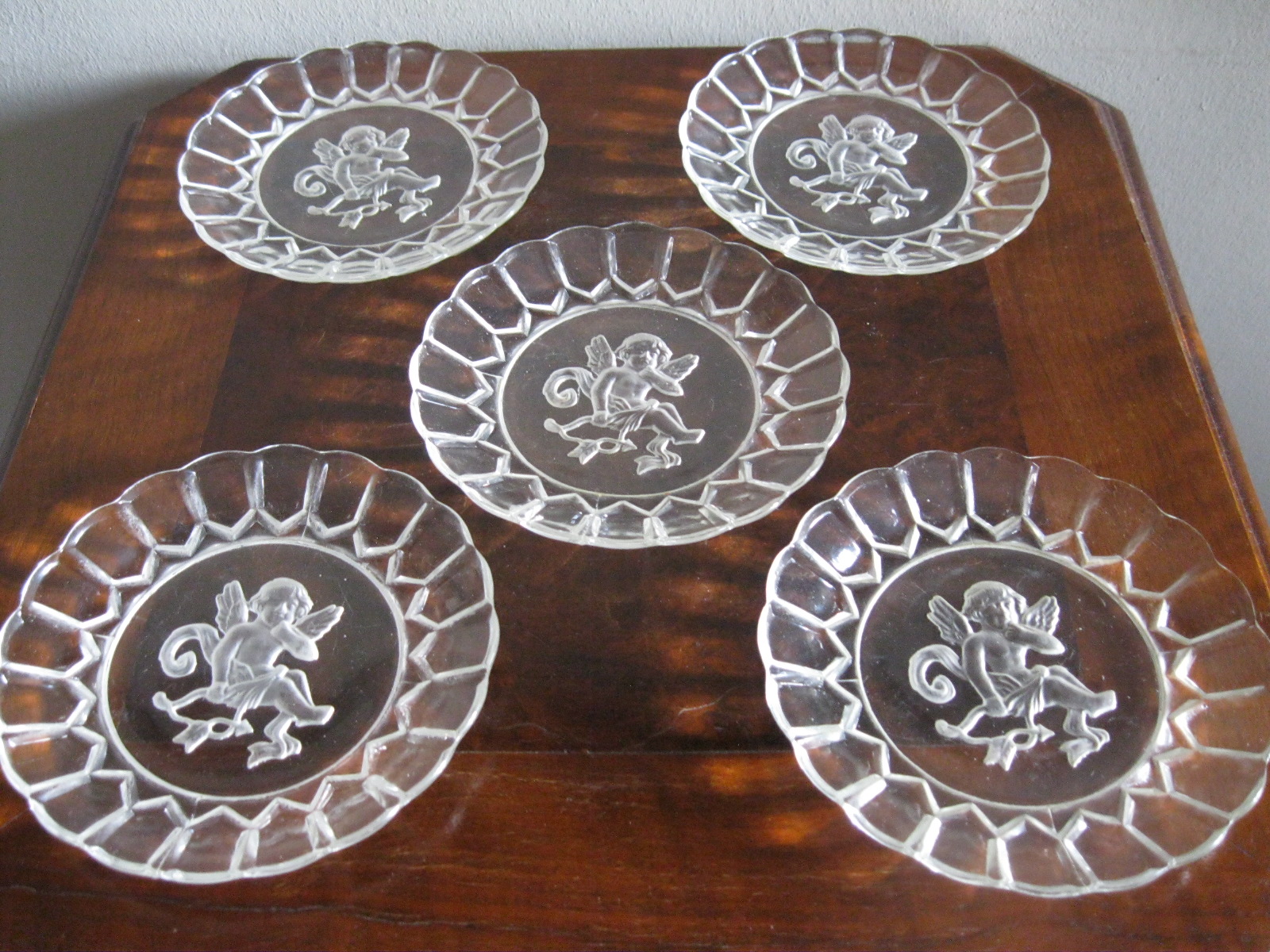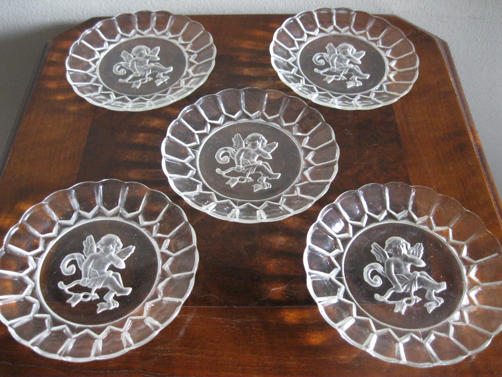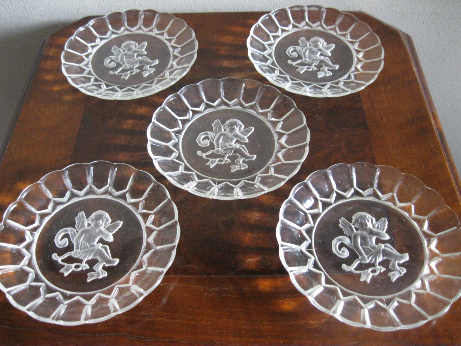 Oryginalne, stare, przedwojenne talerzyki kolekcjonerskie do ciasta z Aniołkiem. Komplet 5 sztuk. Wykonane z dobrej jakości przeźroczystego szkła w białym kolorze zdobione od zewnątrz na dnie reliefowym tłoczeniem z motywem siedzącego aniołka. Zachowane w stanie bardzo dobrym, całe bez uszkodzeń, w lustrze pod światłem widoczne nieliczne, drobne ryski, bez wpływu na urodę jak i użytkowanie. Polecam !