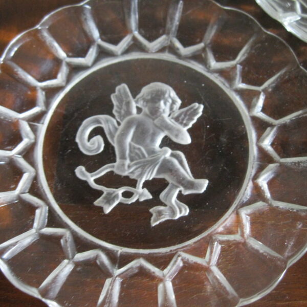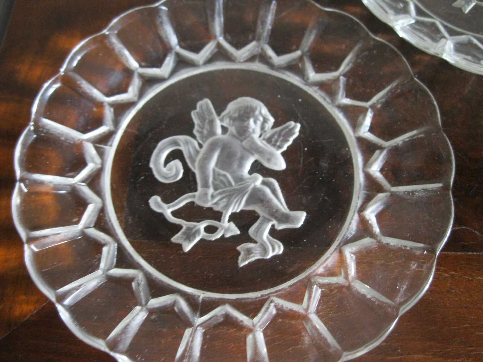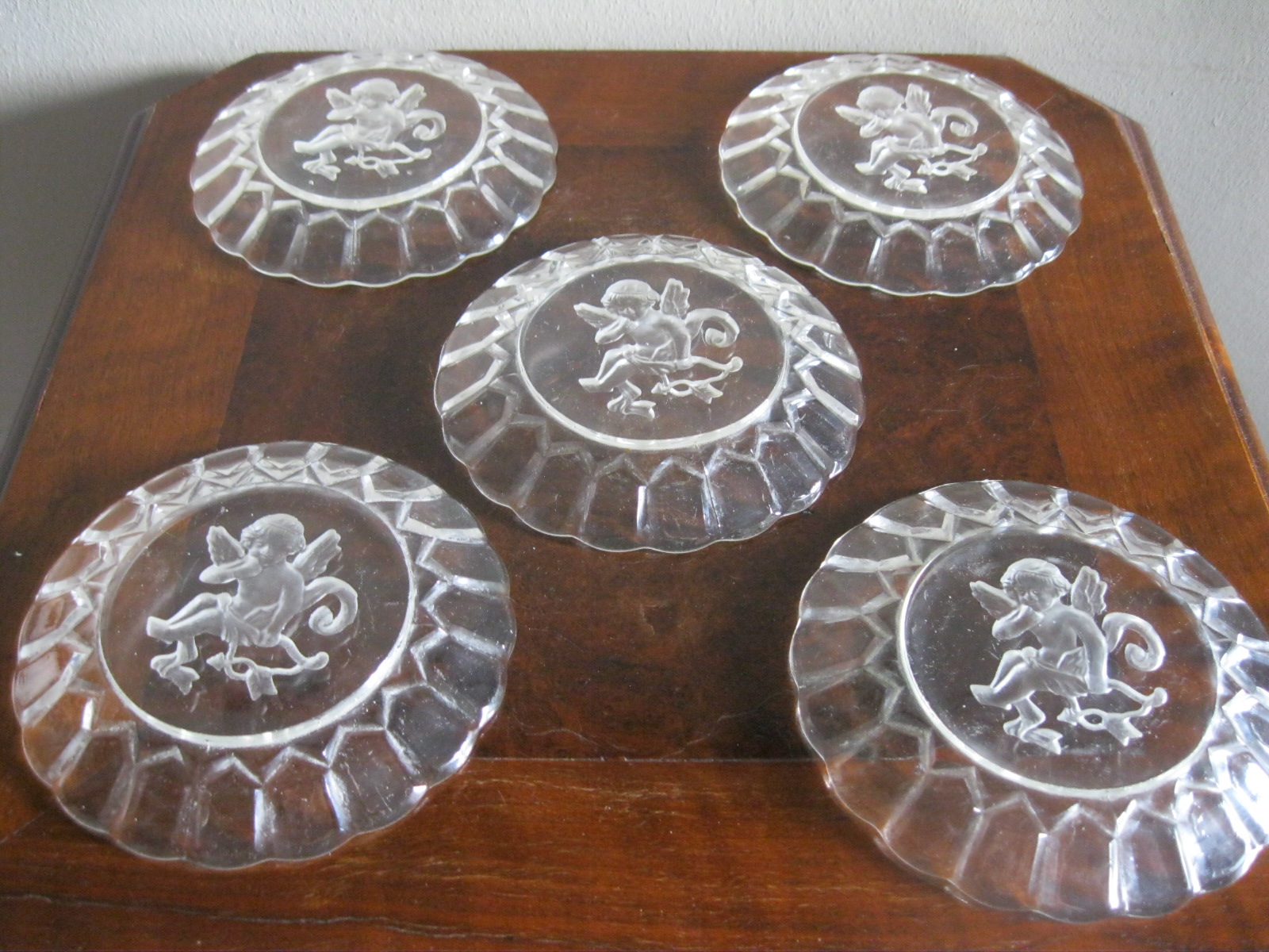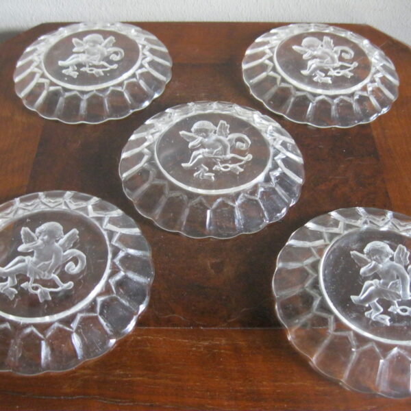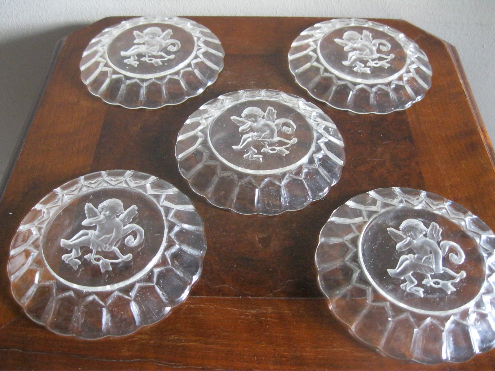 Oryginalne, stare, przedwojenne talerzyki kolekcjonerskie do ciasta z Aniołkiem. Komplet 5 sztuk. Wykonane z dobrej jakości przeźroczystego szkła w białym kolorze zdobione od zewnątrz na dnie reliefowym tłoczeniem z motywem siedzącego aniołka. Zachowane w stanie bardzo dobrym, całe bez uszkodzeń, w lustrze pod światłem widoczne nieliczne, drobne ryski, bez wpływu na urodę jak i użytkowanie. Polecam !