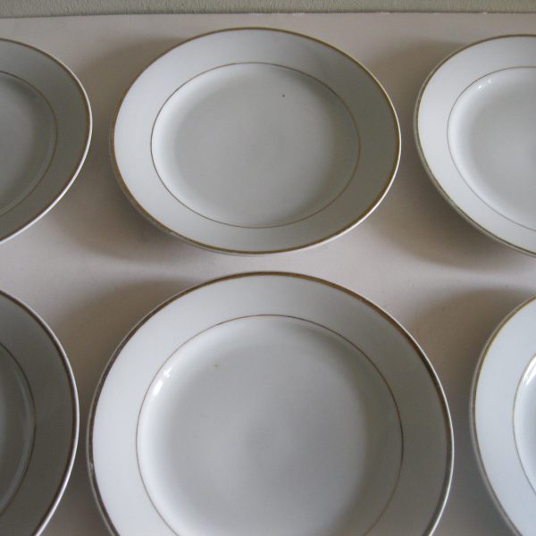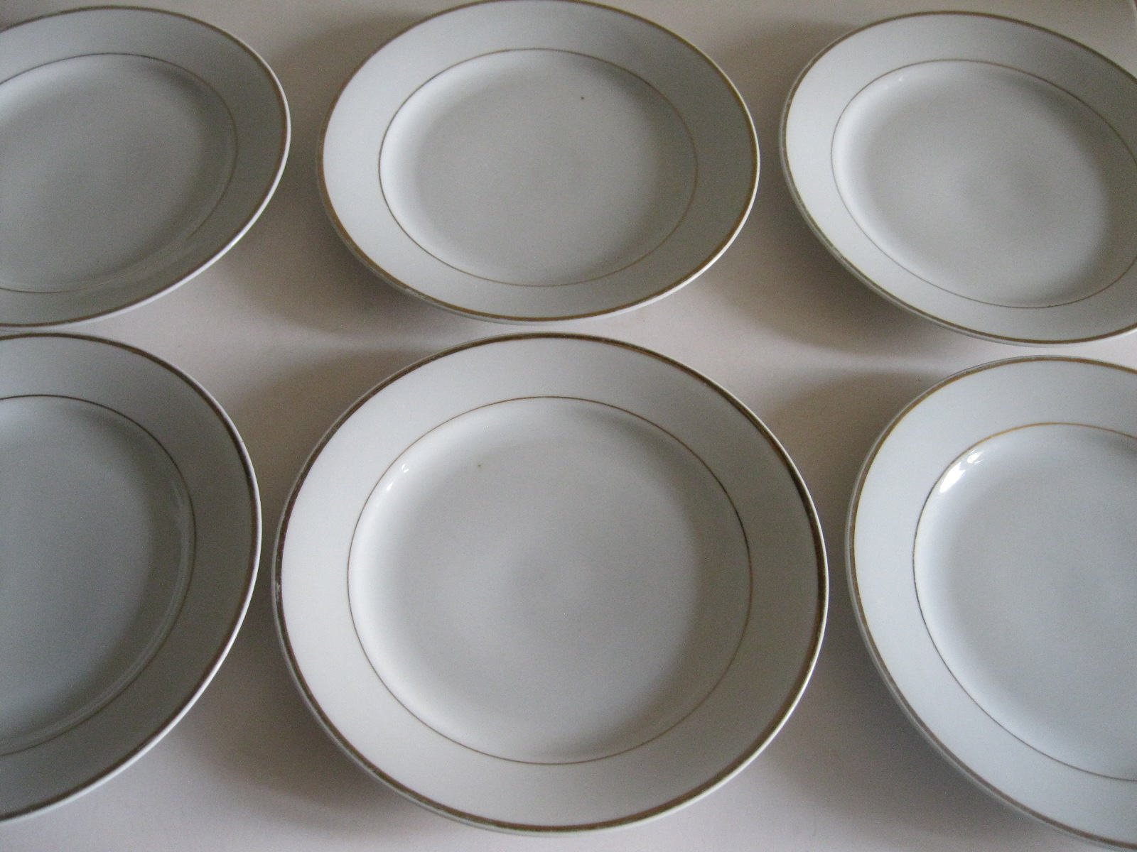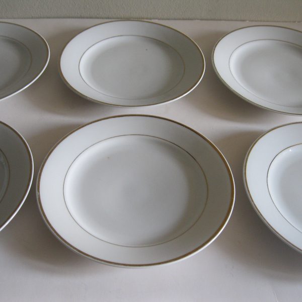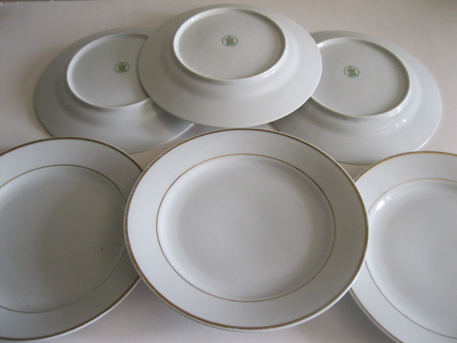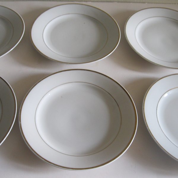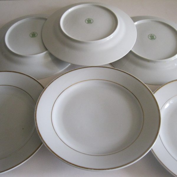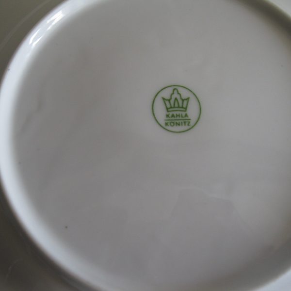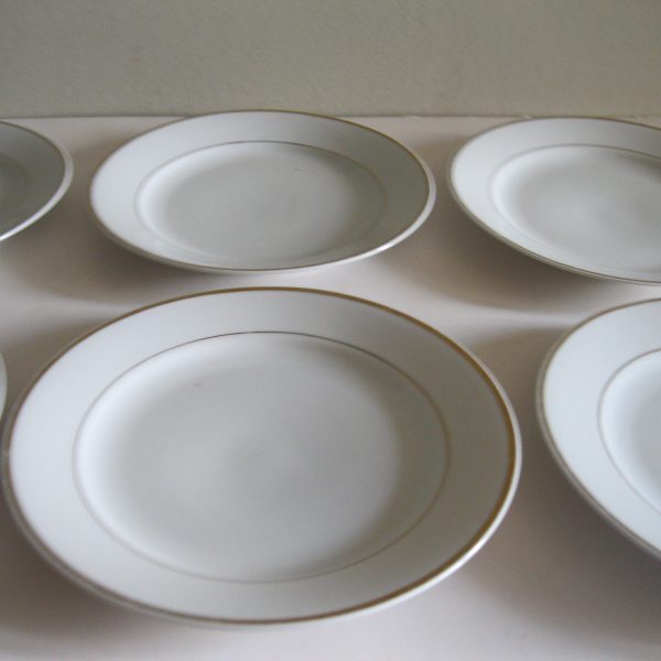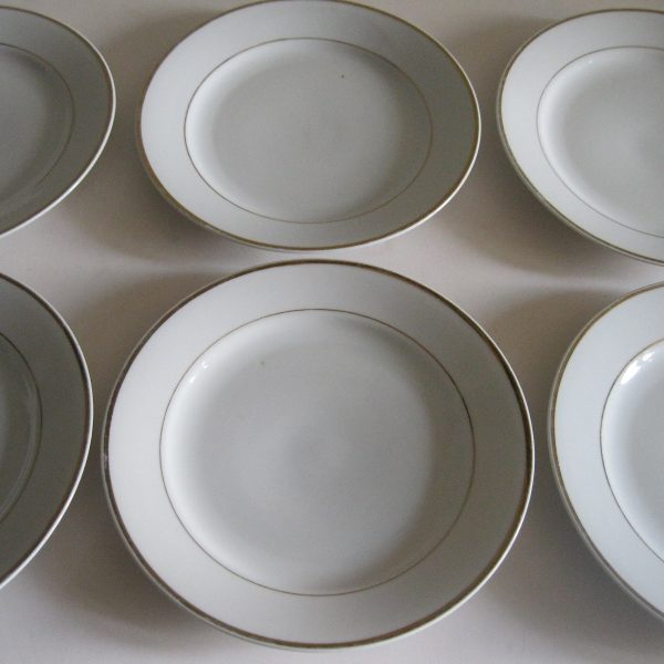 Oryginalny, stary, komplet talerzy deserowych Kahla komplet 6 sztuk. Komplet z lat 60 – 70 tych. Wykonany z dobrej jakości, delikatnej porcelany w białym kolorze, zdobiony złotym paseczkiem. Komplet zachowany w stanie bardzo dobrym, cały bez uszkodzeń, w lustrze pod światłem widoczne drobne ślady w postaci drobnych zarysowań oraz przetarcia złocenia co jest rzeczą naturalną. Sygnowany . Polecam !
