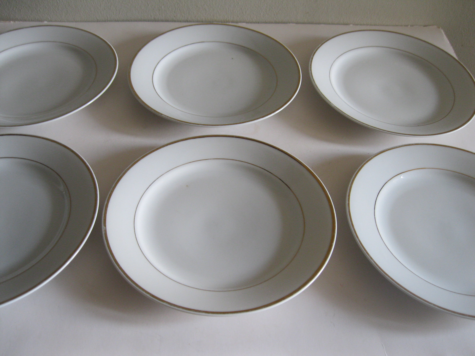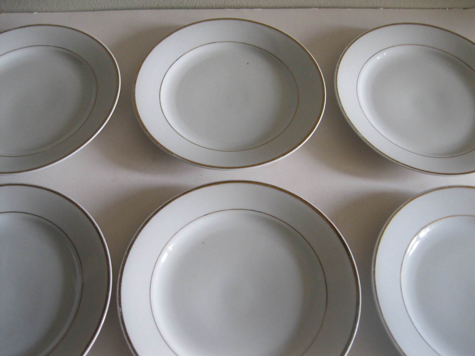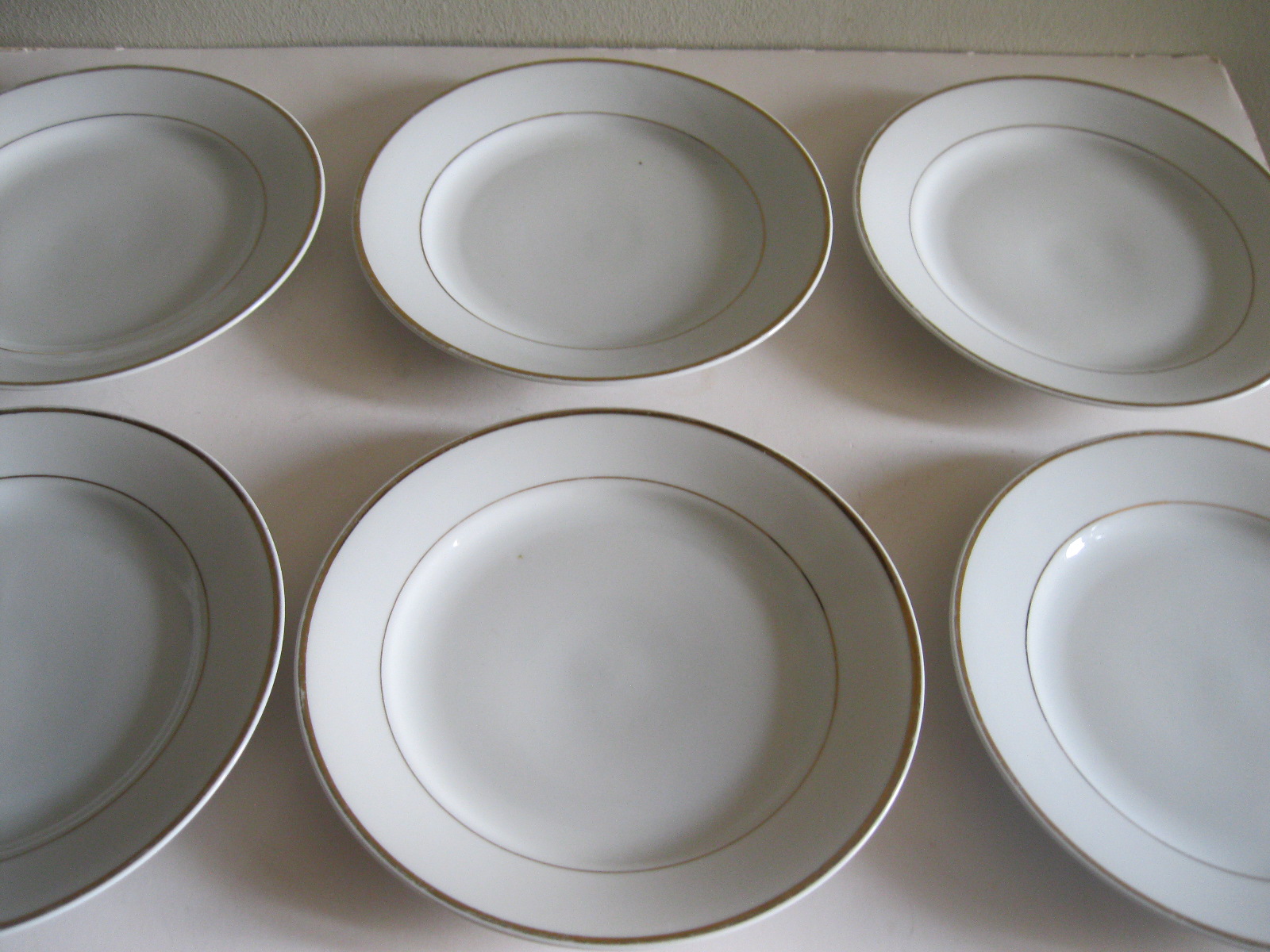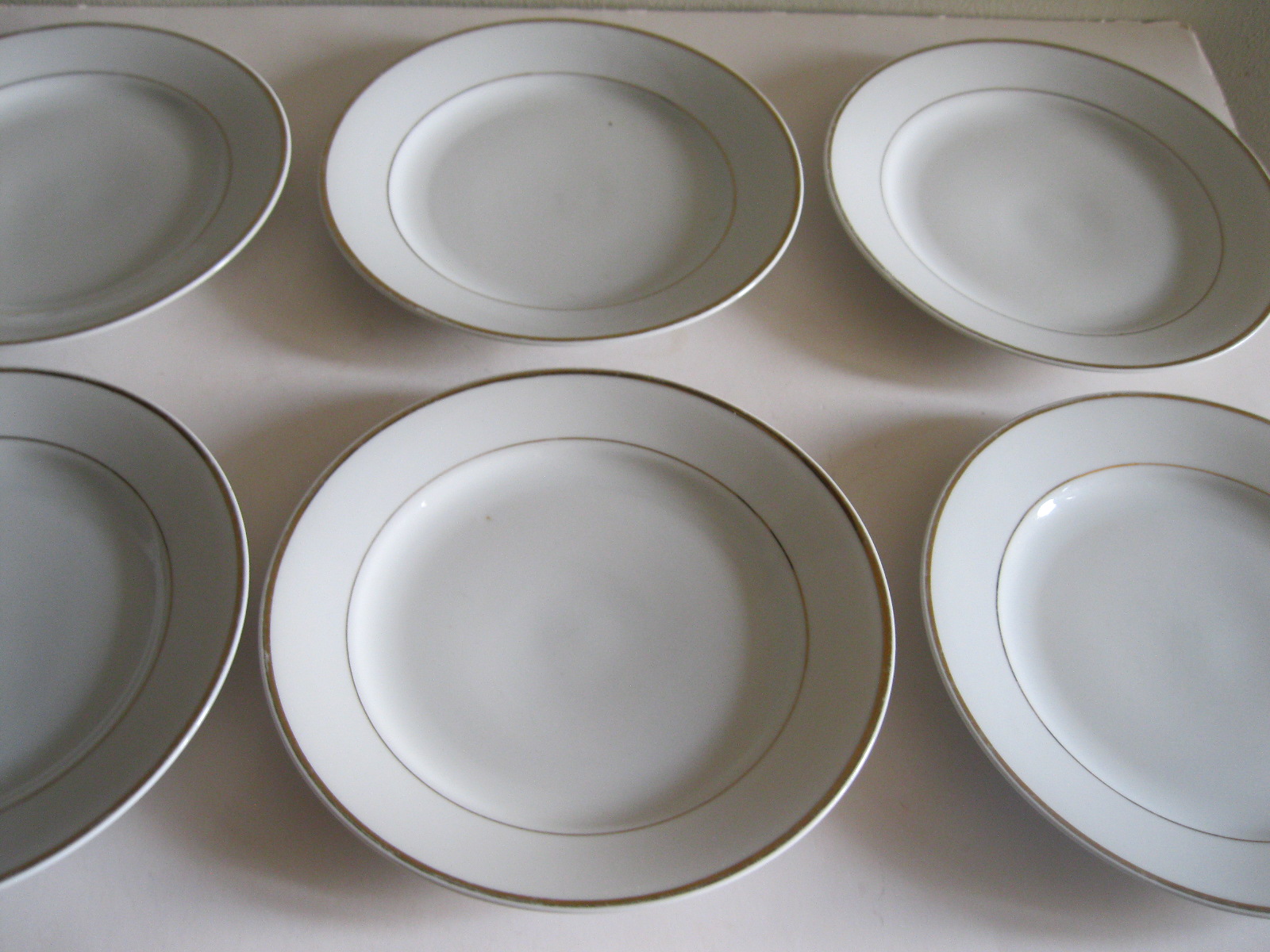 Oryginalny, stary, komplet talerzy deserowych Kahla komplet 6 sztuk. Komplet z lat 60 – 70 tych. Wykonany z dobrej jakości, delikatnej porcelany w białym kolorze, zdobiony złotym paseczkiem. Komplet zachowany w stanie bardzo dobrym, cały bez uszkodzeń, w lustrze pod światłem widoczne drobne ślady w postaci drobnych zarysowań oraz przetarcia złocenia co jest rzeczą naturalną. Sygnowany . Polecam !