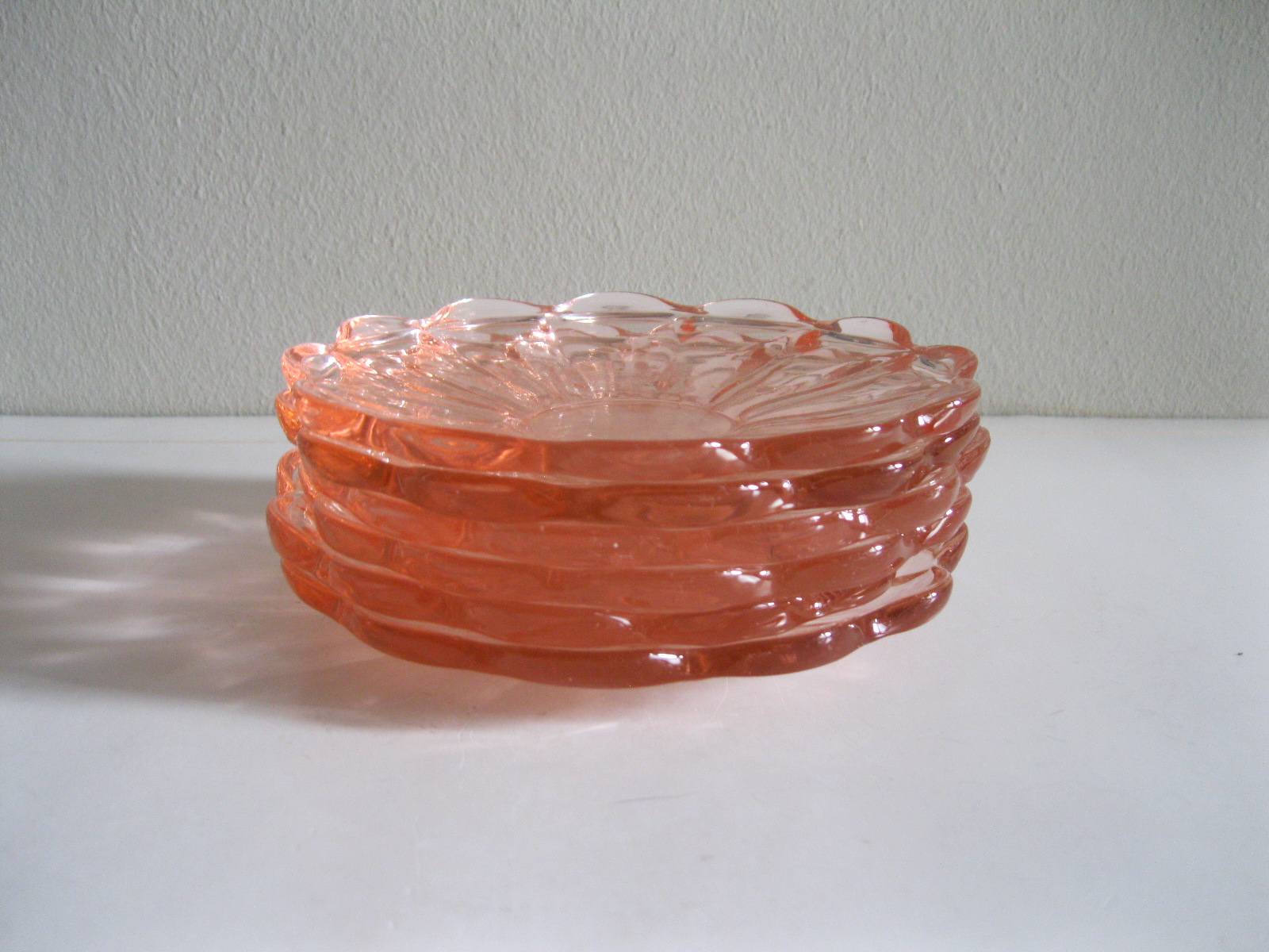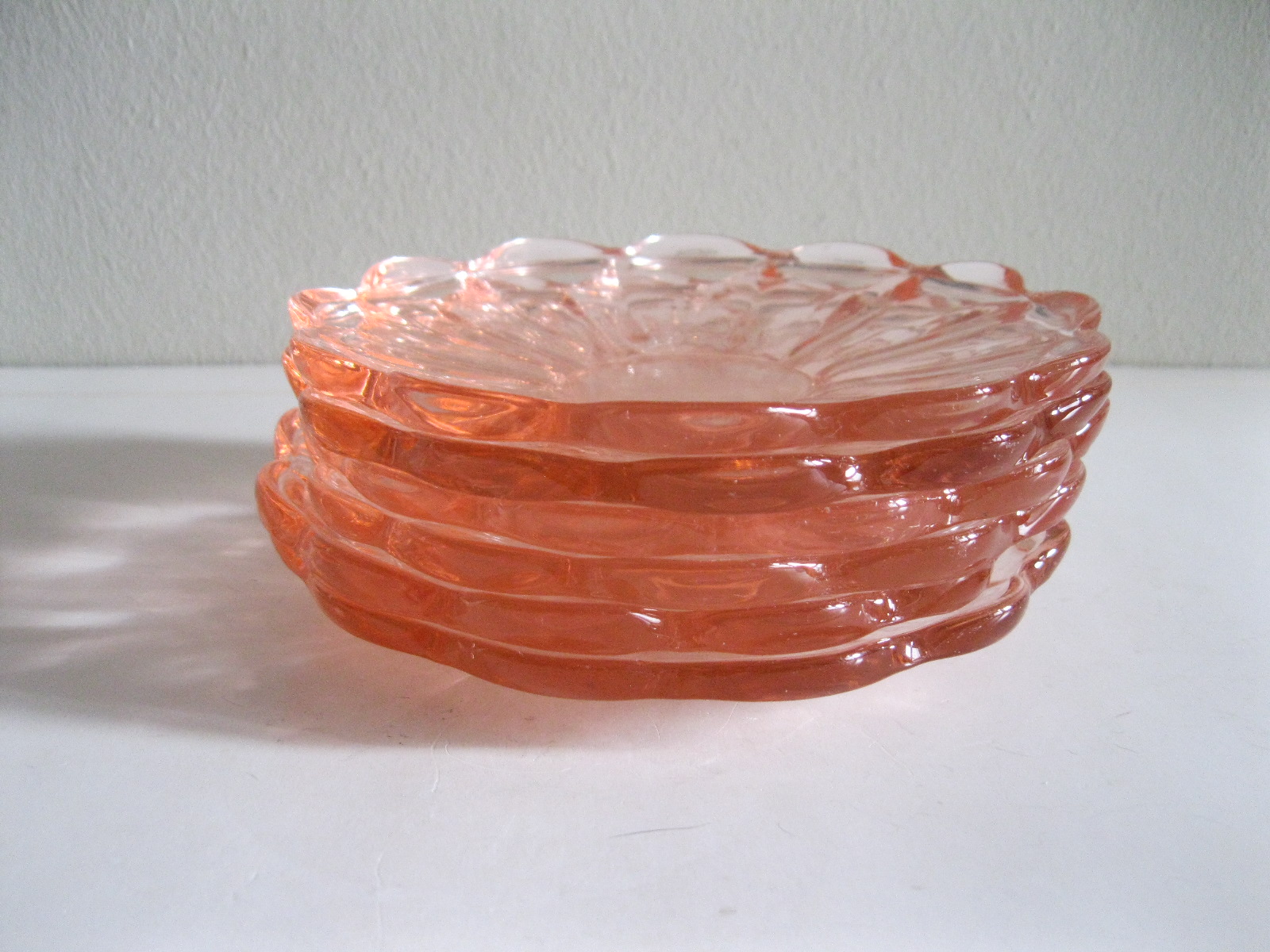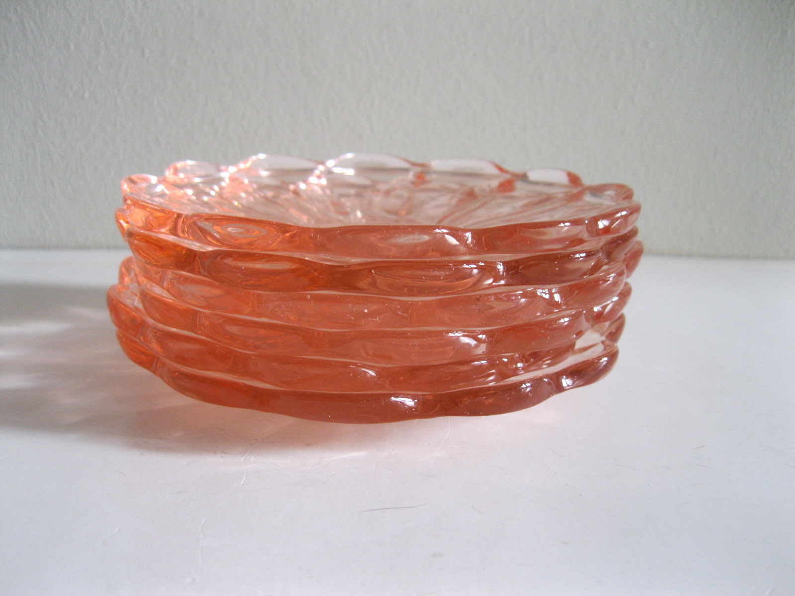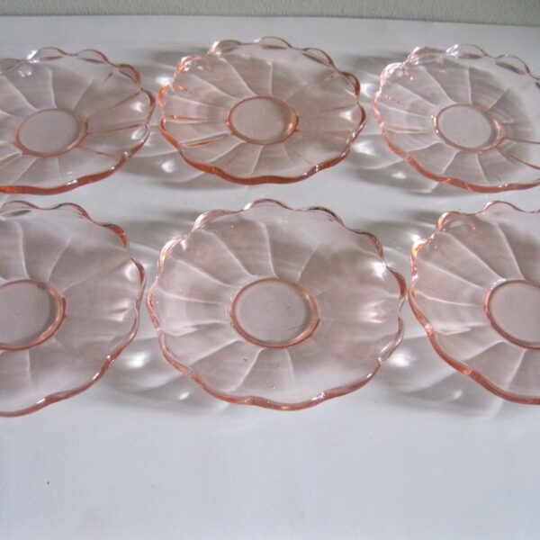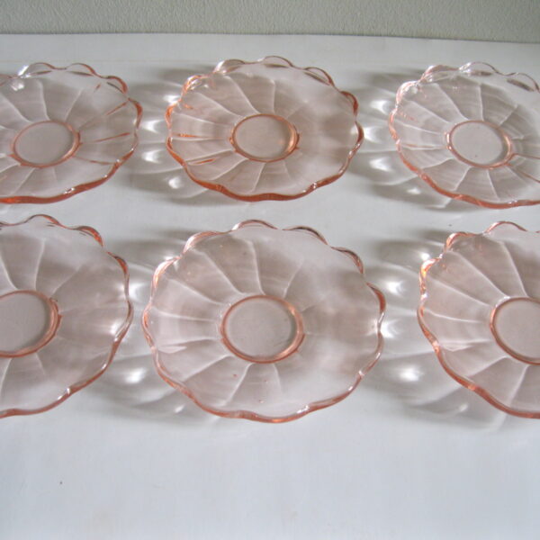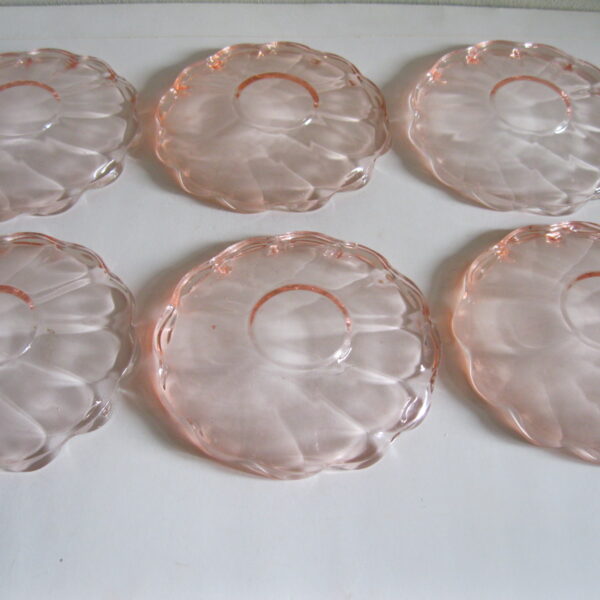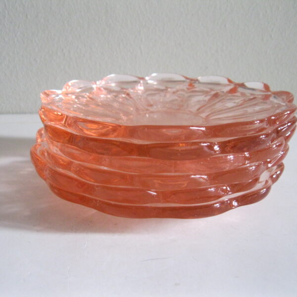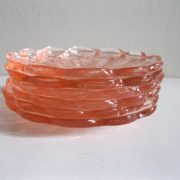 Oryginalne, stare, szklane, talerzyki do ciasta huta Hortensja. Komplet 6 sztuk. Wykonane z dobrej jakości przeźroczystego szkła w różowym/ łososiowym kolorze, zdobione bogatym reliefowym tłoczeniem z rozfalowanym ozdobnym rantem. Zachowane w stanie bardzo dobrym, całe bez uszkodzeń. Polecam !