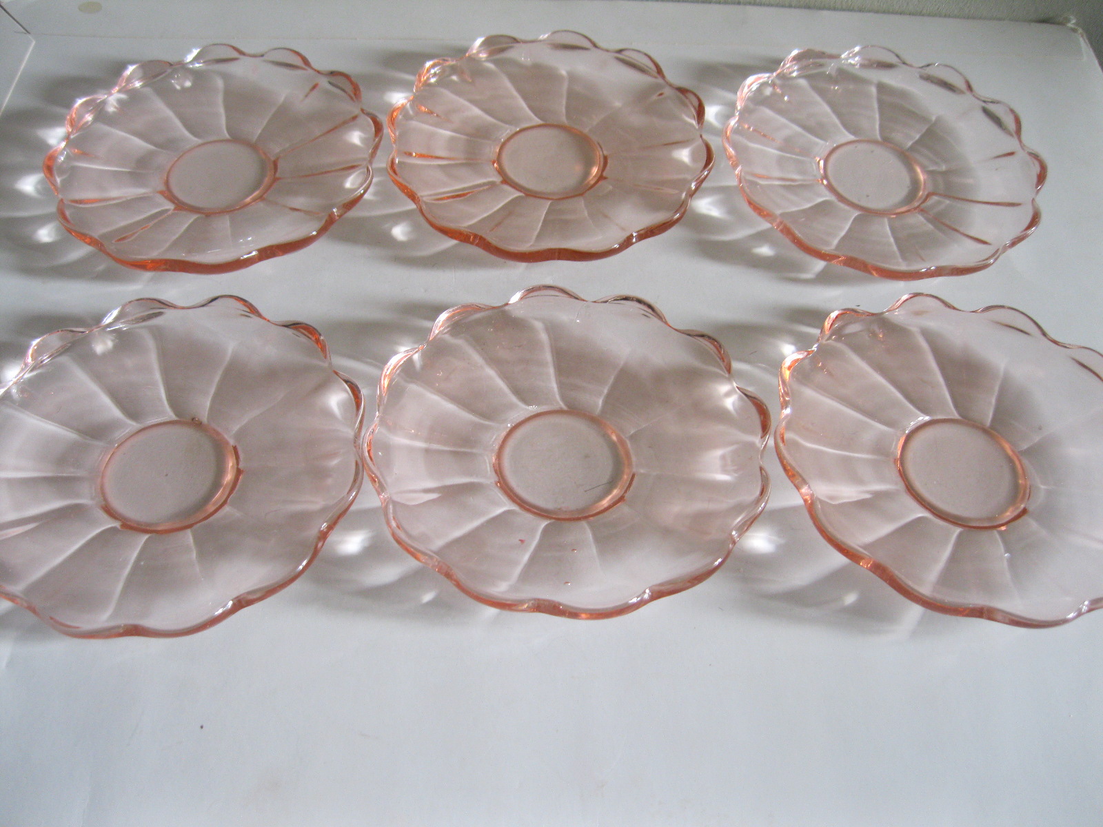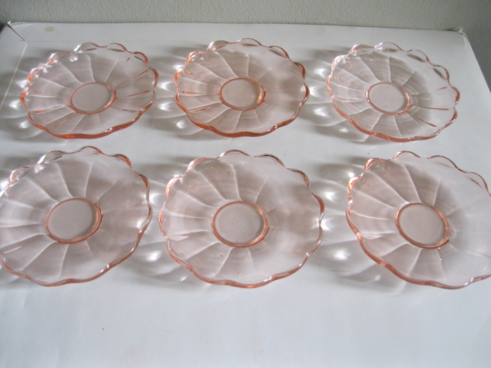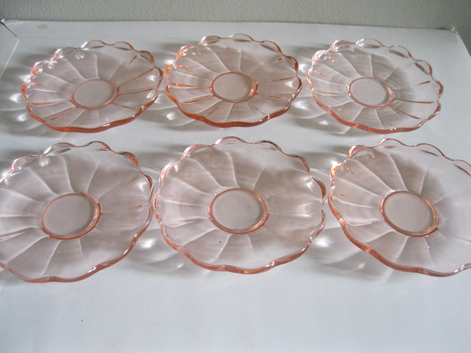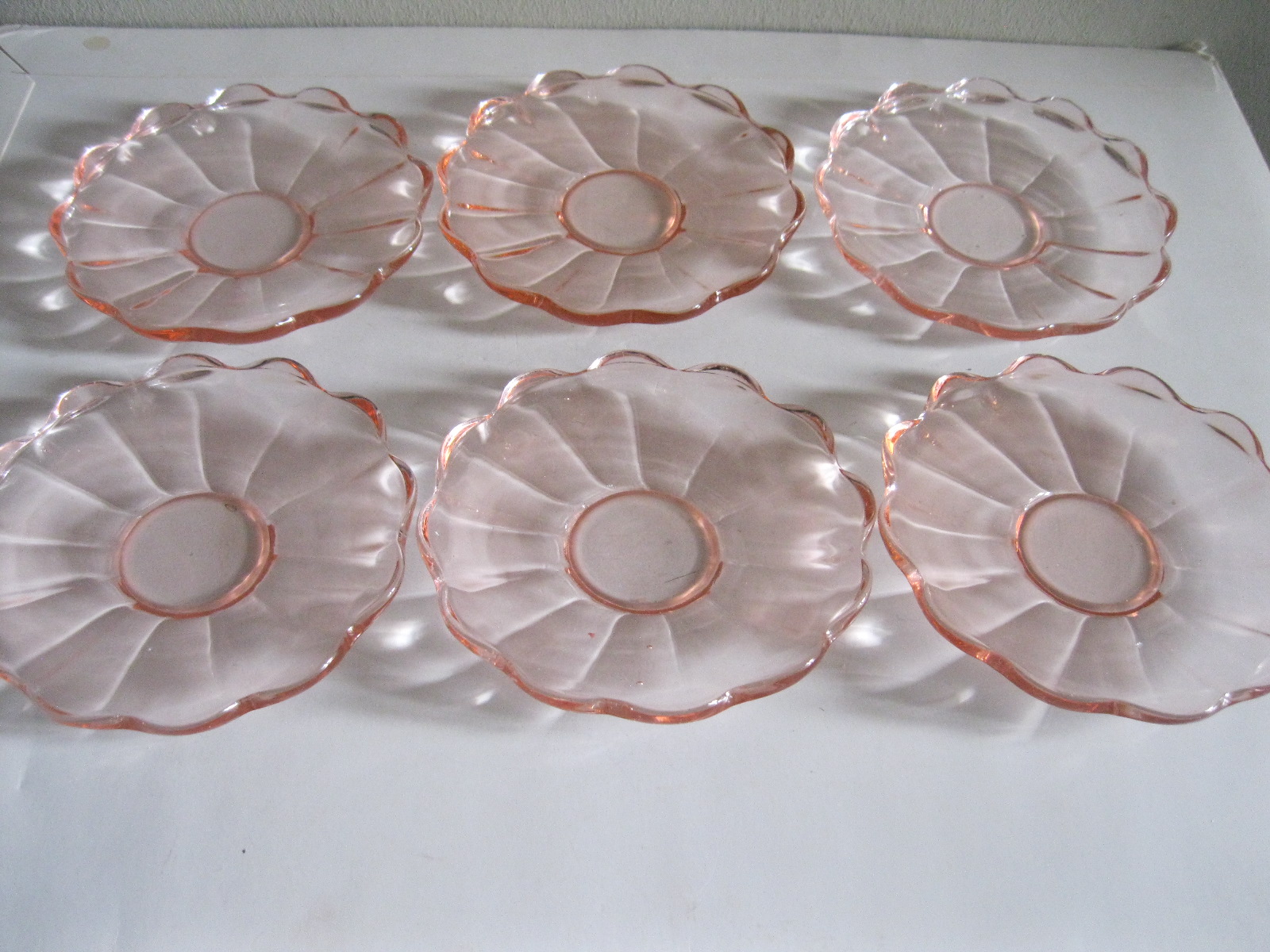 Oryginalne, stare, szklane, talerzyki do ciasta huta Hortensja. Komplet 6 sztuk. Wykonane z dobrej jakości przeźroczystego szkła w różowym/ łososiowym kolorze, zdobione bogatym reliefowym tłoczeniem z rozfalowanym ozdobnym rantem. Zachowane w stanie bardzo dobrym, całe bez uszkodzeń. Polecam !