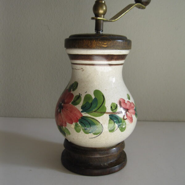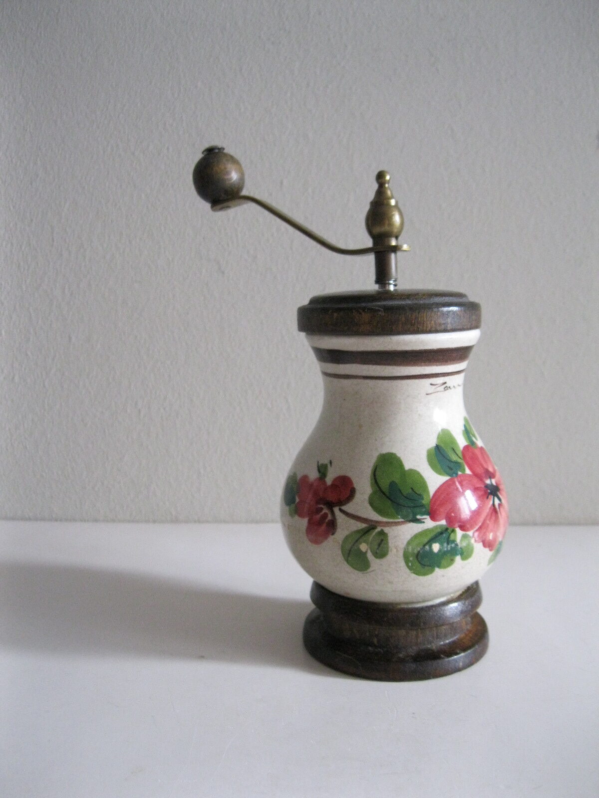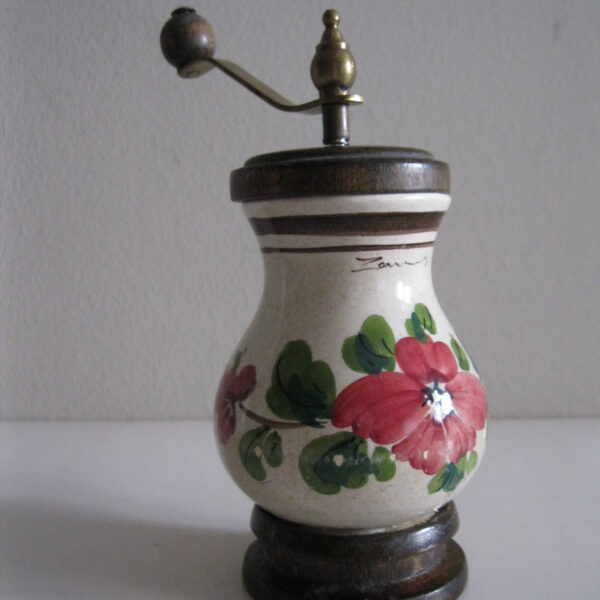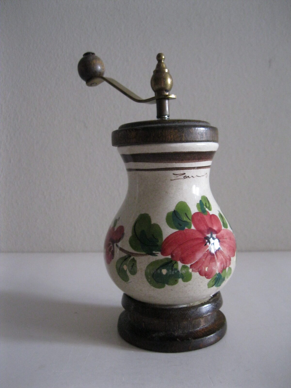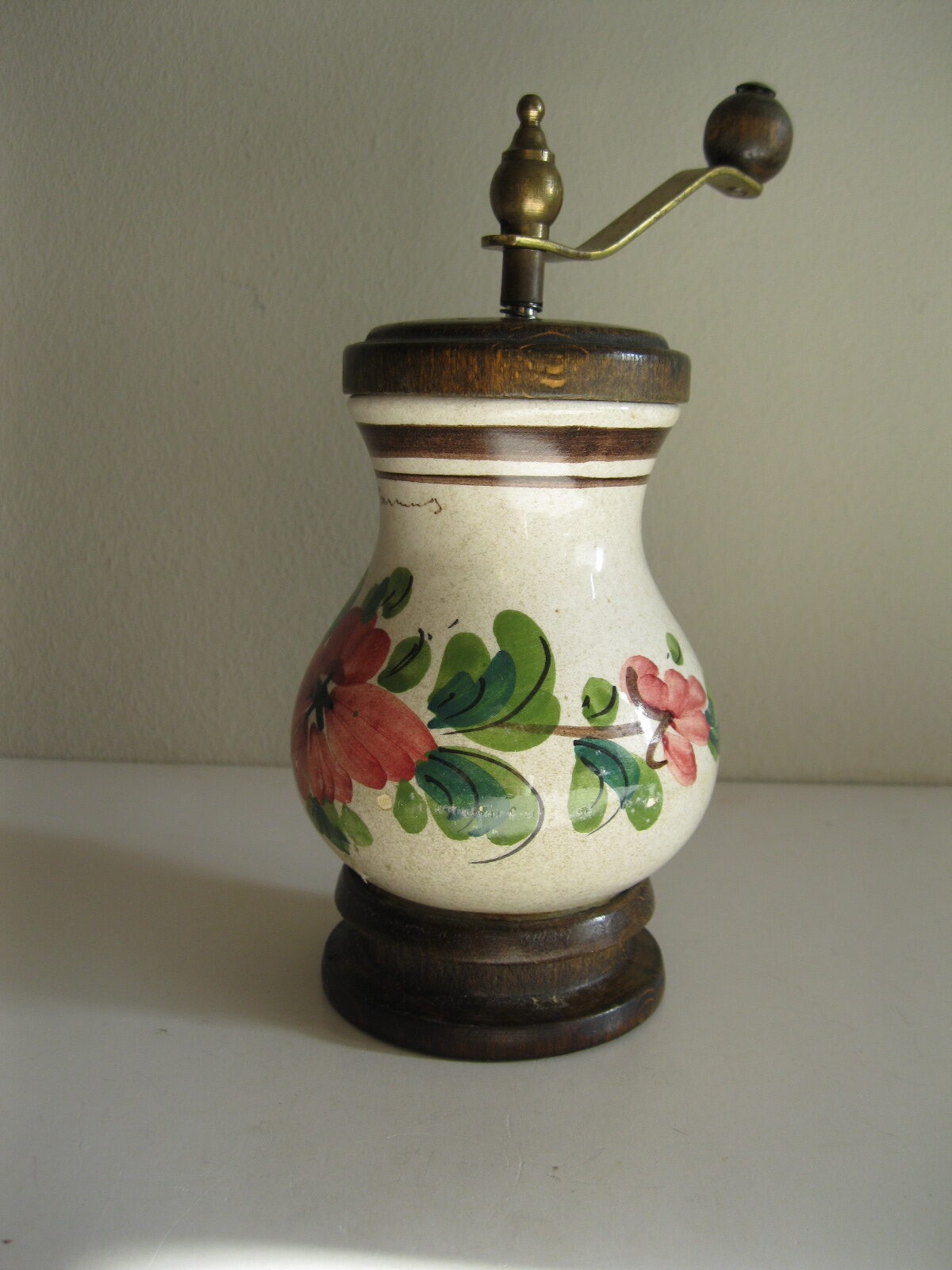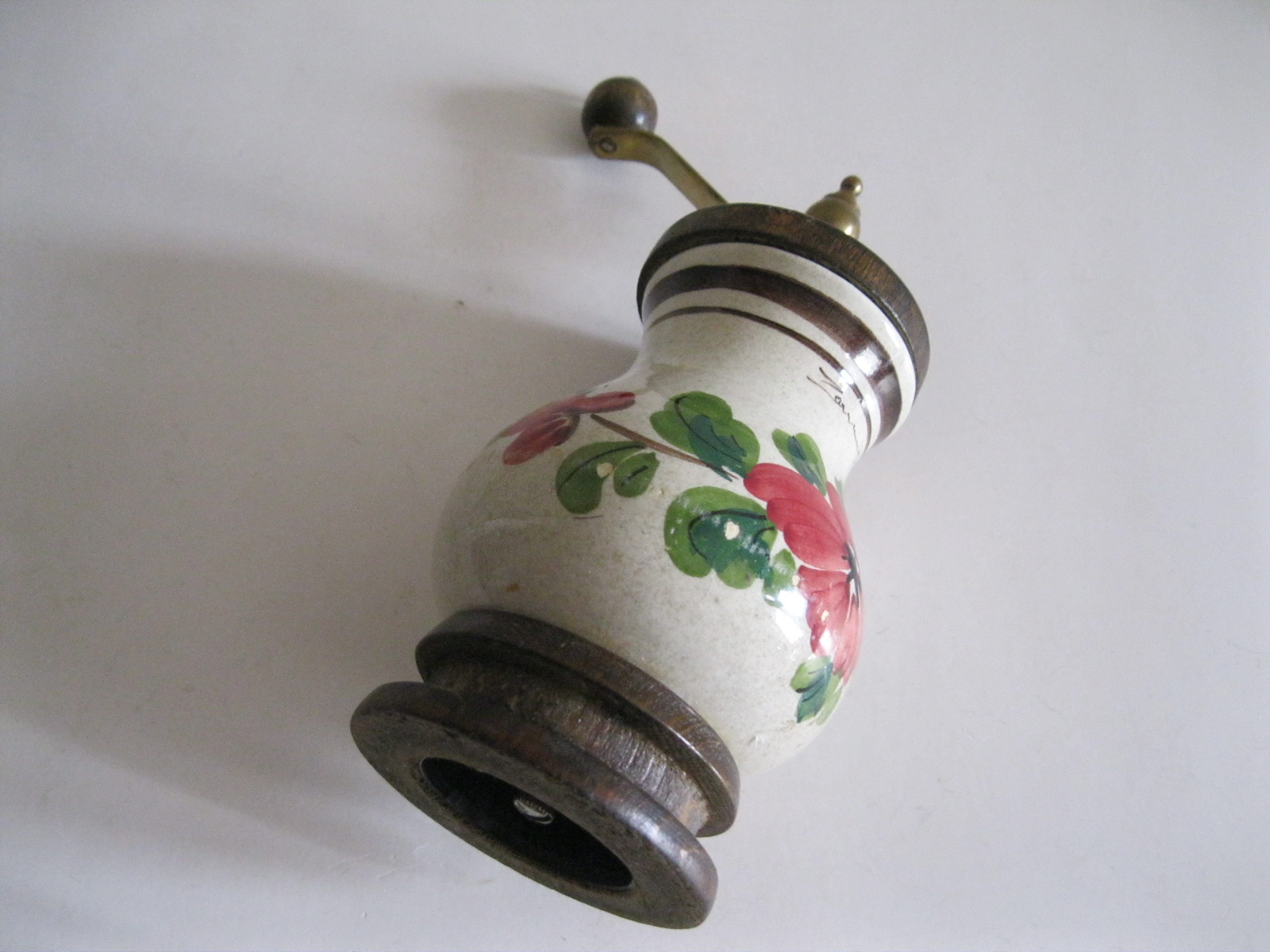 Oryginalny, stary, ozdobny, ceramiczny, kolekcjonerski młynek do mielenia pieprzu. Wykonany z ceramiki w połączeniu z naturalnym drewnem. Brzusiec młynka zdobiony malaturą w różowe kwiaty. Mechanizm mielący, metalowy, czysty, sprawny, używany, młynek mielił tylko pieprz. Zachowany w stanie bardzo dobrym jak na upływ czasu, niewielkie, nieliczne odpryski szkliwa bez znaczenia na urodę jak i użytkowanie. Polecam !