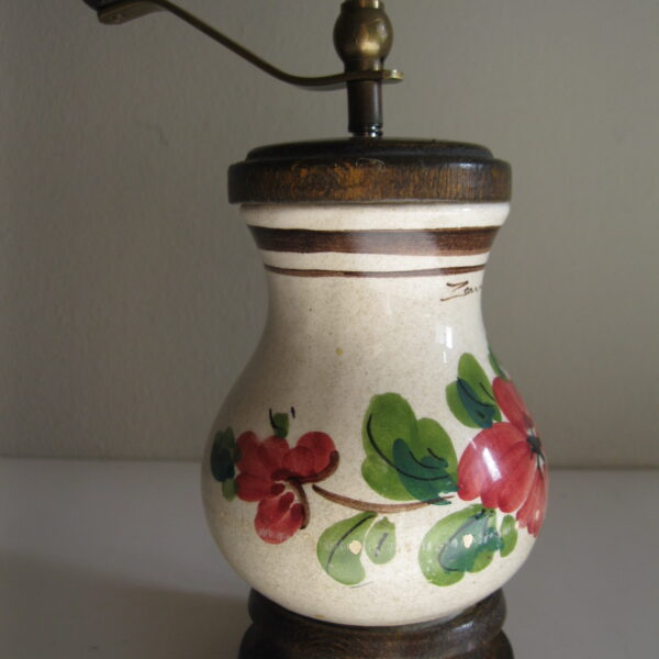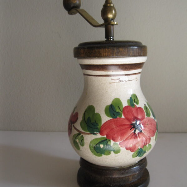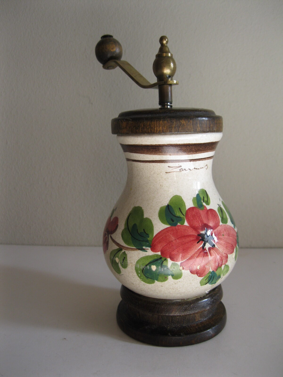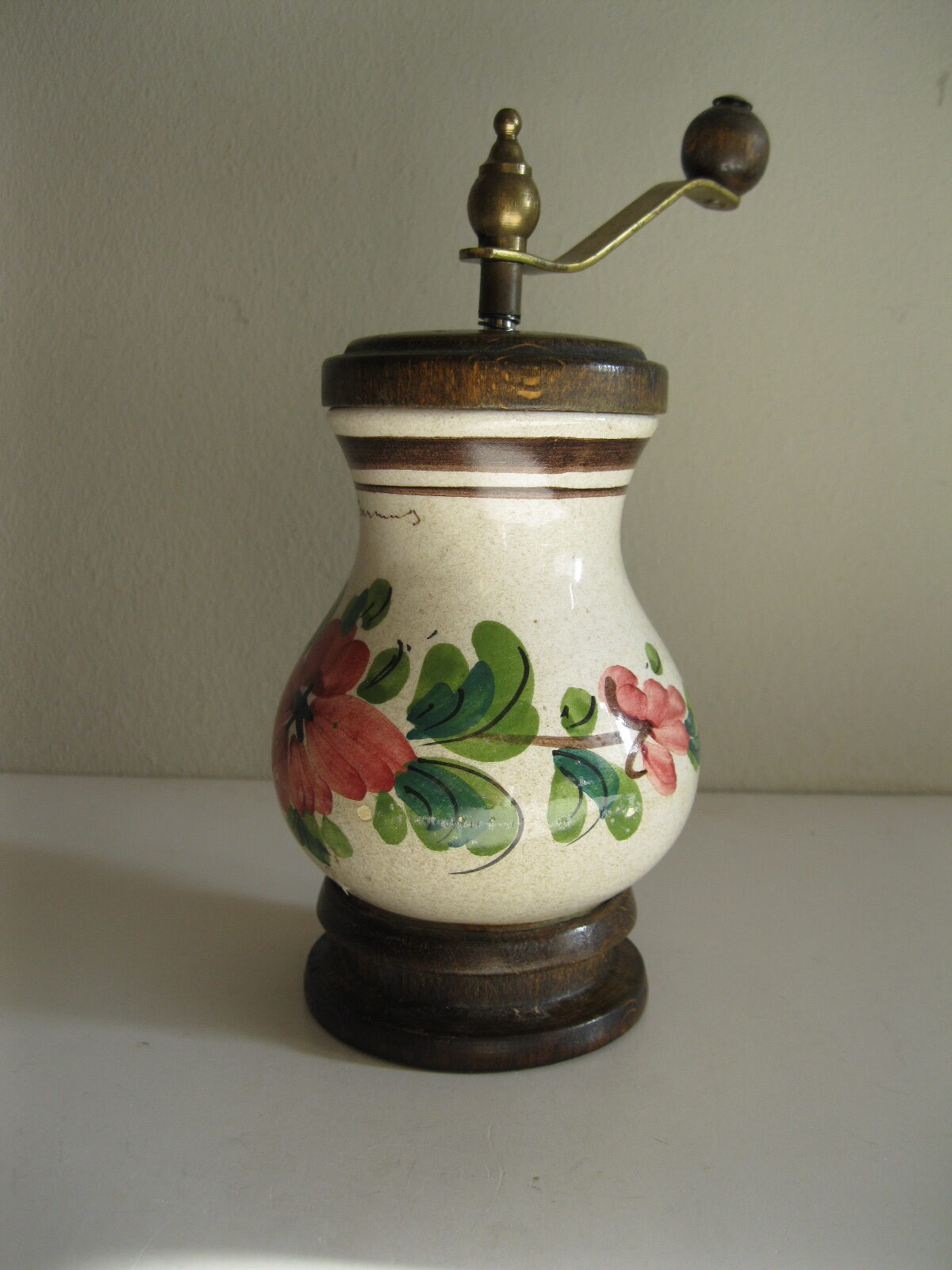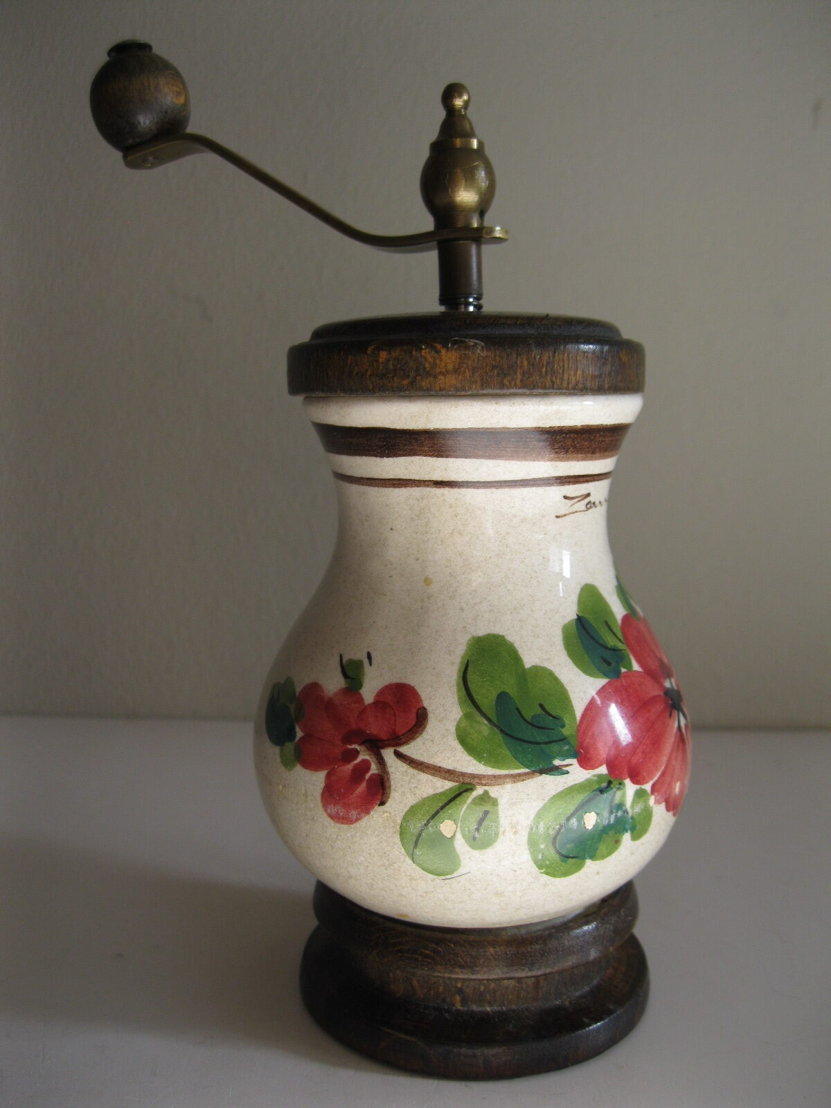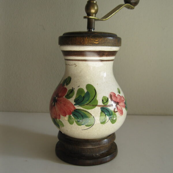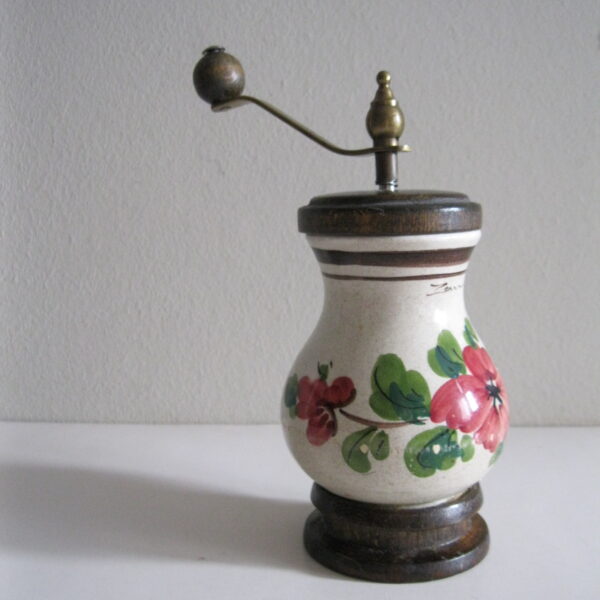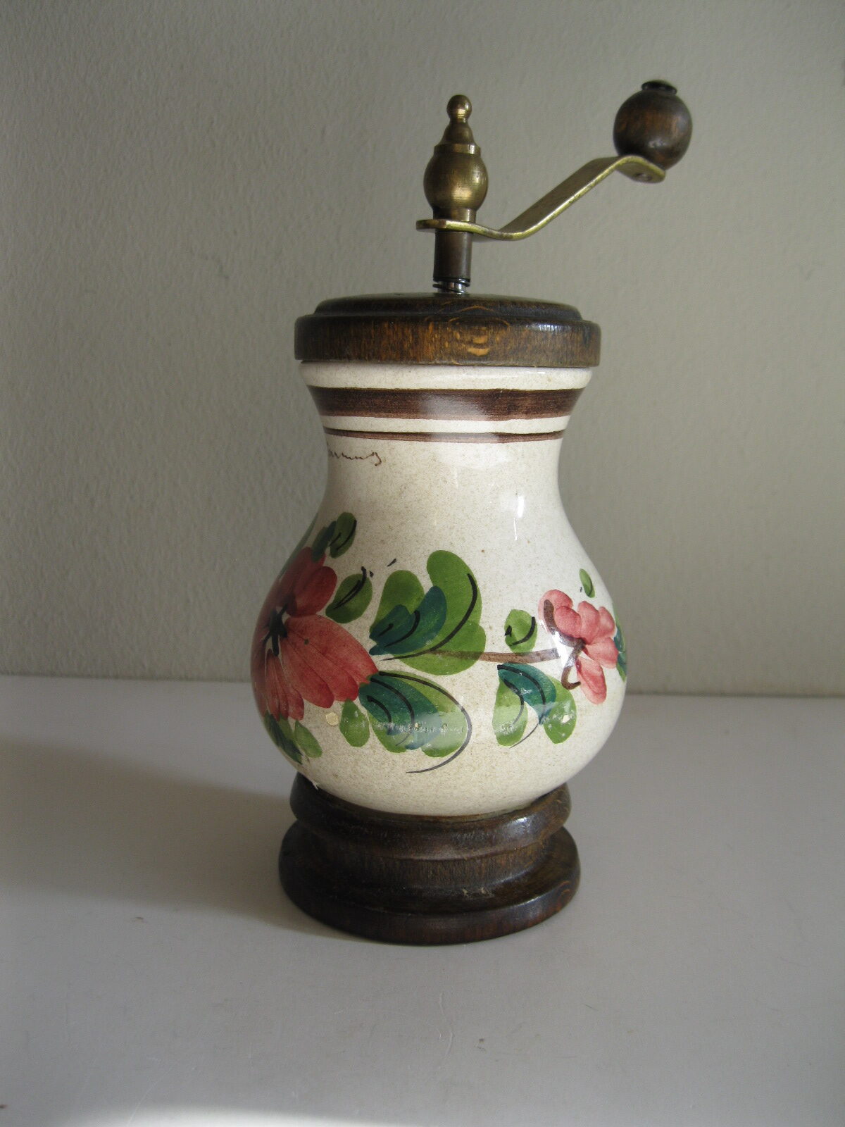 Oryginalny, stary, ozdobny, ceramiczny, kolekcjonerski młynek do mielenia pieprzu. Wykonany z ceramiki w połączeniu z naturalnym drewnem. Brzusiec młynka zdobiony malaturą w różowe kwiaty. Mechanizm mielący, metalowy, czysty, sprawny, używany, młynek mielił tylko pieprz. Zachowany w stanie bardzo dobrym jak na upływ czasu, niewielkie, nieliczne odpryski szkliwa bez znaczenia na urodę jak i użytkowanie. Polecam !