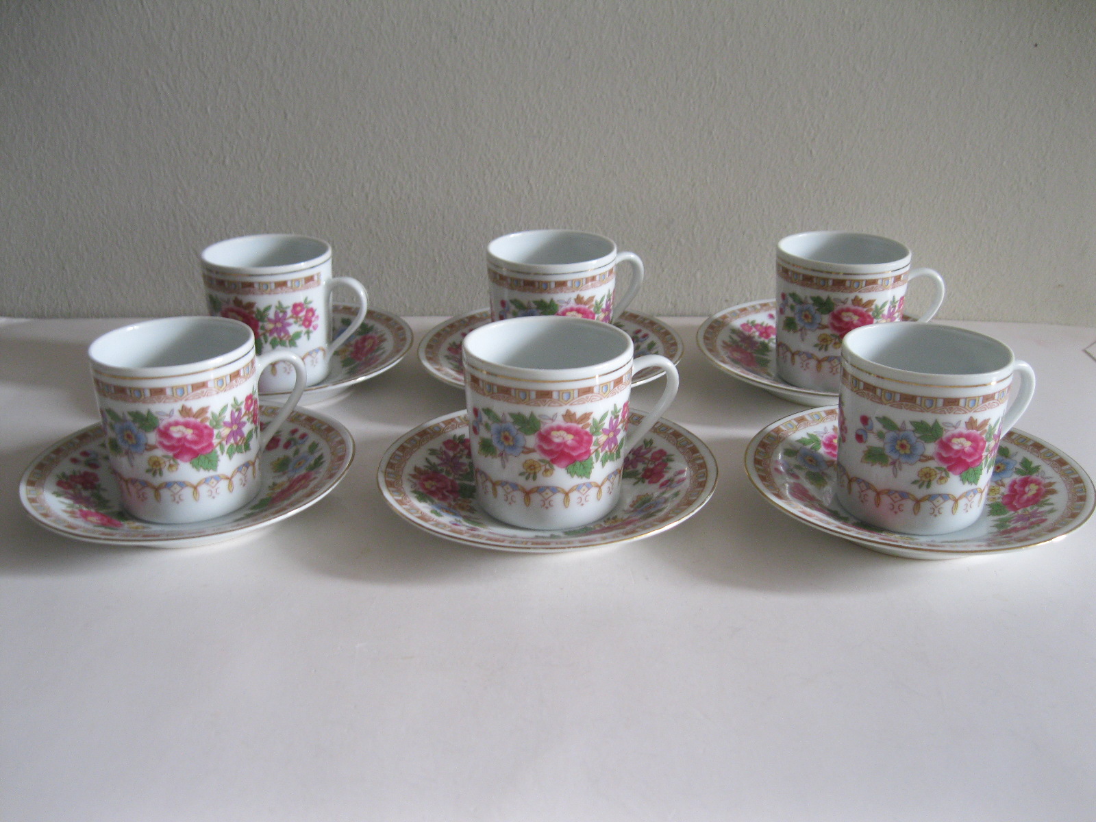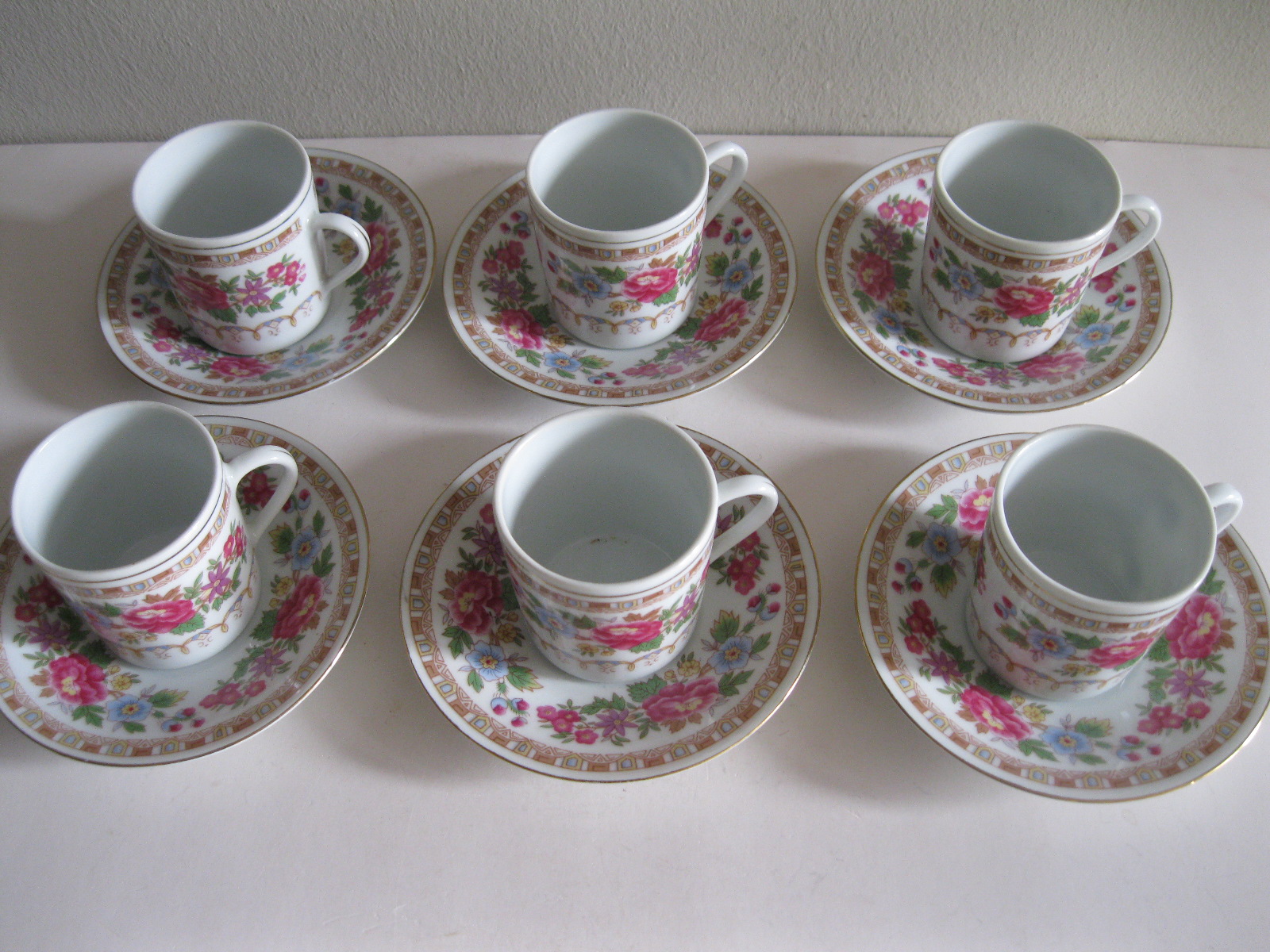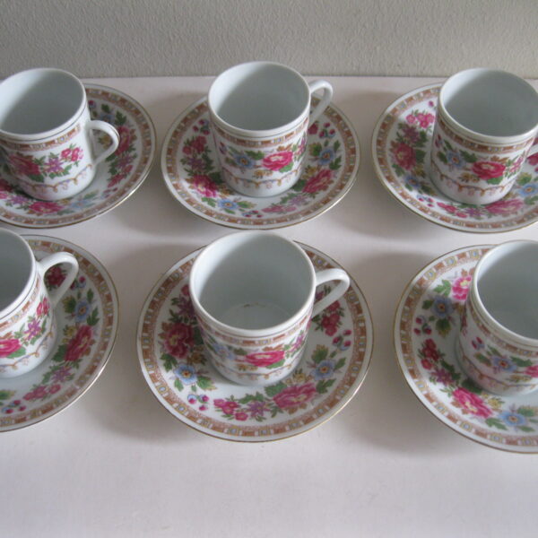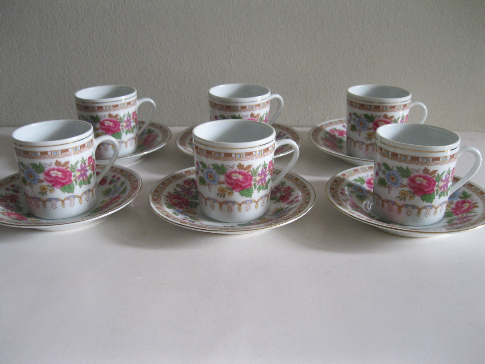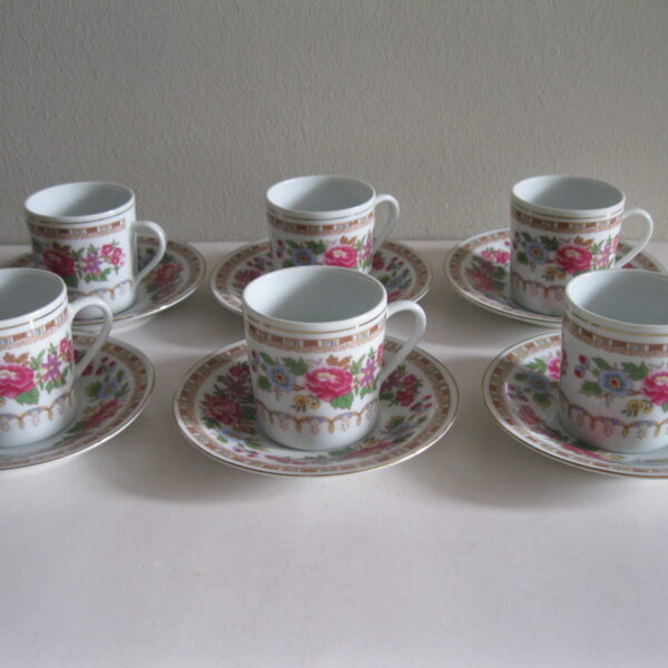 Oryginalny, stary, chiński serwis kawowy do mokki z lat 70 tych. Komplet 6 sztuk. Wykonany z doskonałej jakości, wysokogatunkowej, delikatnej, białej porcelany zdobiony, subtelnym wzorem kwiatowym w różowe róże i niebieskie kwiaty wykończony złotym paseczkiem.. Bardzo elegancki. W skład serwisu wchodzi 6 kształtnych, małych, doskonale ukształtowanych filiżanek o wysokości 5,8 cm i średnicy 4,8 cm, 6 podstawków o średnicy 11,5 cm. Cały komplet zachowany w stanie bardzo dobrym, brak śladów użytkowych. Sygnowany starą chińską sygnaturą. Polecam !