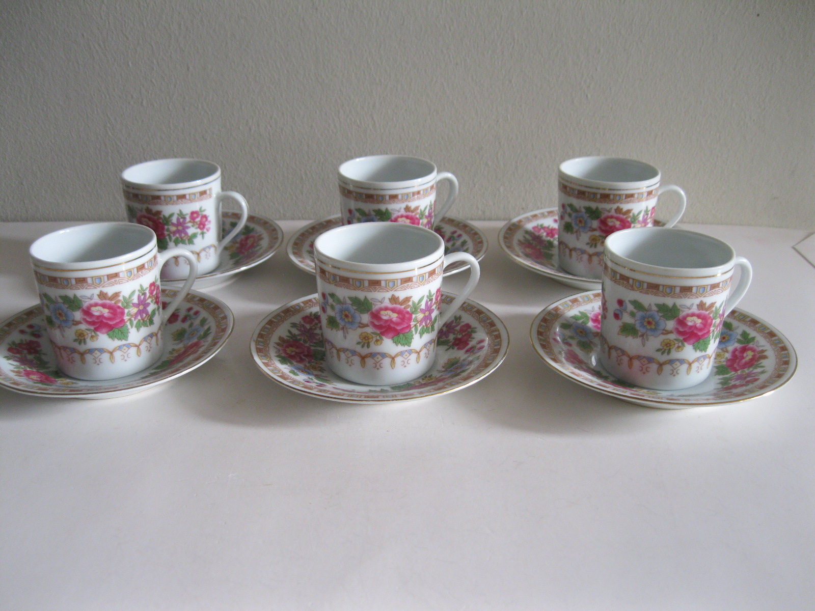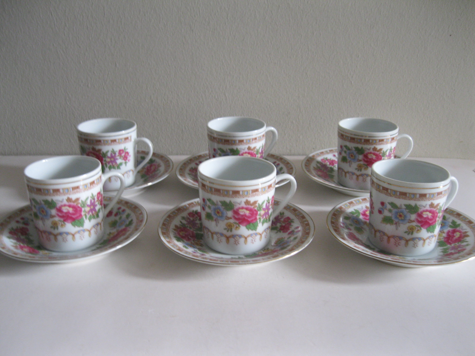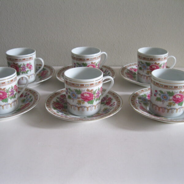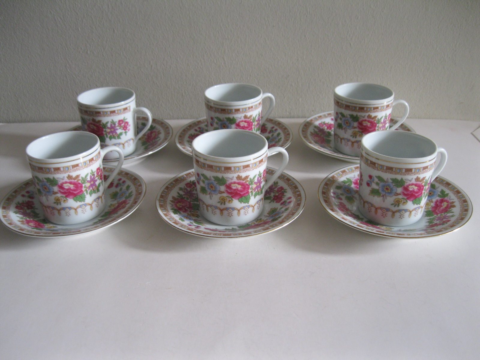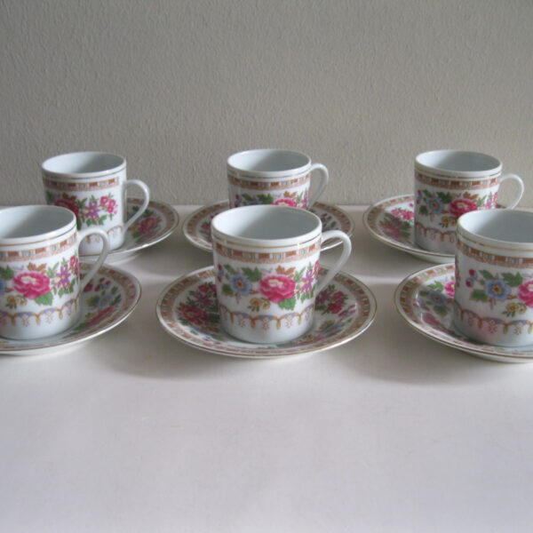 Oryginalny, stary, chiński serwis kawowy do mokki z lat 70 tych. Komplet 6 sztuk. Wykonany z doskonałej jakości, wysokogatunkowej, delikatnej, białej porcelany zdobiony, subtelnym wzorem kwiatowym w różowe róże i niebieskie kwiaty wykończony złotym paseczkiem.. Bardzo elegancki. W skład serwisu wchodzi 6 kształtnych, małych, doskonale ukształtowanych filiżanek o wysokości 5,8 cm i średnicy 4,8 cm, 6 podstawków o średnicy 11,5 cm. Cały komplet zachowany w stanie bardzo dobrym, brak śladów użytkowych. Sygnowany starą chińską sygnaturą. Polecam !