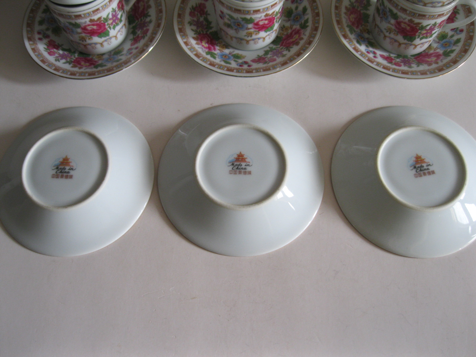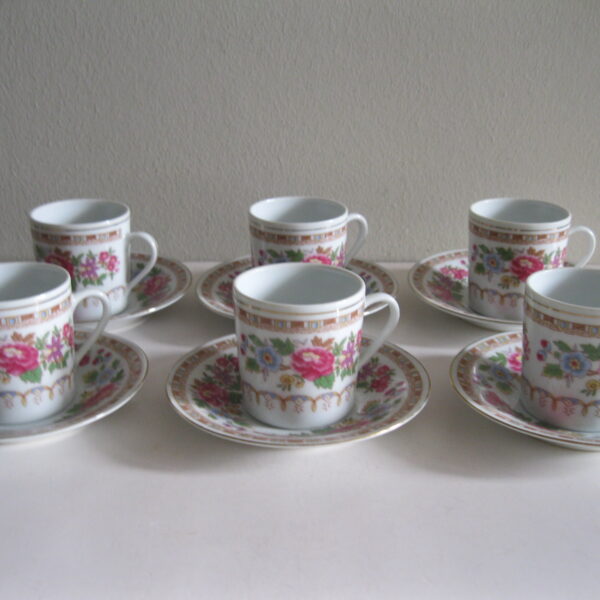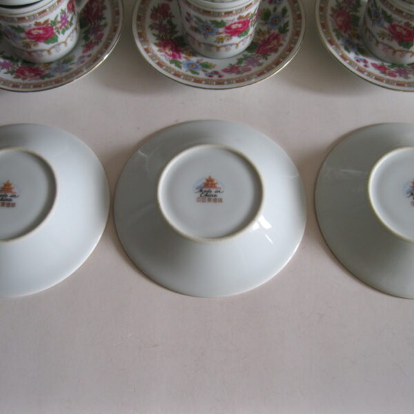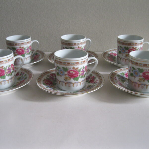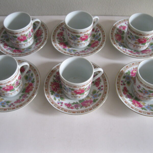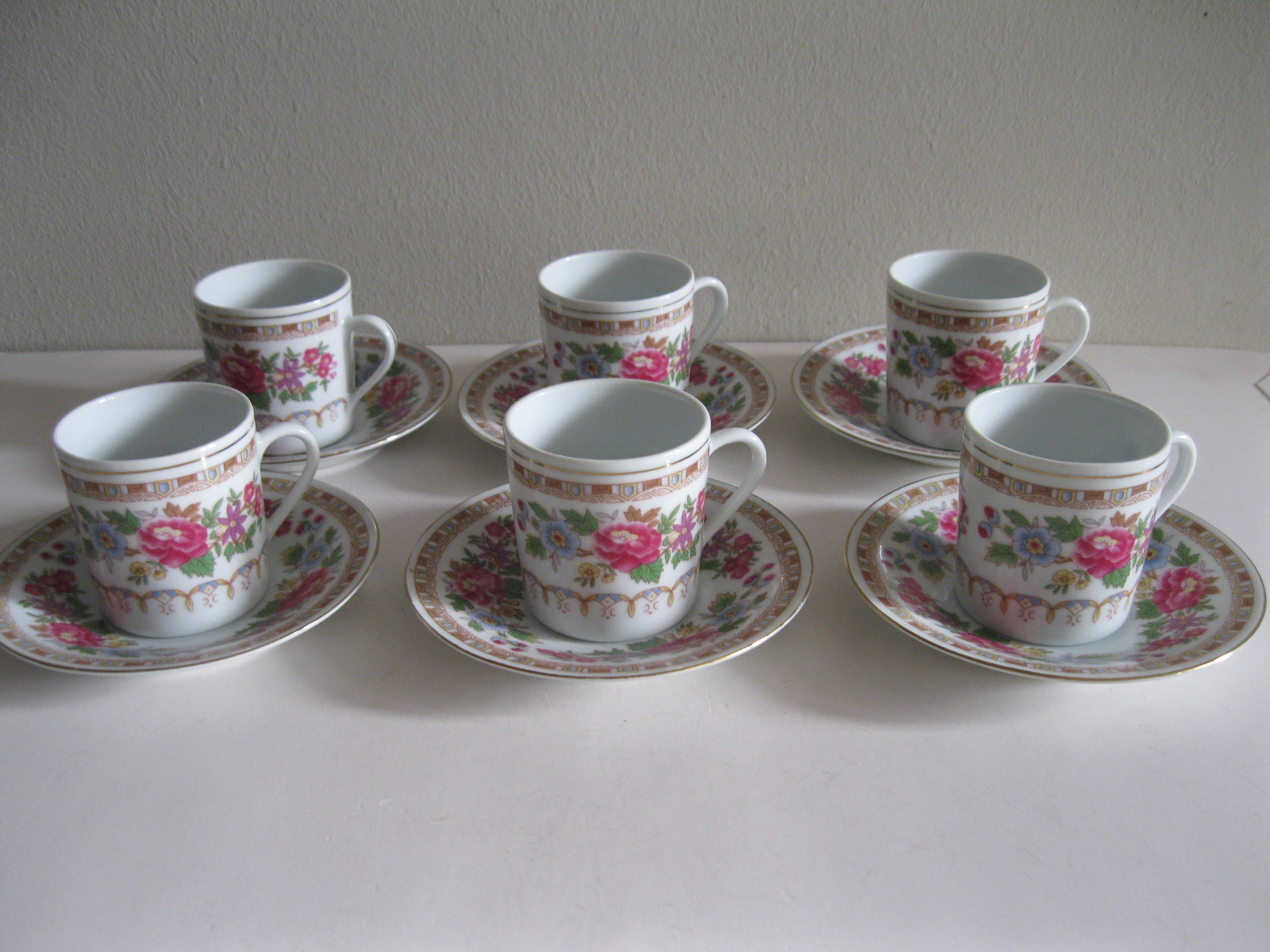 Oryginalny, stary, chiński serwis kawowy do mokki z lat 70 tych. Komplet 6 sztuk. Wykonany z doskonałej jakości, wysokogatunkowej, delikatnej, białej porcelany zdobiony, subtelnym wzorem kwiatowym w różowe róże i niebieskie kwiaty wykończony złotym paseczkiem.. Bardzo elegancki. W skład serwisu wchodzi 6 kształtnych, małych, doskonale ukształtowanych filiżanek o wysokości 5,8 cm i średnicy 4,8 cm, 6 podstawków o średnicy 11,5 cm. Cały komplet zachowany w stanie bardzo dobrym, brak śladów użytkowych. Sygnowany starą chińską sygnaturą. Polecam !