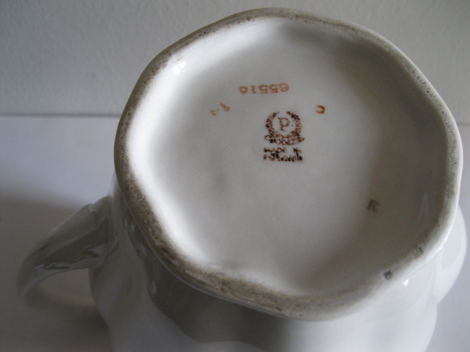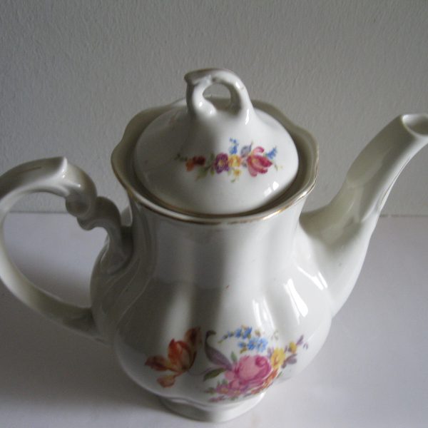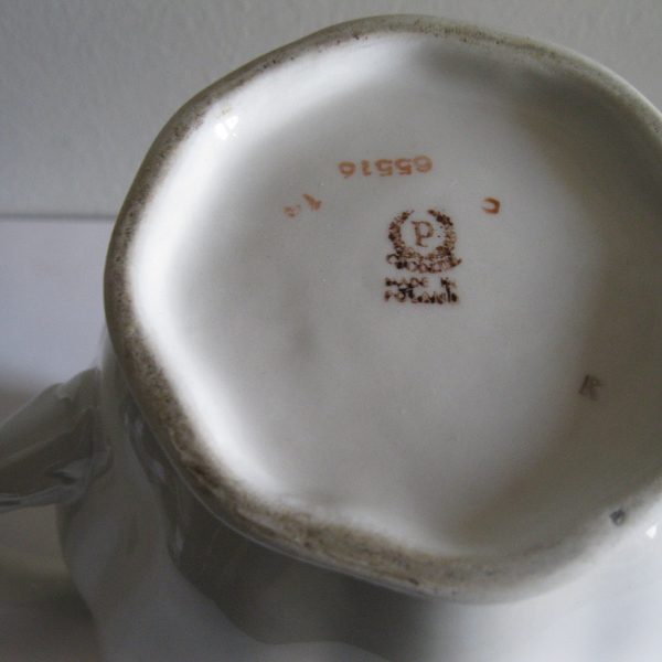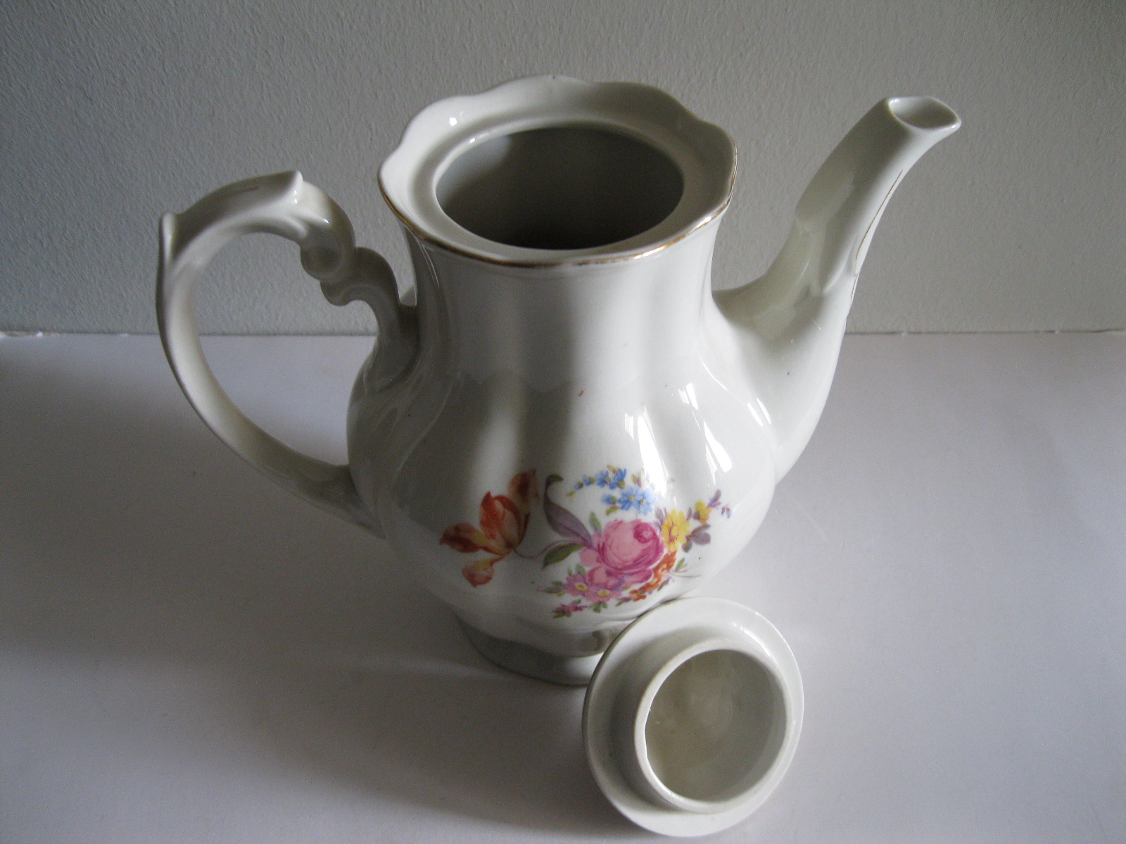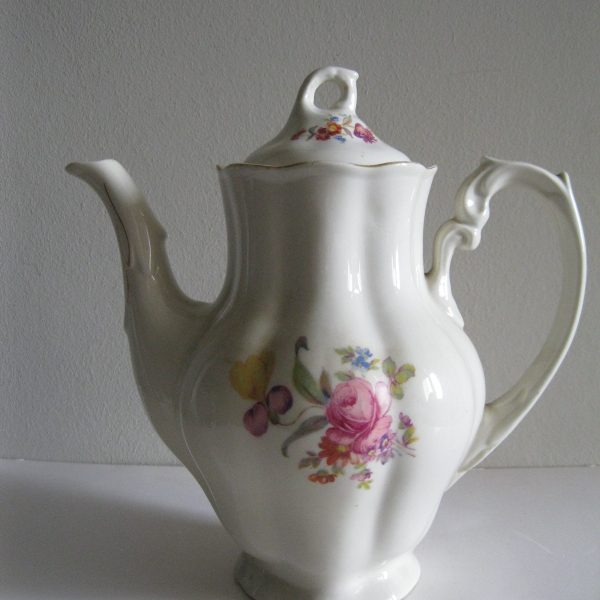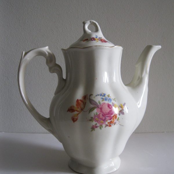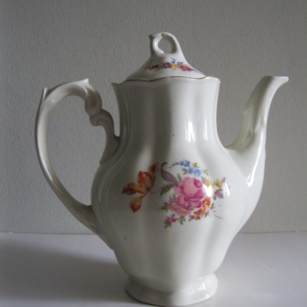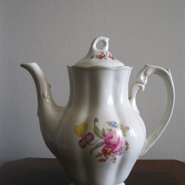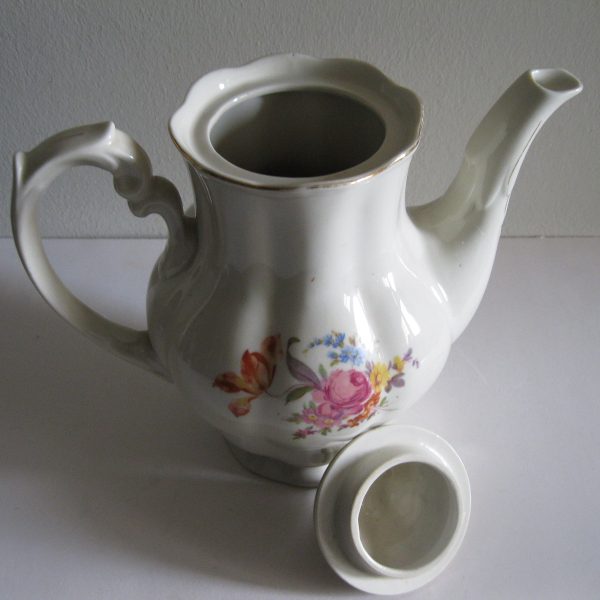 Oryginalny, stary, porcelanowy, kształtny, duży, pojemny, pękaty dzbanek Chodzież z lat 60 tych. Wykonany z bardzo dobrej jakości, delikatnej porcelany w subtelnym kolorze ecru , zdobiony ślicznym, wzorem kwiatowym w róże i wykończony złoceniem, bardzo dobrze szkliwiony. Sygnowany starą sygnaturą fabryki i numerowany. Zachowany w stanie bardzo dobrym; cały bez uszkodzeń. W pełni użytkowy i dekoracyjny. Polecam !