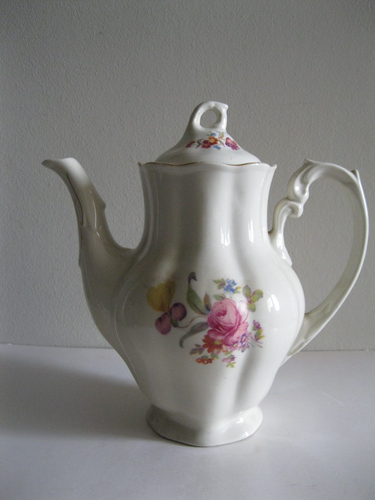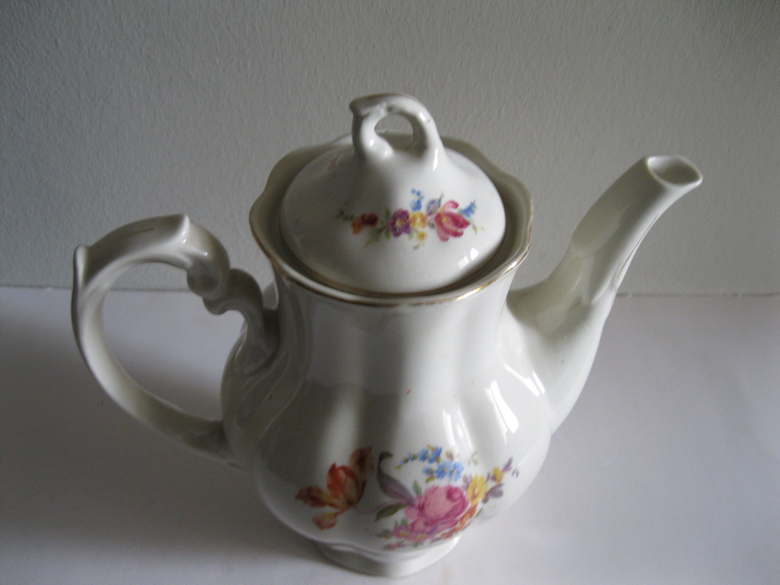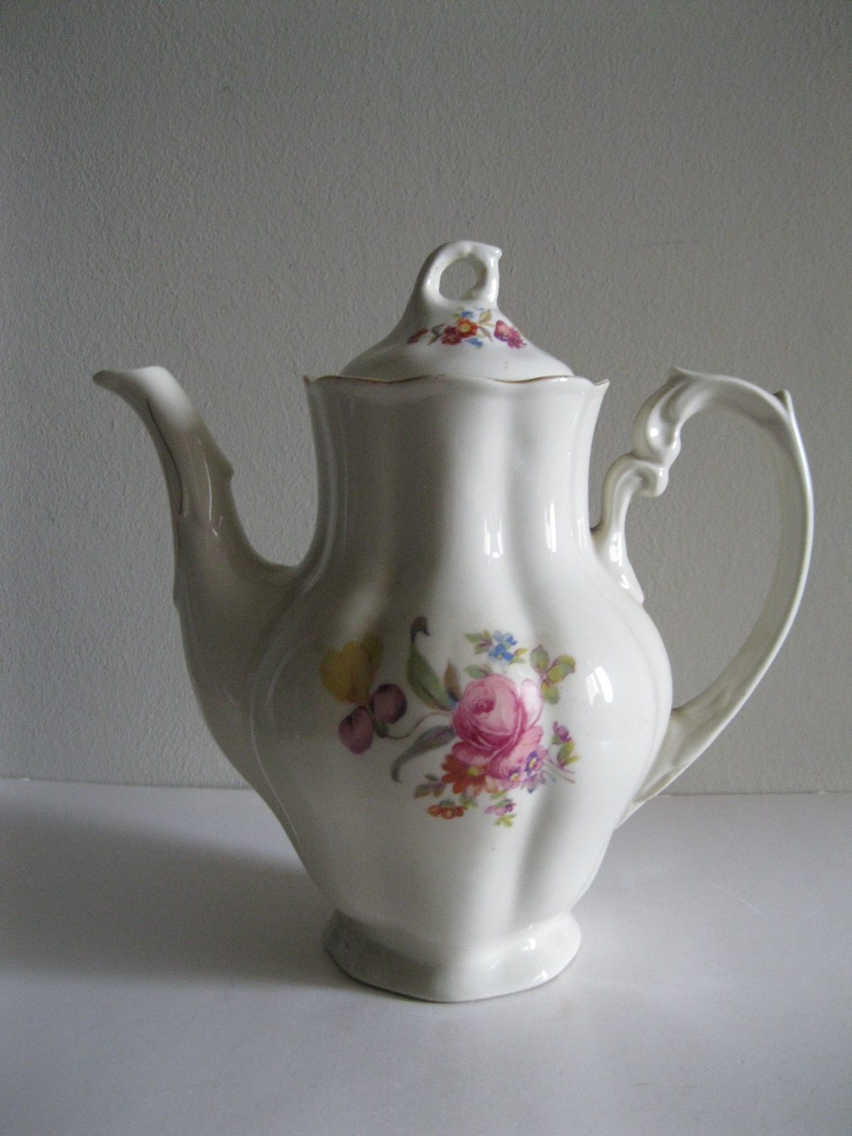 Oryginalny, stary, porcelanowy, kształtny, duży, pojemny, pękaty dzbanek Chodzież z lat 60 tych. Wykonany z bardzo dobrej jakości, delikatnej porcelany w subtelnym kolorze ecru , zdobiony ślicznym, wzorem kwiatowym w róże i wykończony złoceniem, bardzo dobrze szkliwiony. Sygnowany starą sygnaturą fabryki i numerowany. Zachowany w stanie bardzo dobrym; cały bez uszkodzeń. W pełni użytkowy i dekoracyjny. Polecam !