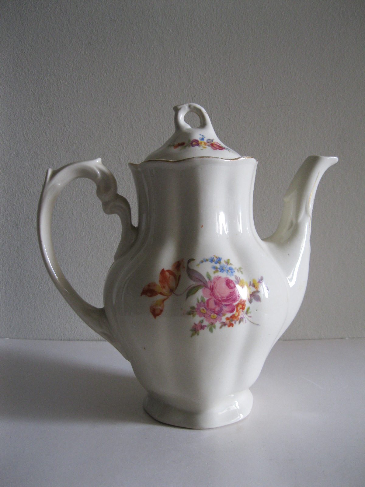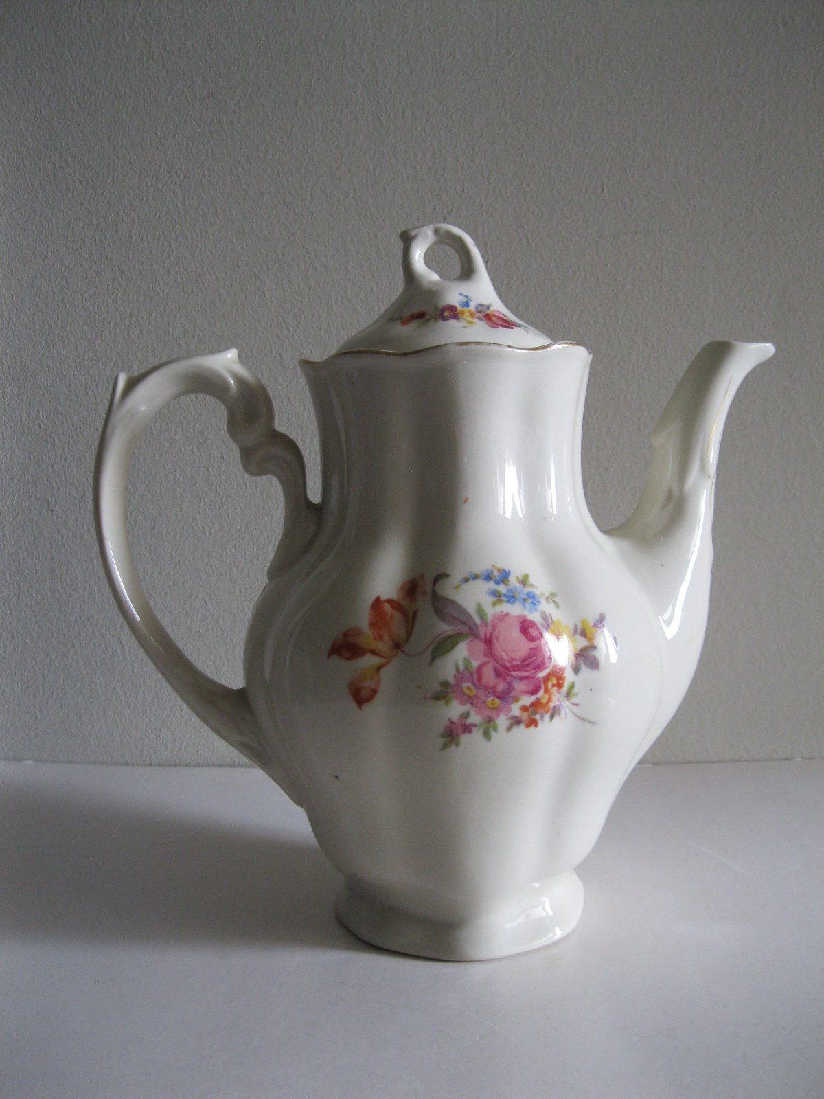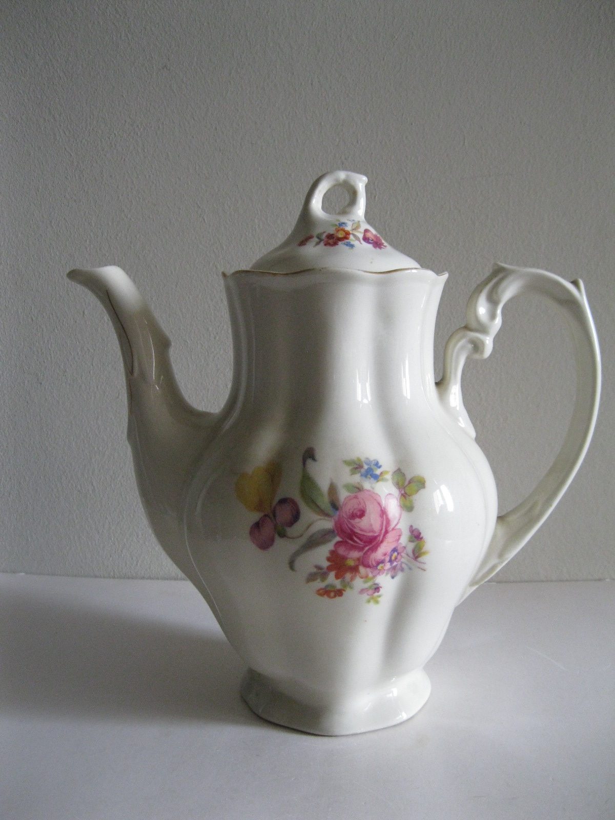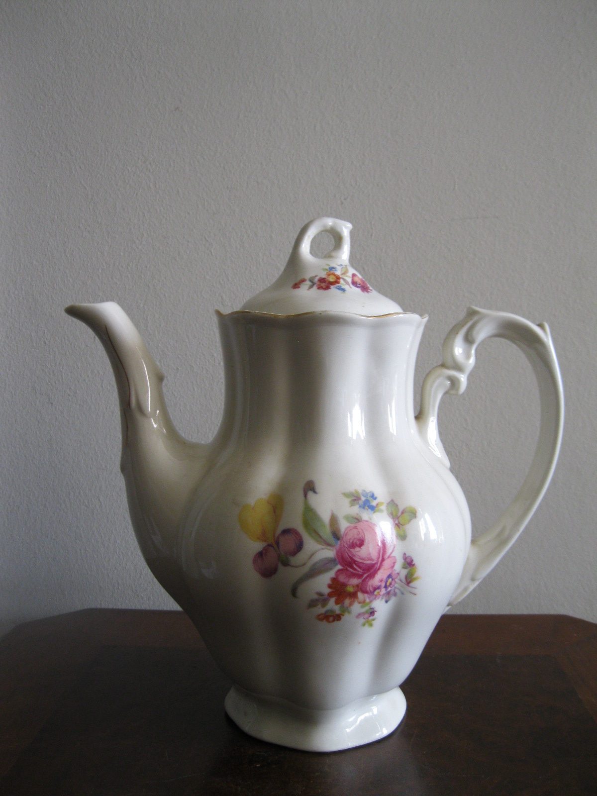 Oryginalny, stary, porcelanowy, kształtny, duży, pojemny, pękaty dzbanek Chodzież z lat 60 tych. Wykonany z bardzo dobrej jakości, delikatnej porcelany w subtelnym kolorze ecru , zdobiony ślicznym, wzorem kwiatowym w róże i wykończony złoceniem, bardzo dobrze szkliwiony. Sygnowany starą sygnaturą fabryki i numerowany. Zachowany w stanie bardzo dobrym; cały bez uszkodzeń. W pełni użytkowy i dekoracyjny. Polecam !