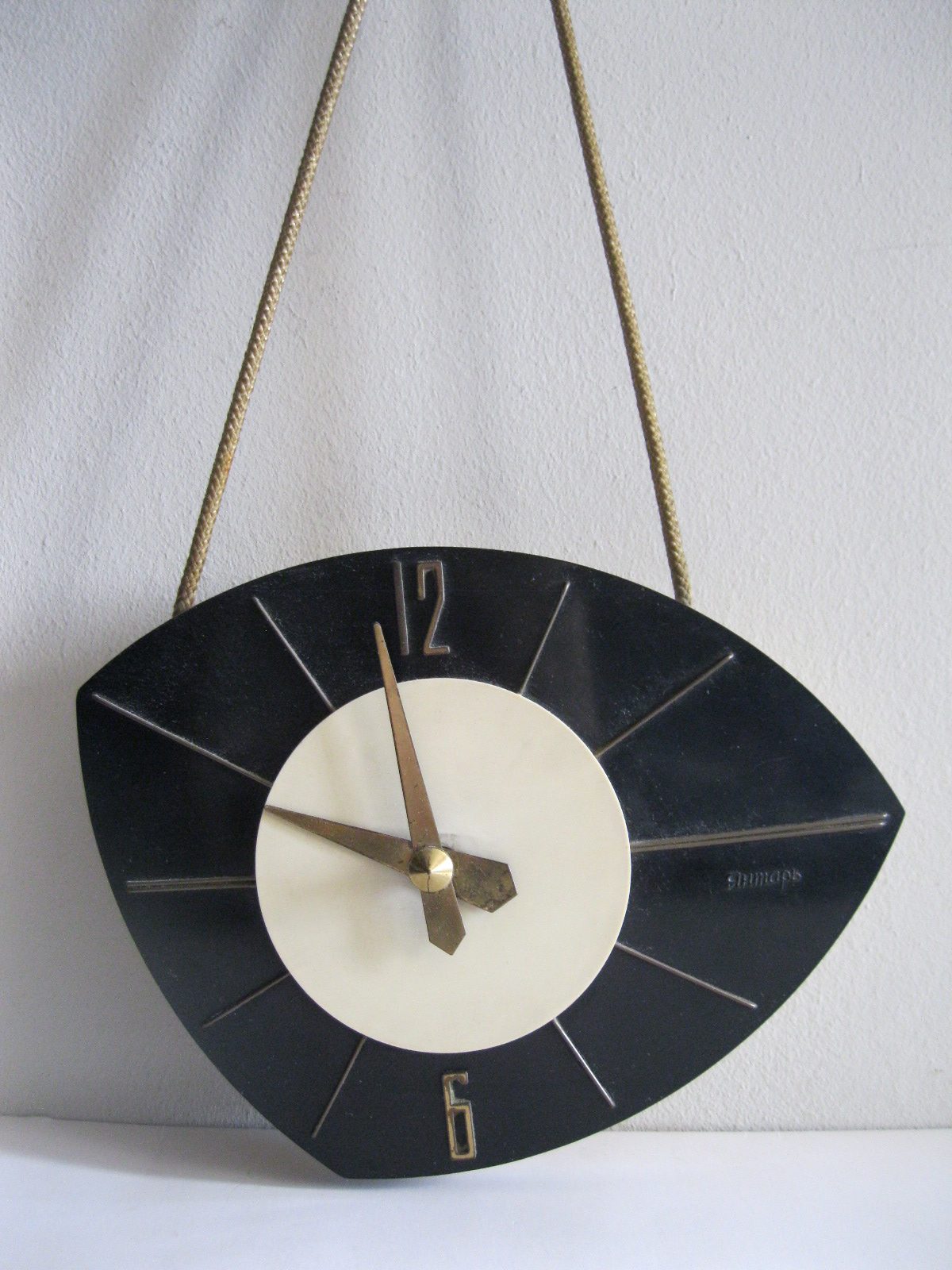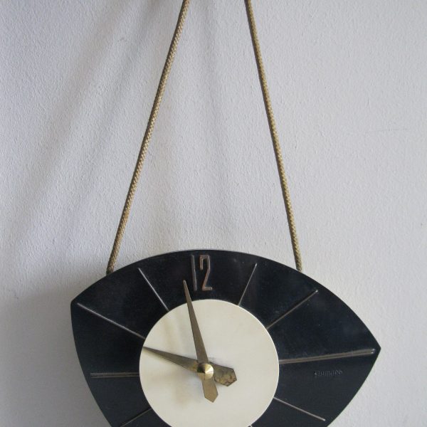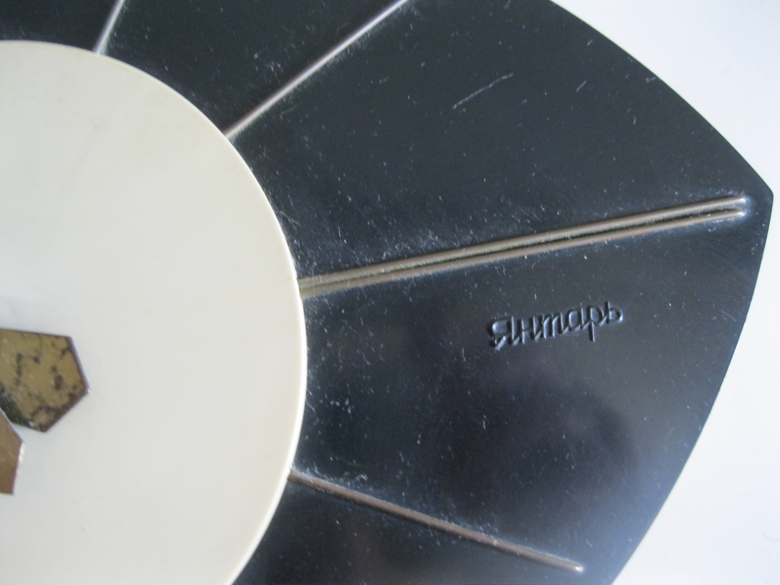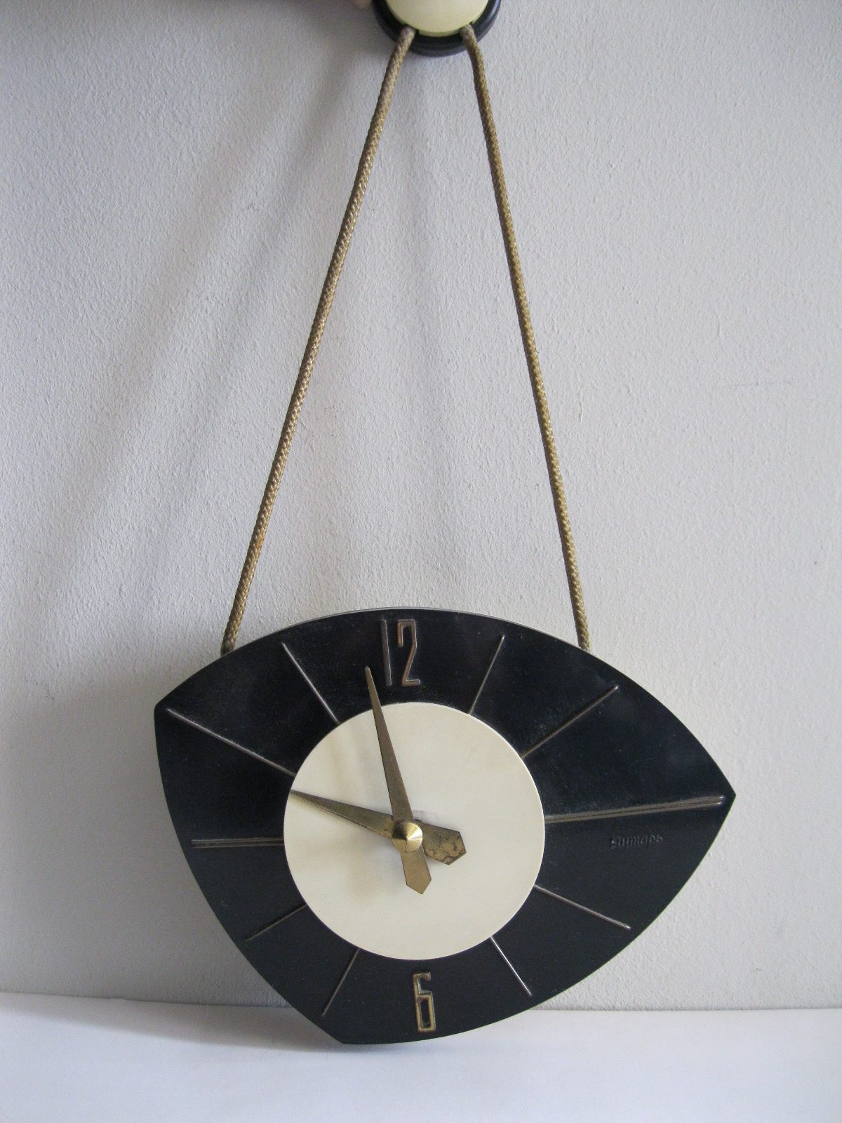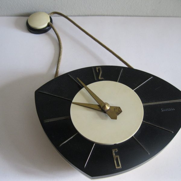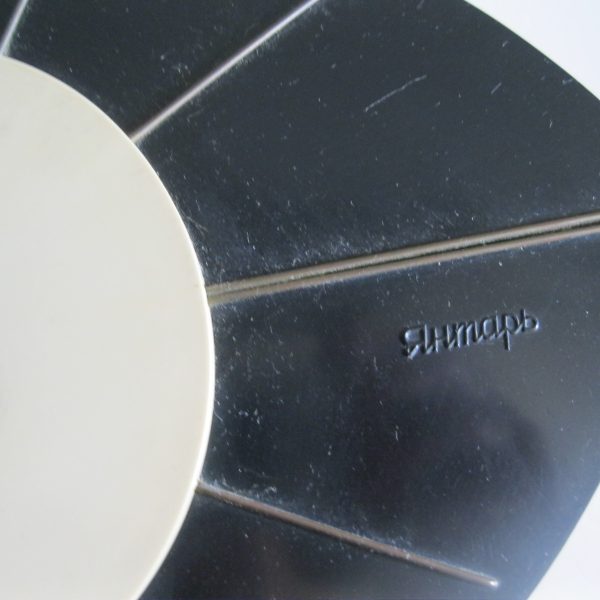 Oryginalny, stary, mechaniczny, awangardowy, rosyjski zegar wiszący art deco Jantar. Modernistyczny czarny, geometryczny cyferblat, wskazówki zegara w złotym kolorze. Zegar wisi na na ozdobnym grubym sznurku. Mocowanie zegara na haczyk w ścianie. Mechanizm zegara jest sprawny. Zegar nakręcany na klucz. Polecam !
