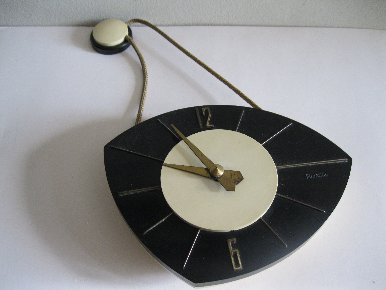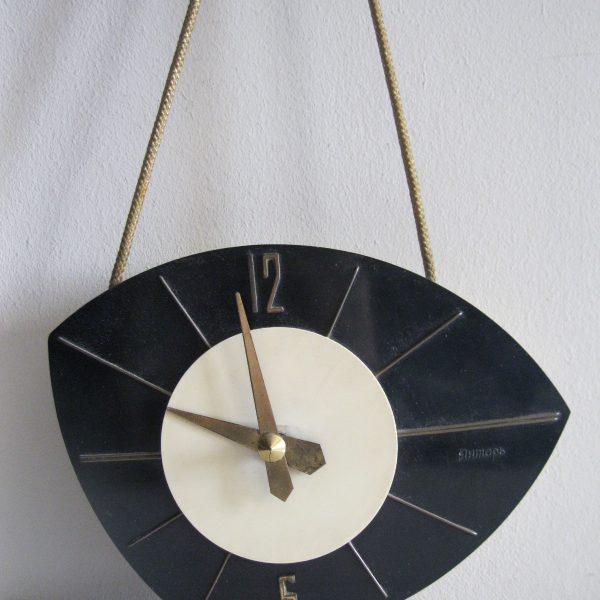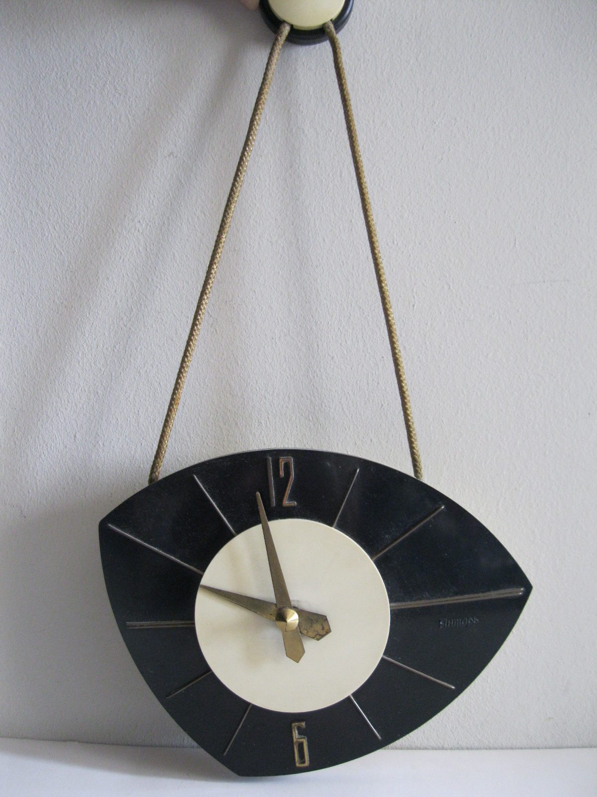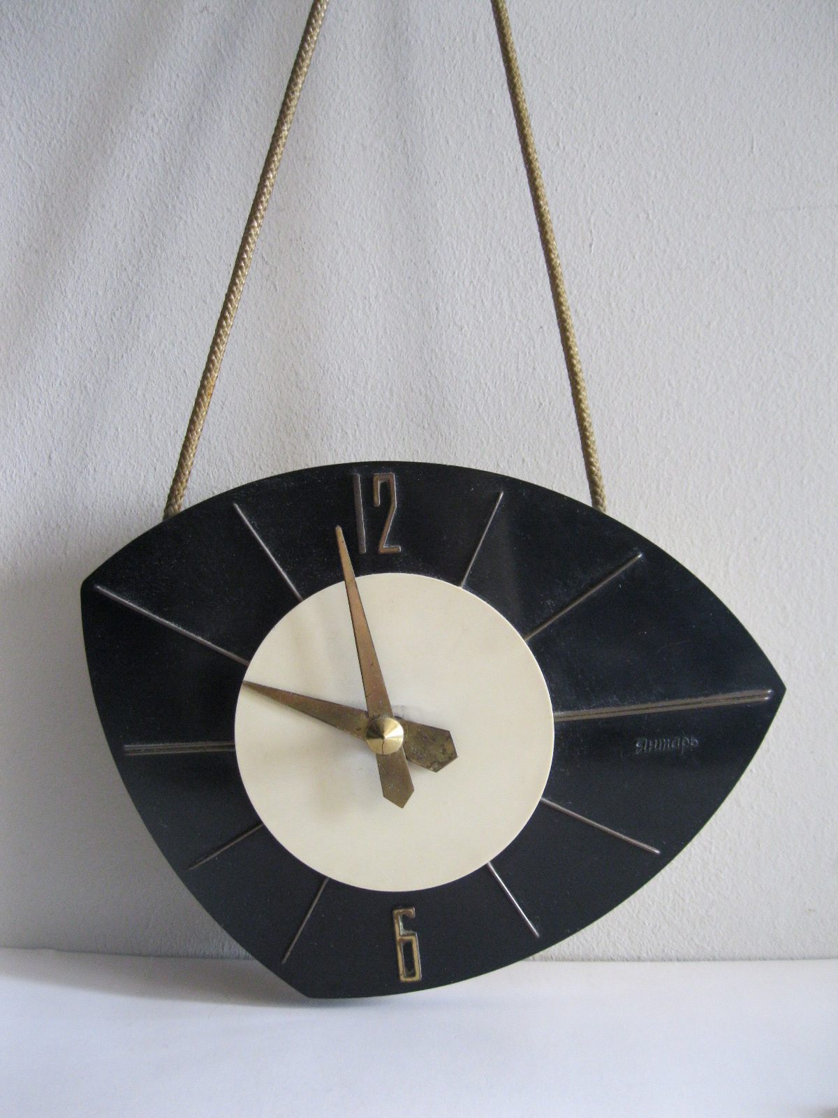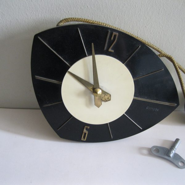 Oryginalny, stary, mechaniczny, awangardowy, rosyjski zegar wiszący art deco Jantar. Modernistyczny czarny, geometryczny cyferblat, wskazówki zegara w złotym kolorze. Zegar wisi na na ozdobnym grubym sznurku. Mocowanie zegara na haczyk w ścianie. Mechanizm zegara jest sprawny. Zegar nakręcany na klucz. Polecam !