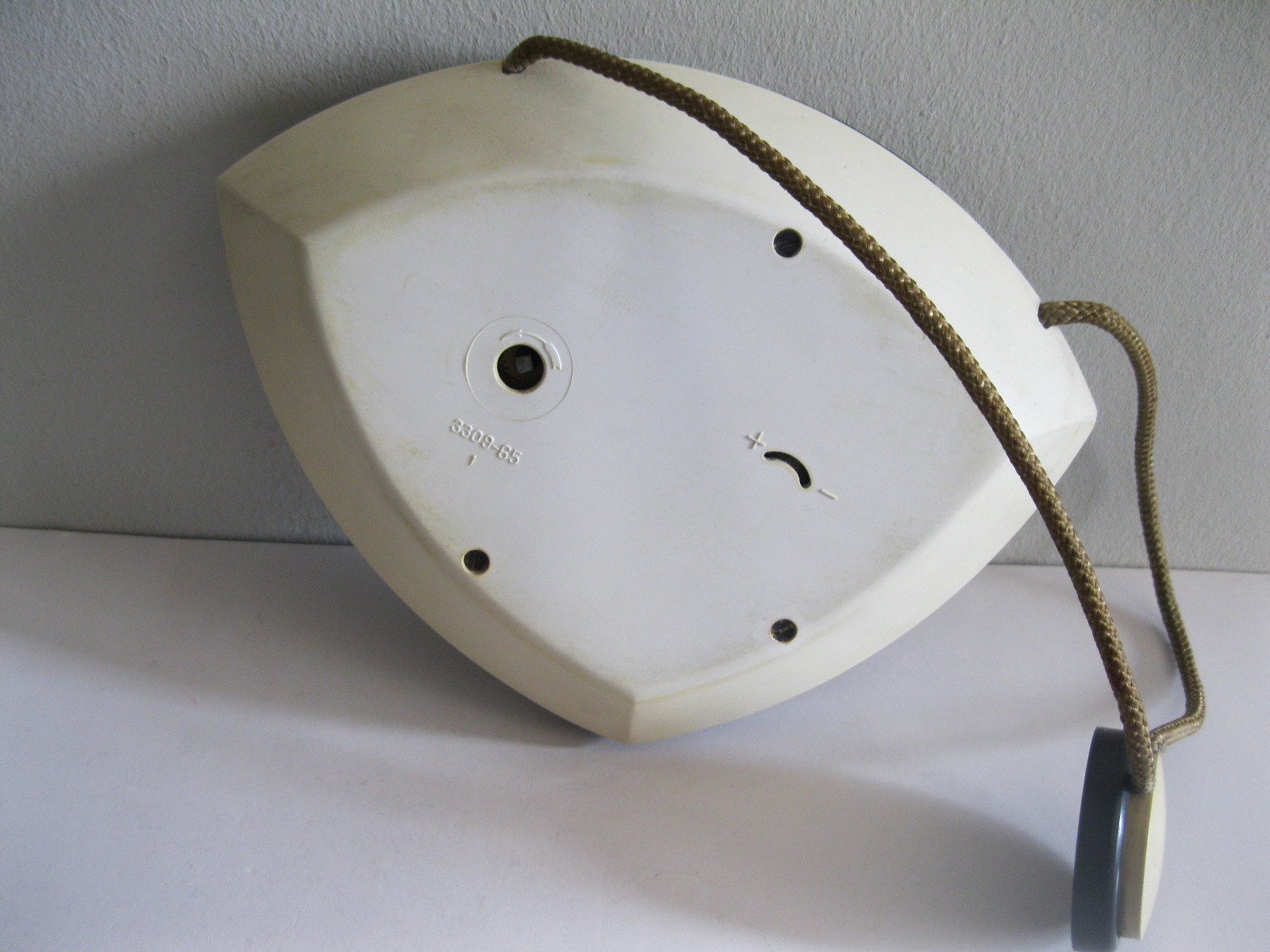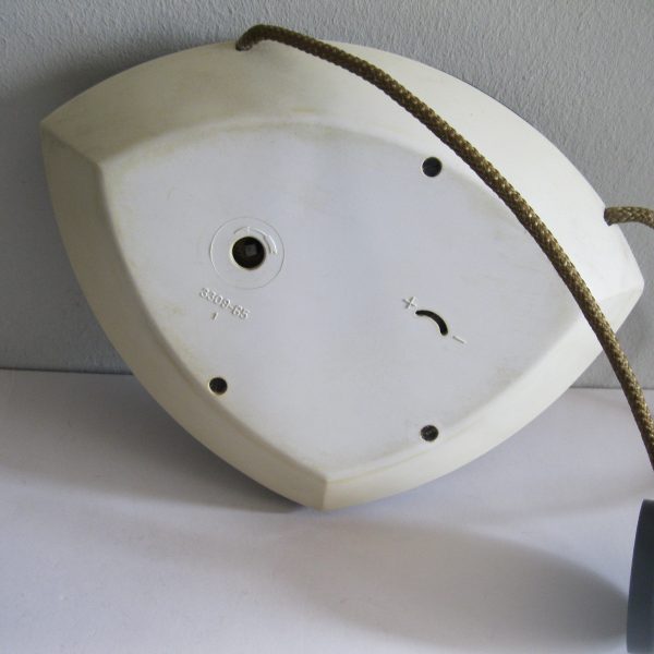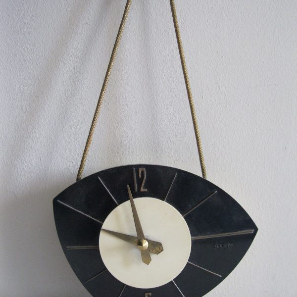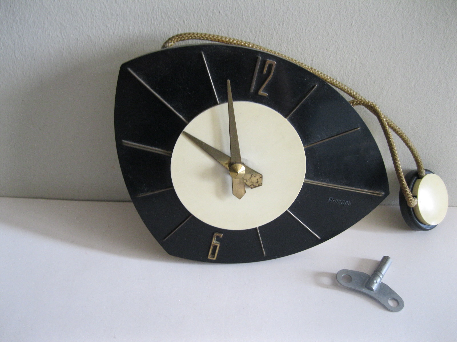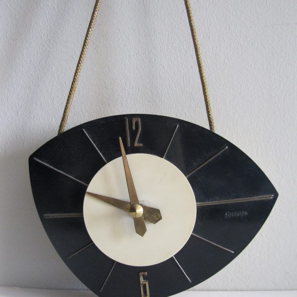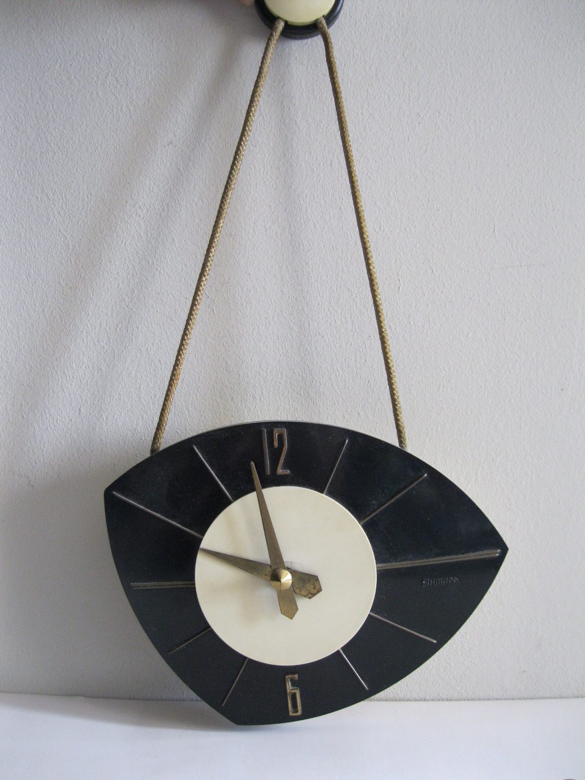 Oryginalny, stary, mechaniczny, awangardowy, rosyjski zegar wiszący art deco Jantar. Modernistyczny czarny, geometryczny cyferblat, wskazówki zegara w złotym kolorze. Zegar wisi na na ozdobnym grubym sznurku. Mocowanie zegara na haczyk w ścianie. Mechanizm zegara jest sprawny. Zegar nakręcany na klucz. Polecam !