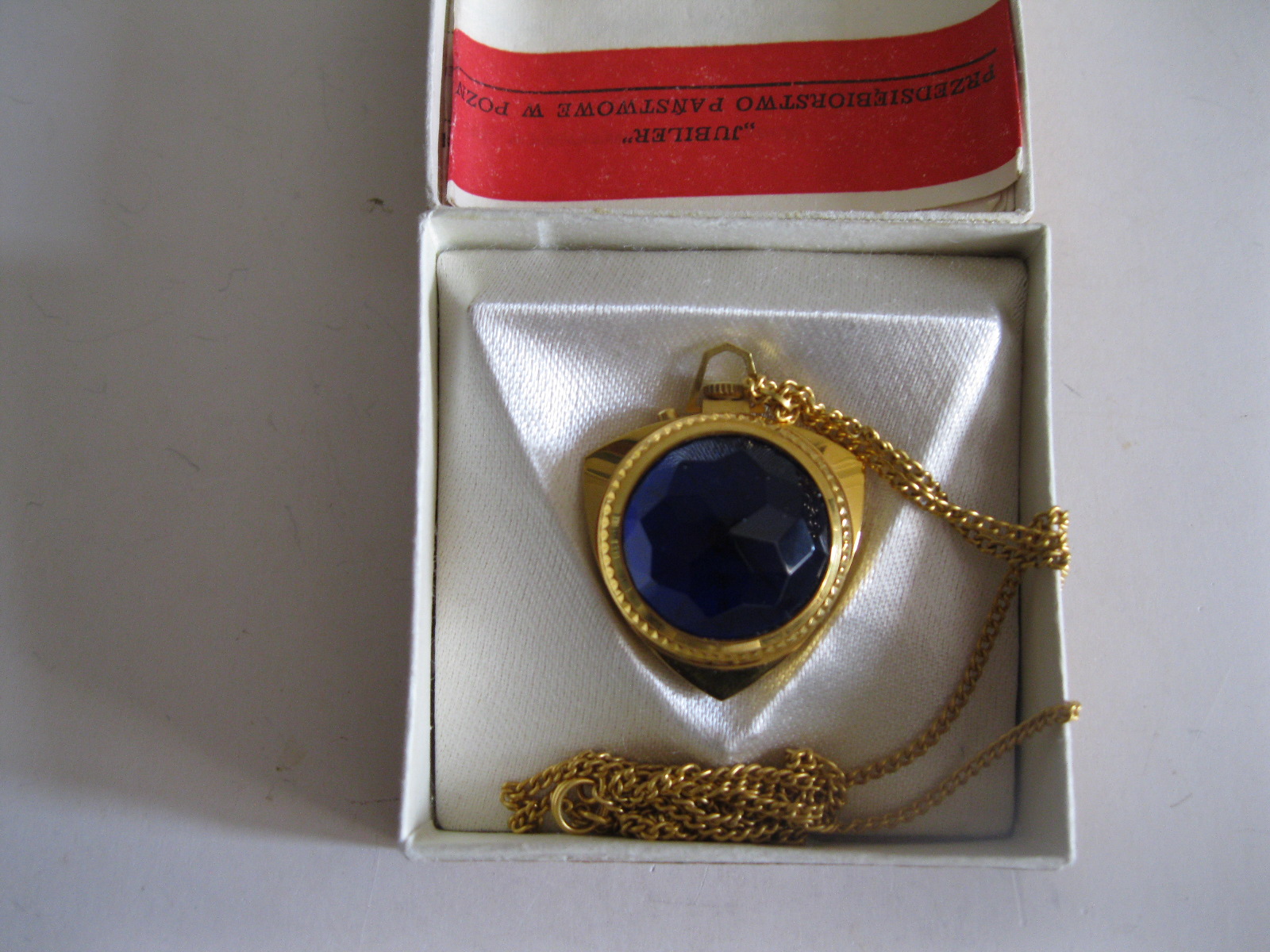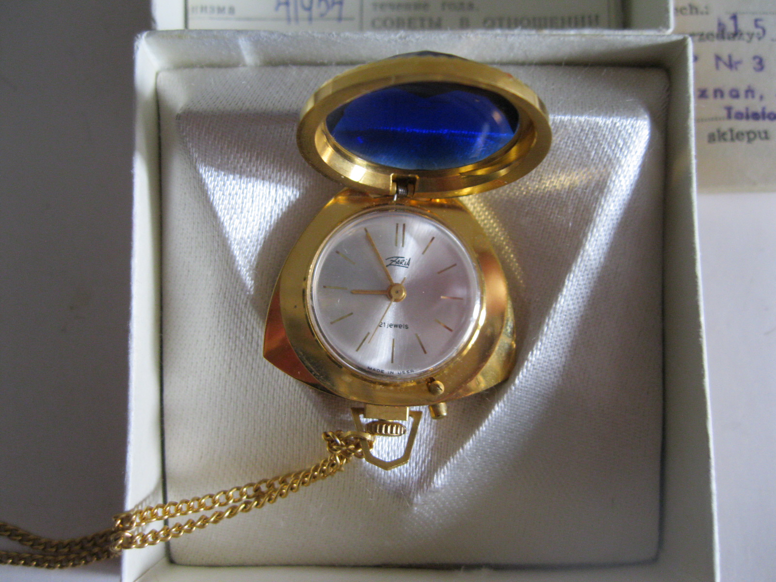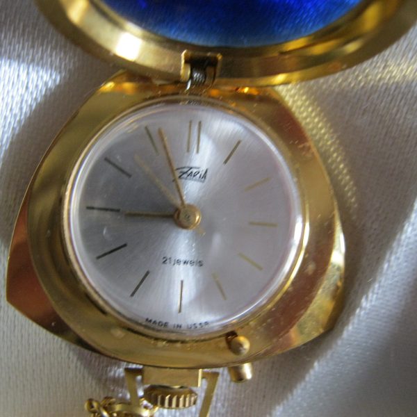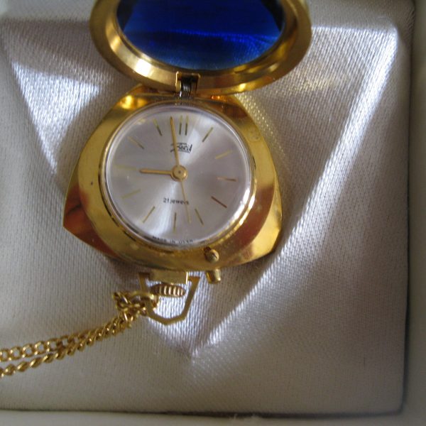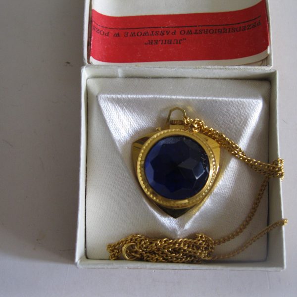 Oryginalny, stary, mechaniczny, zegarek damski wiszący Zoria/ Zaria ZSRR. Zegarek z dużym fioletowym kamieniem, biały cyferblat , wskazówki zegara w złotym kolorze. Zegarek pozłacany w oryginalnym kartoniku z epoki w komplecie z dowodem zakupu. Zegarek nie był używany. Mechanizm zegara jest sprawny, nie był w rękach zegarmistrza, chodzi około doby ale spóźnia się. Polecam !