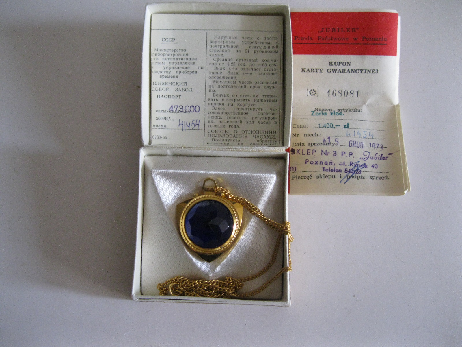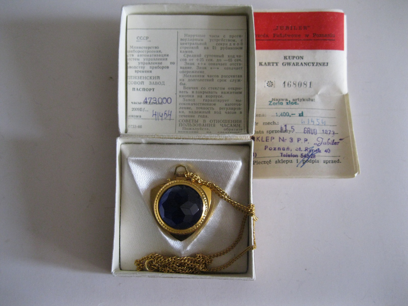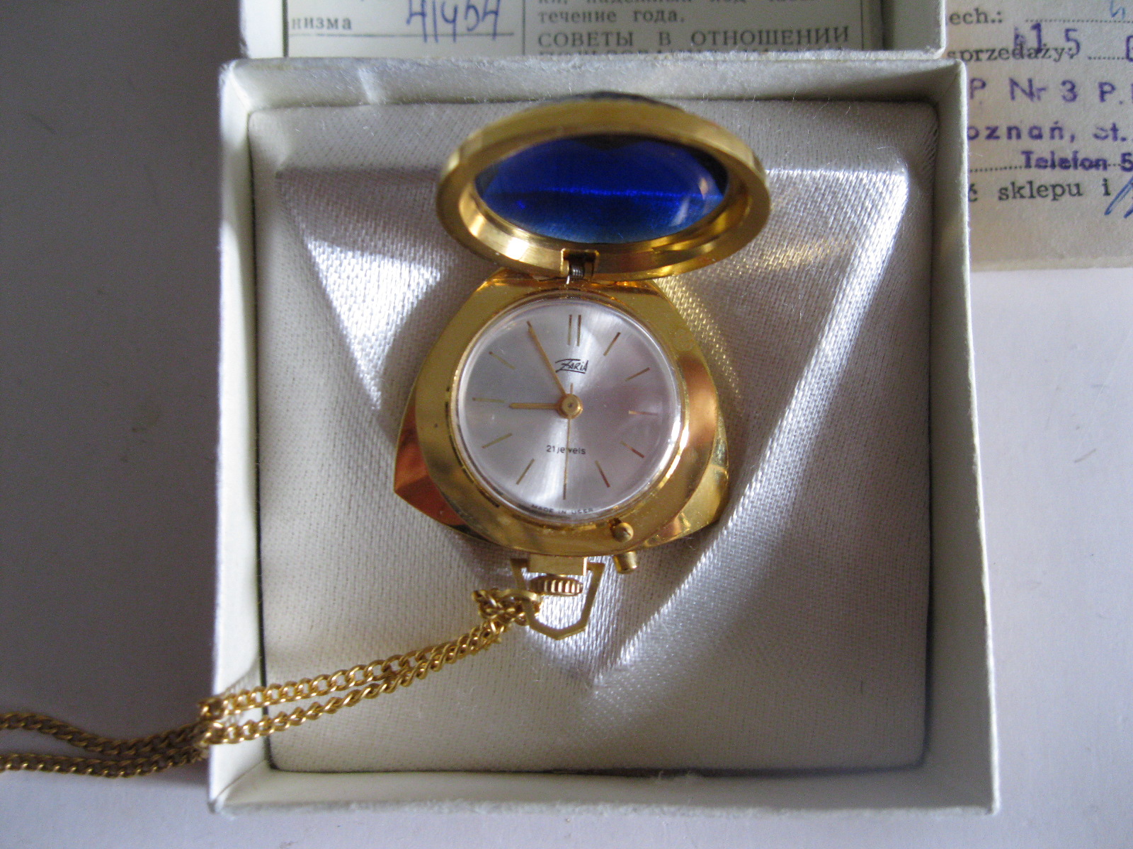 Oryginalny, stary, mechaniczny, zegarek damski wiszący Zoria/ Zaria ZSRR. Zegarek z dużym fioletowym kamieniem, biały cyferblat , wskazówki zegara w złotym kolorze. Zegarek pozłacany w oryginalnym kartoniku z epoki w komplecie z dowodem zakupu. Zegarek nie był używany. Mechanizm zegara jest sprawny, nie był w rękach zegarmistrza, chodzi około doby ale spóźnia się. Polecam !